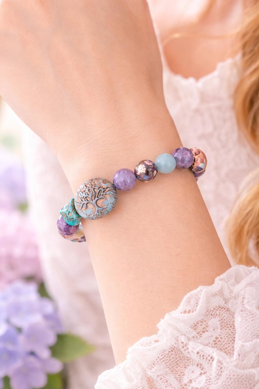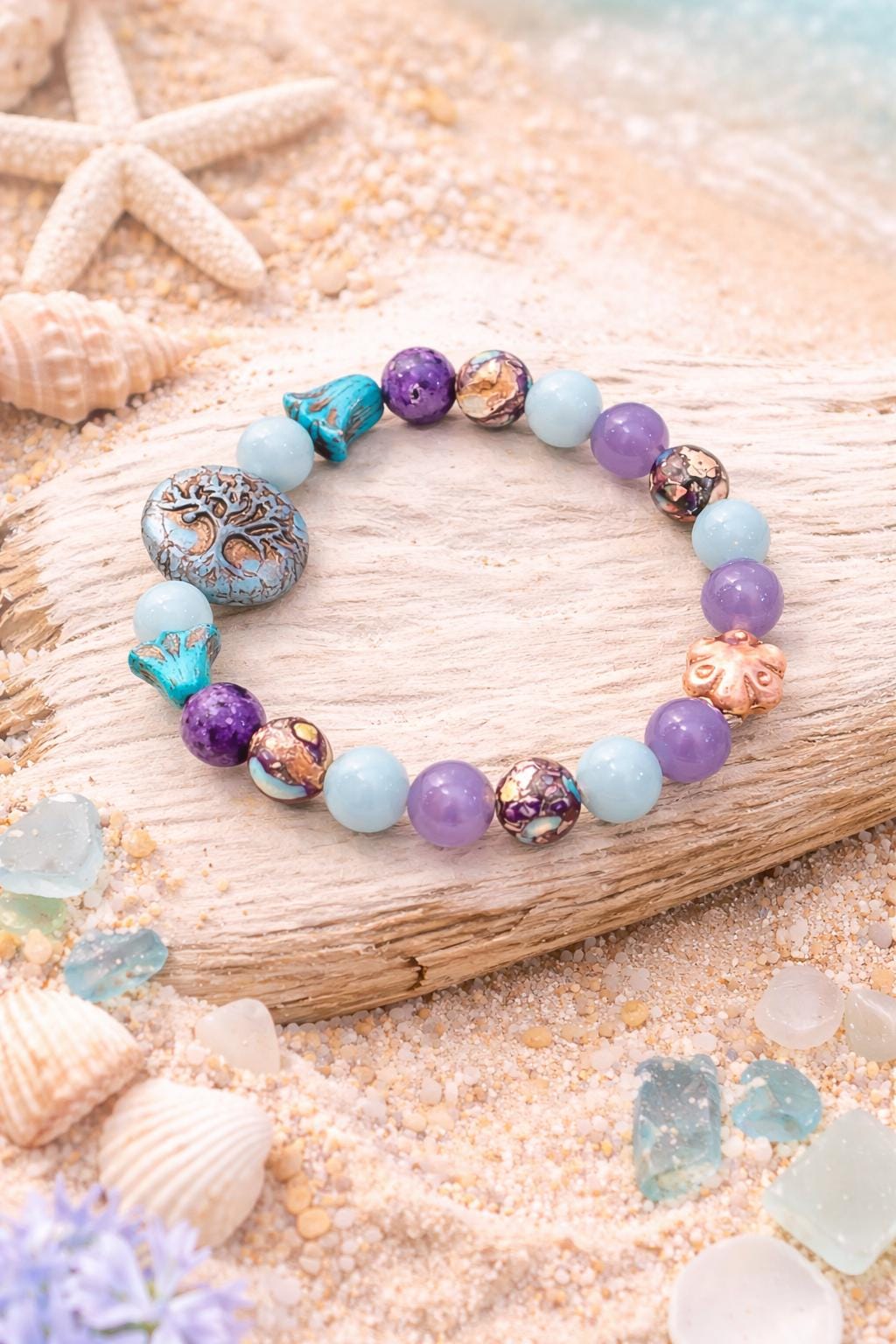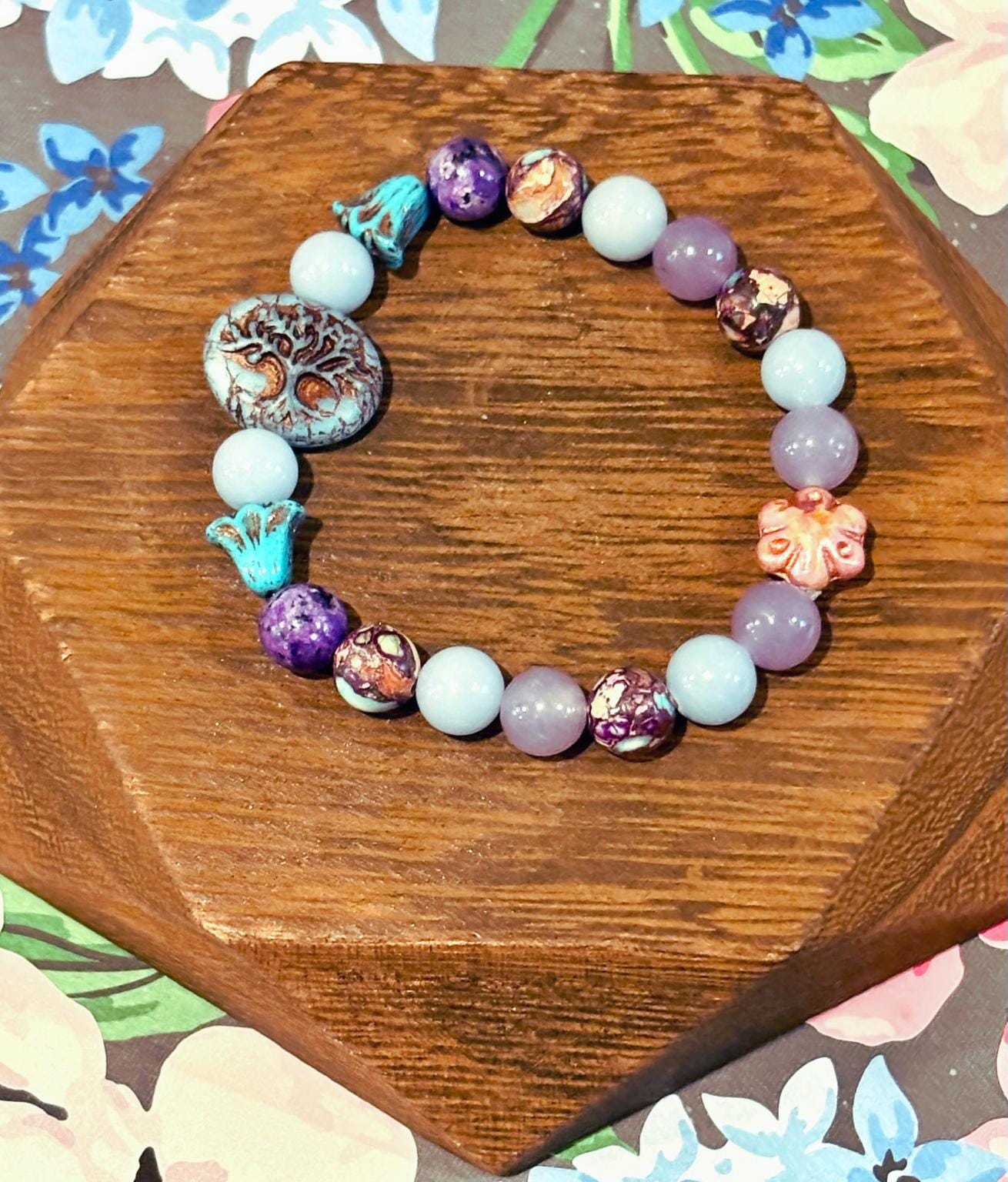 Bella Soul Bloom is a softly powerful bracelet created to honor inner peace, emotional balance, and soulful connection! With calming blues, dreamy purples, and grounding earth tones, this piece blends celestial calm with rooted strength — a wearable reminder to stay gentle with yourself while growing strong.