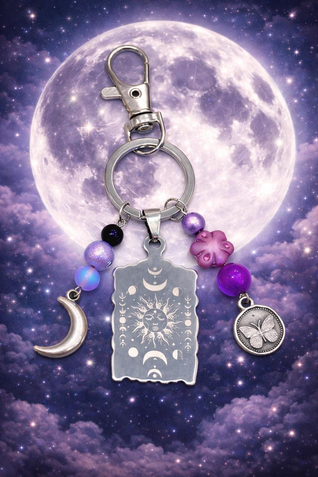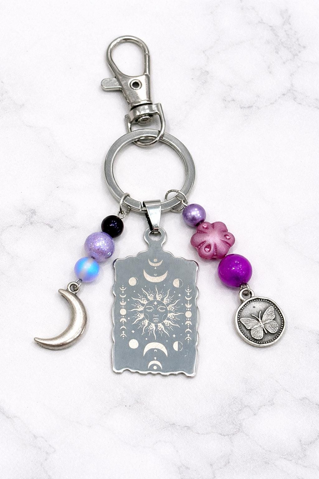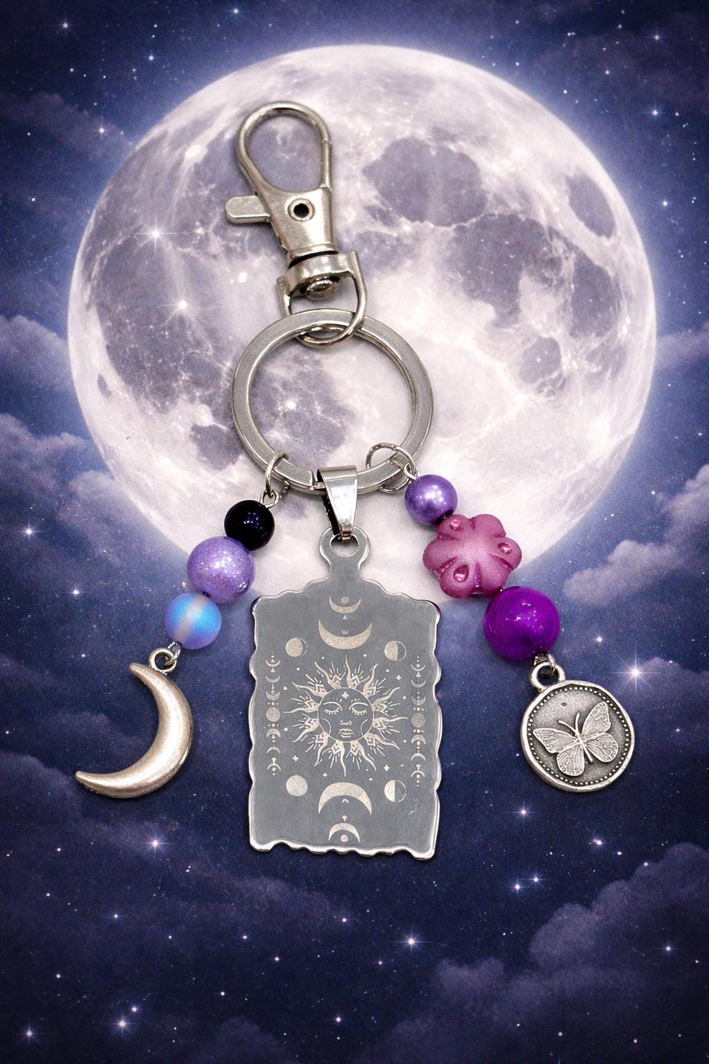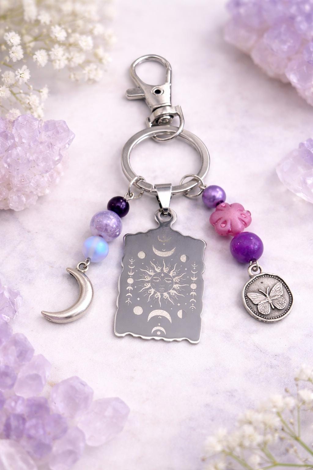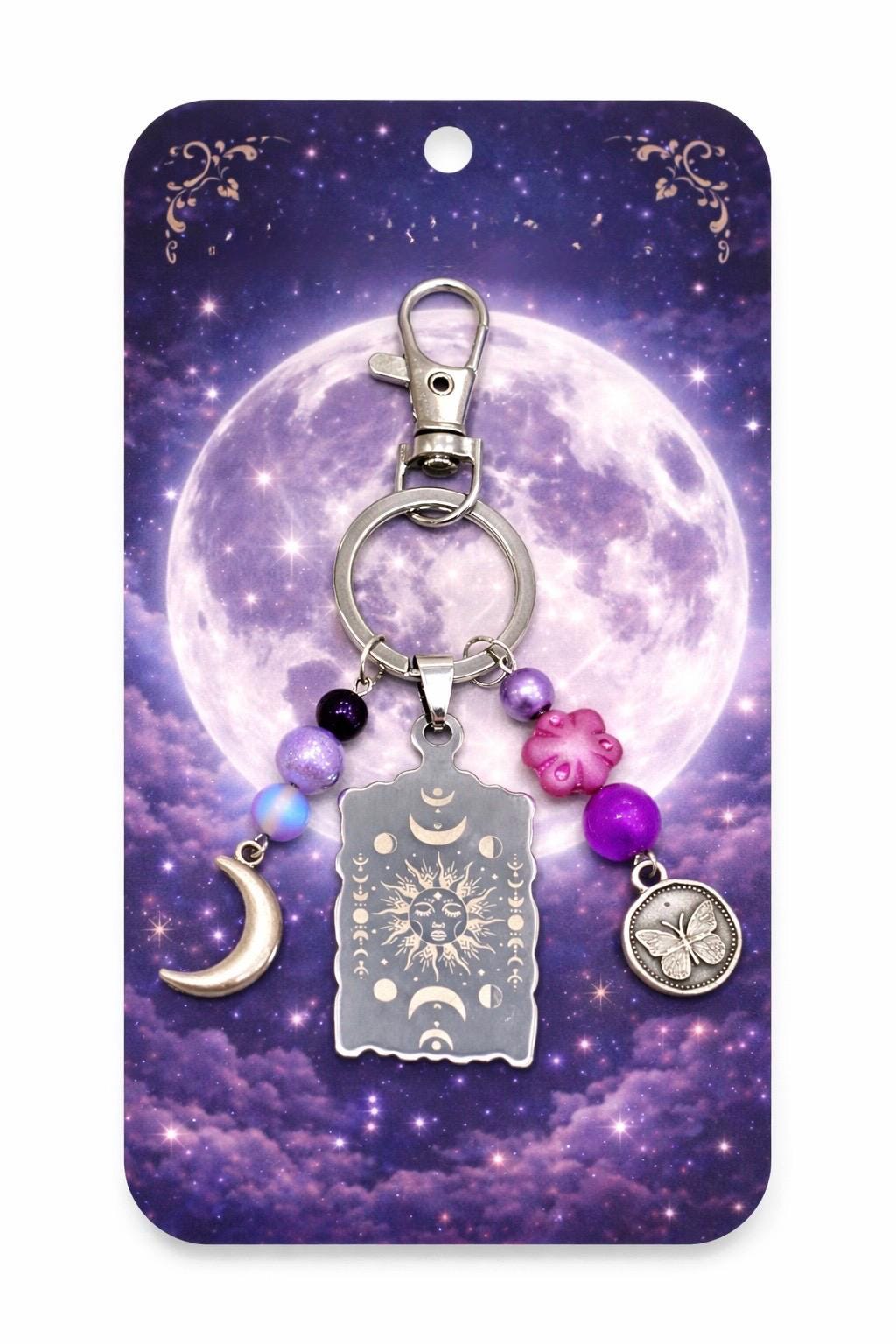 Celestial Moon Phase Butterfly Keychain – Sun, Moon, Sugilite, Aura Quartz