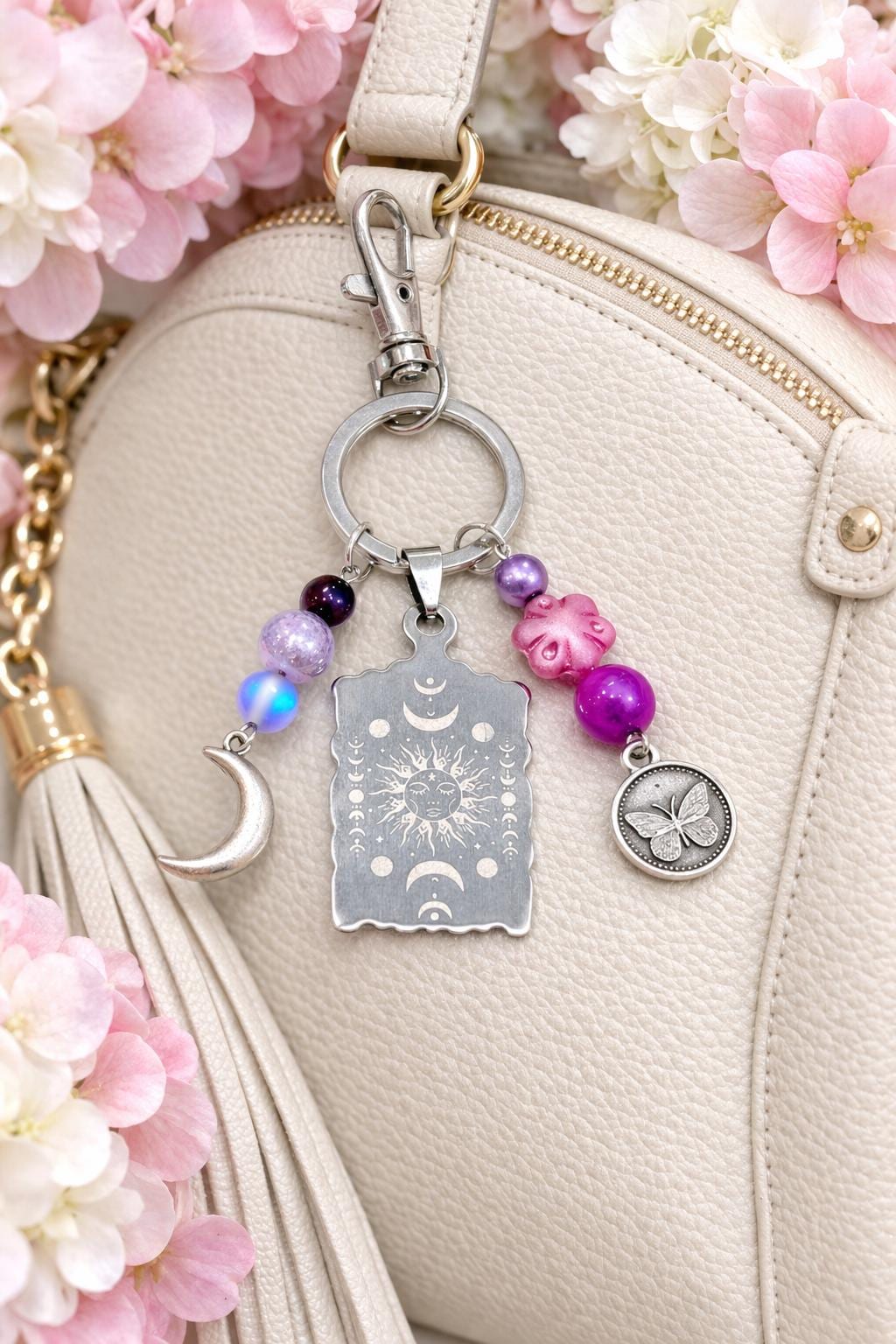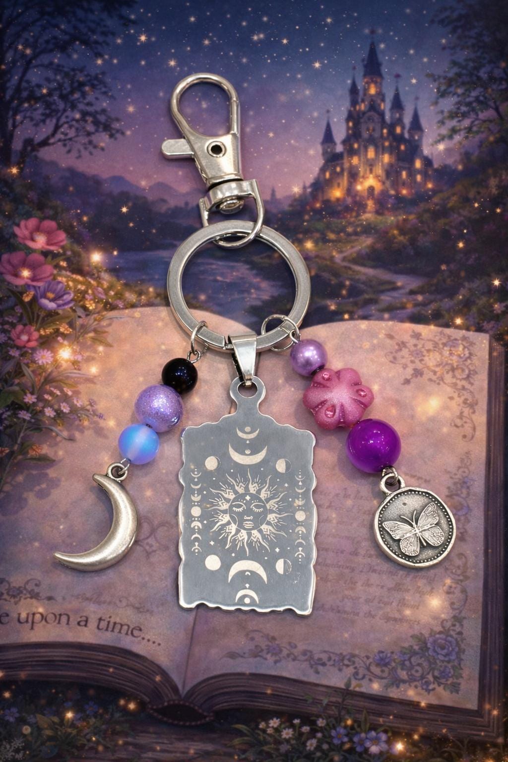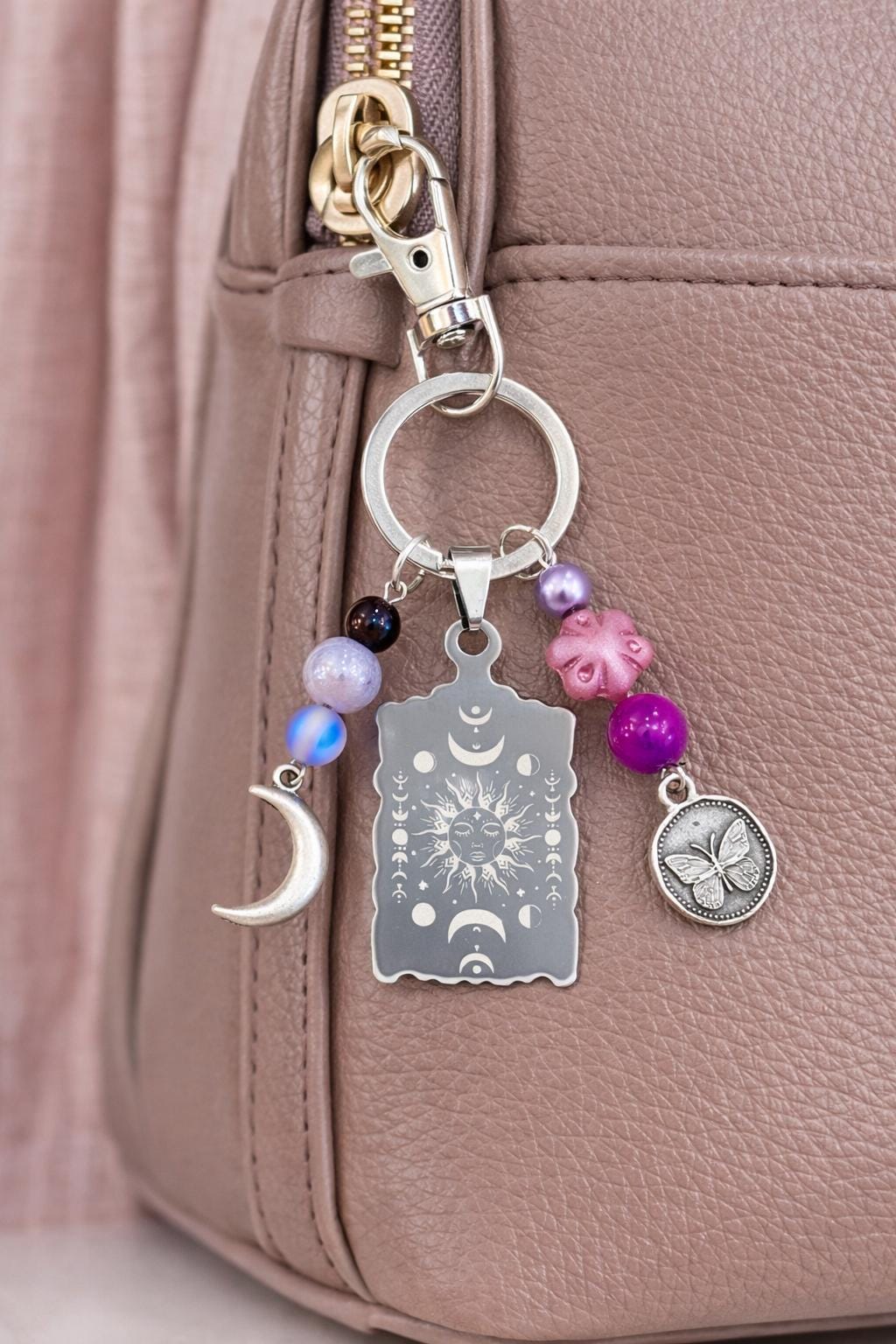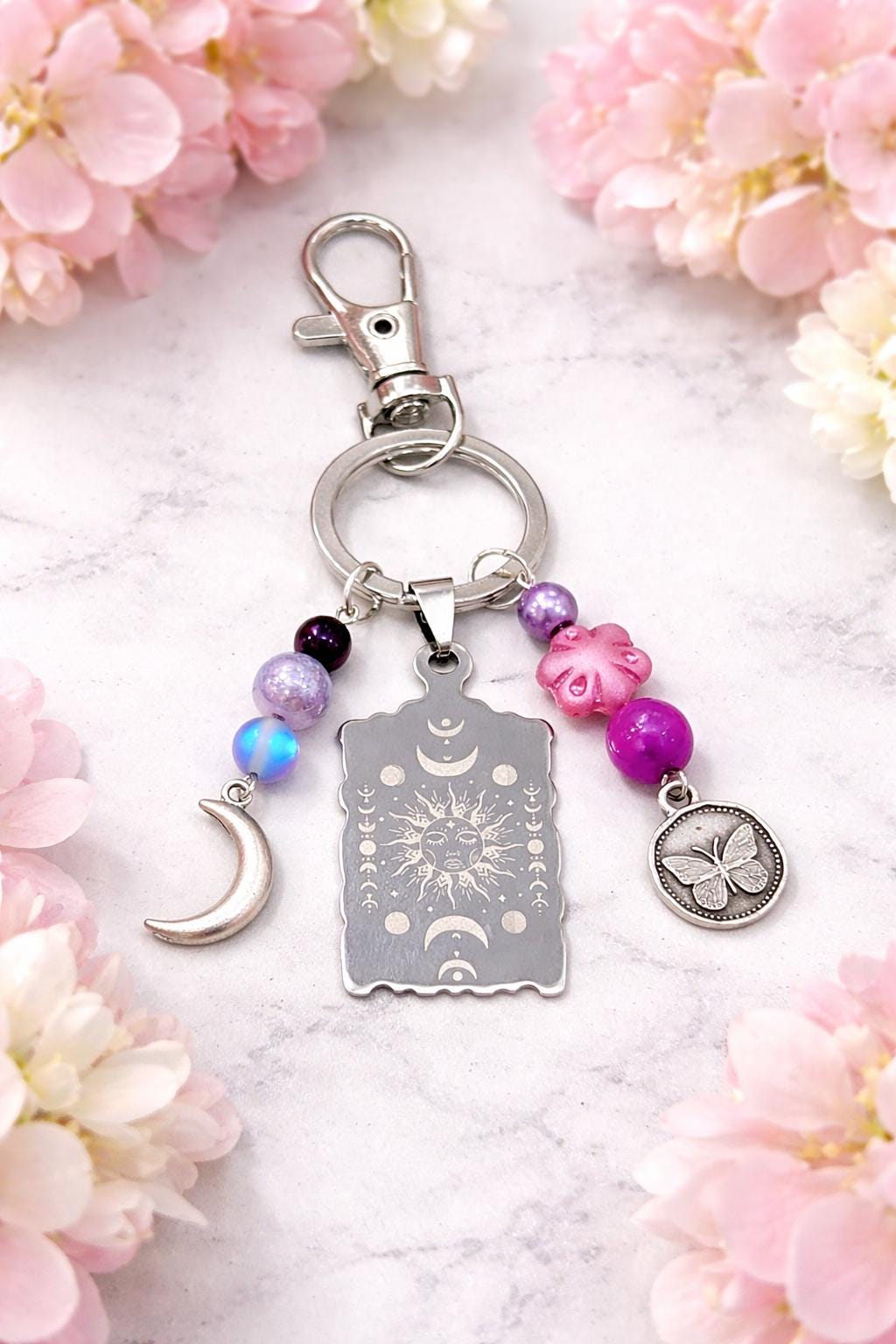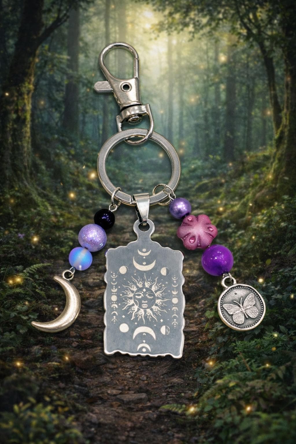 Celestial Moon Phase Butterfly Keychain – Sun, Moon, Sugilite, Aura Quartz