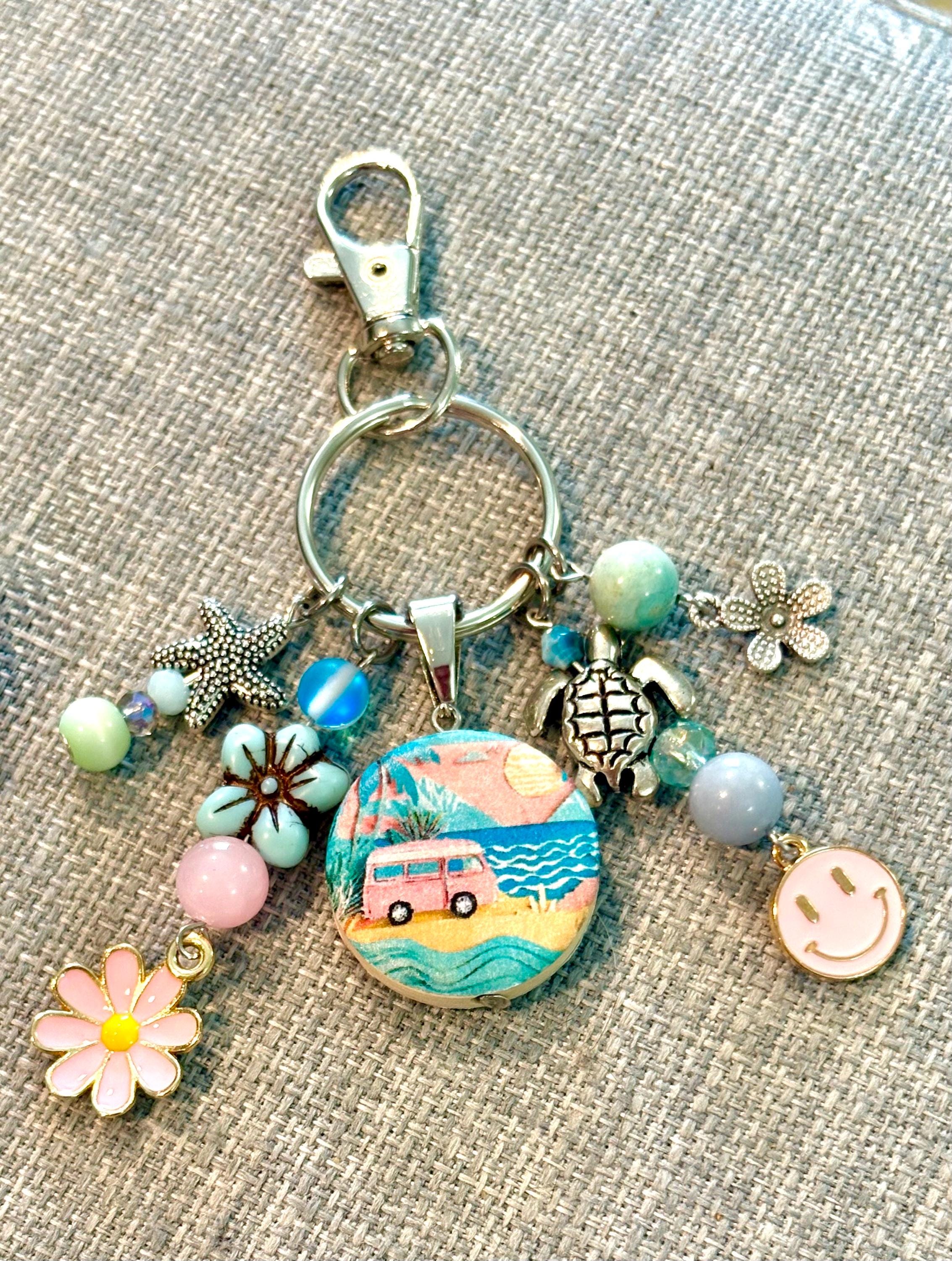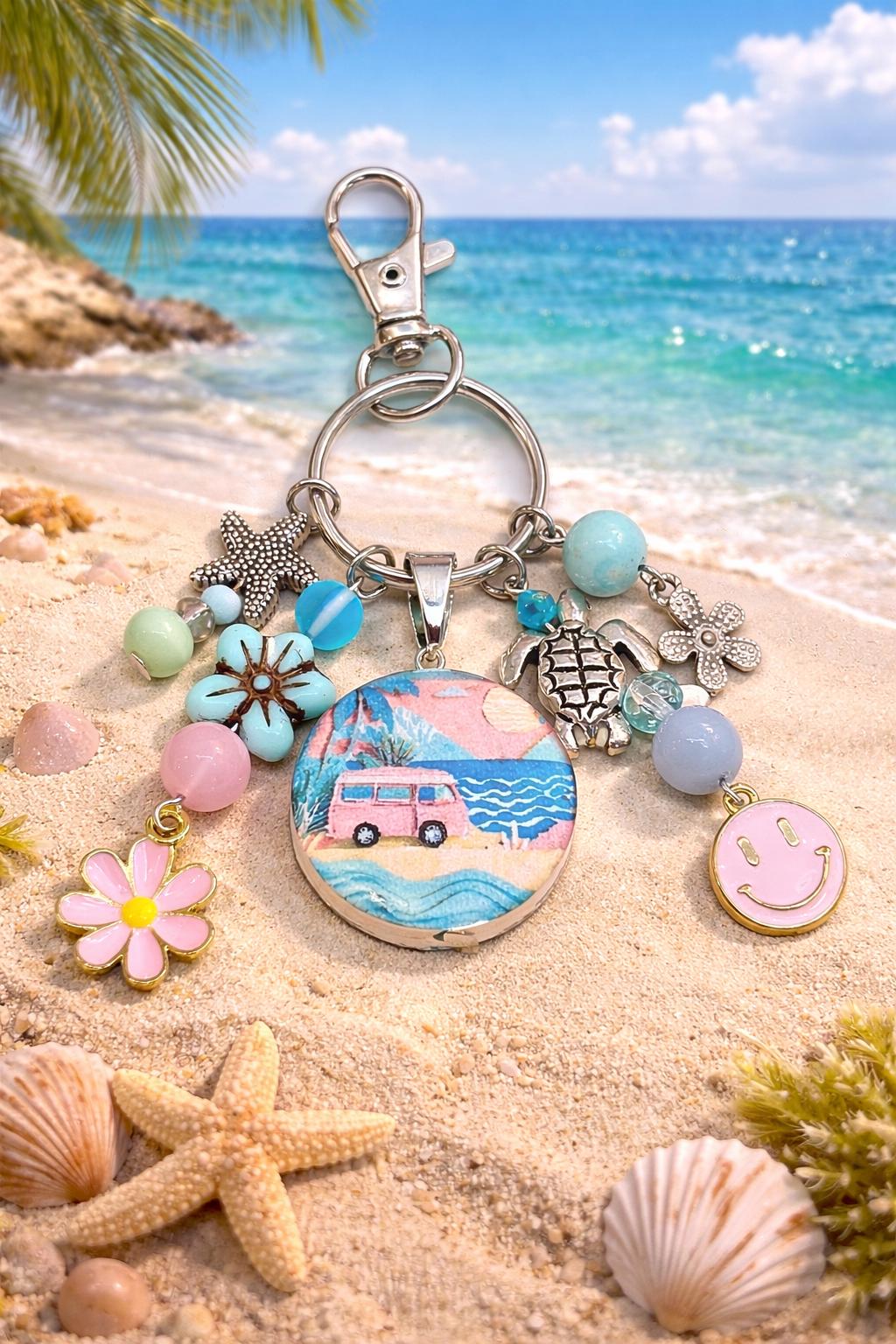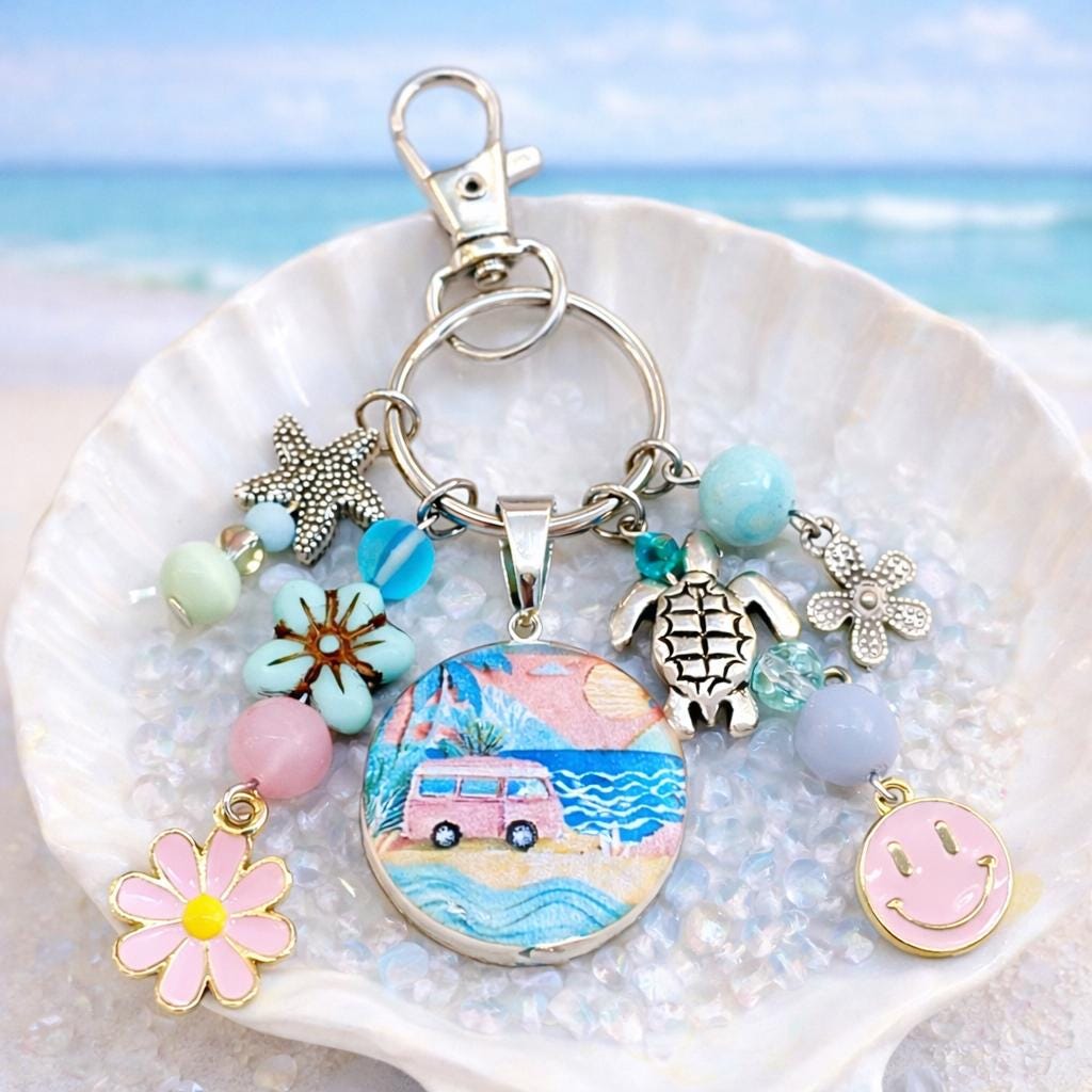 This dreamy, coastal-inspired enchanted purse charm is filled with soft pastel blooms, ocean treasures, and heart-lifting energy. At the center, an artisan wood bead captures a whimsical beach sceneβlike a tiny portal to your happiest seaside memories.