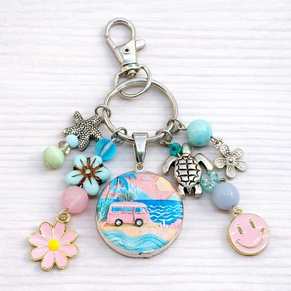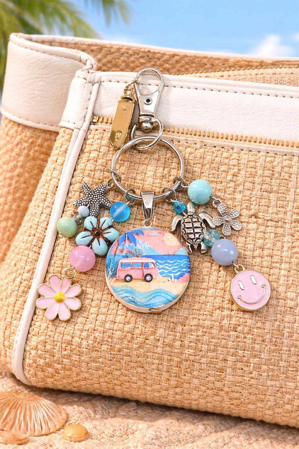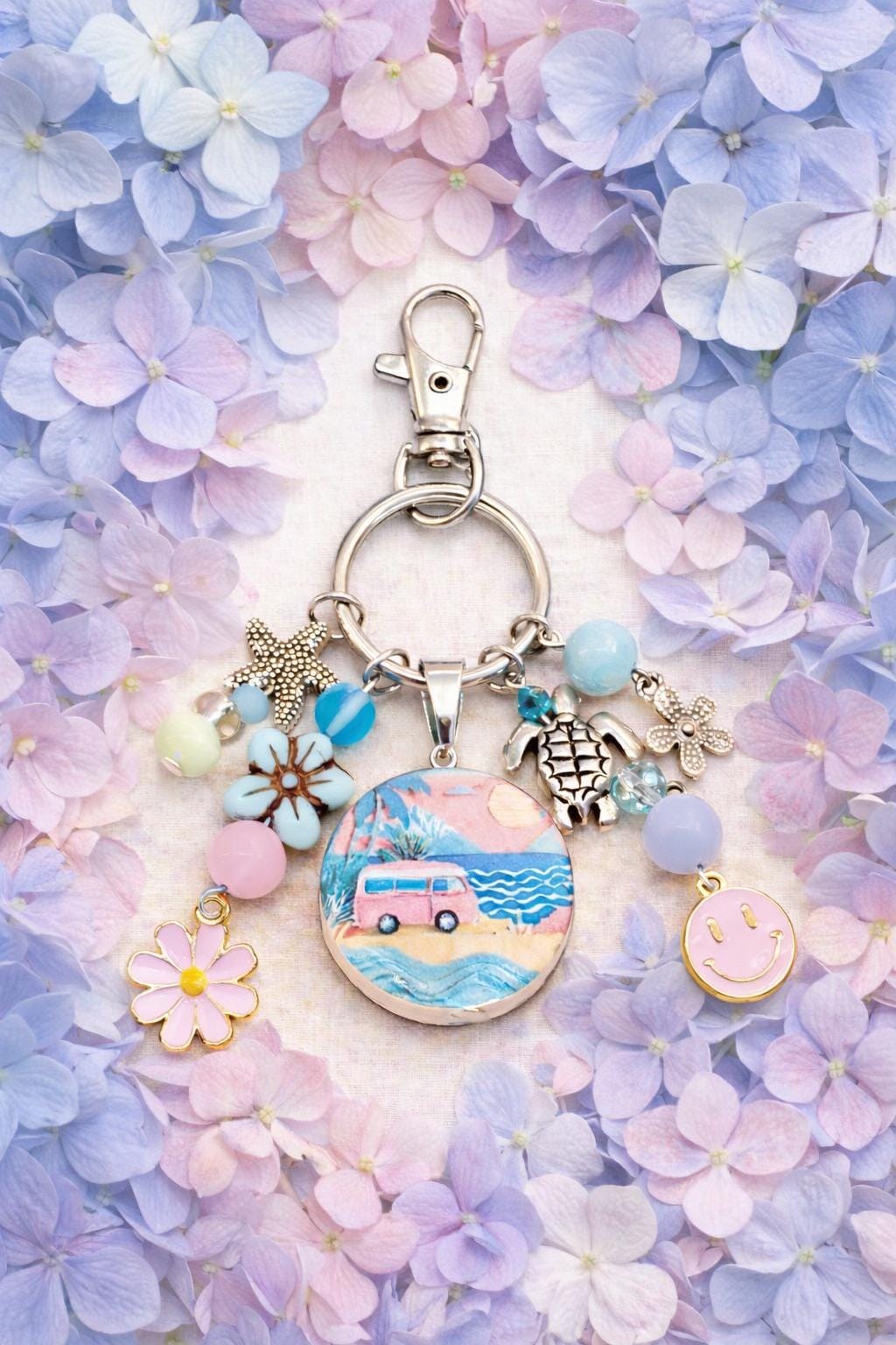 This dreamy, coastal-inspired enchanted purse charm is filled with soft pastel blooms, ocean treasures, and heart-lifting energy. At the center, an artisan wood bead captures a whimsical beach sceneβlike a tiny portal to your happiest seaside memories.