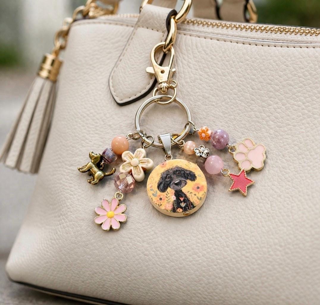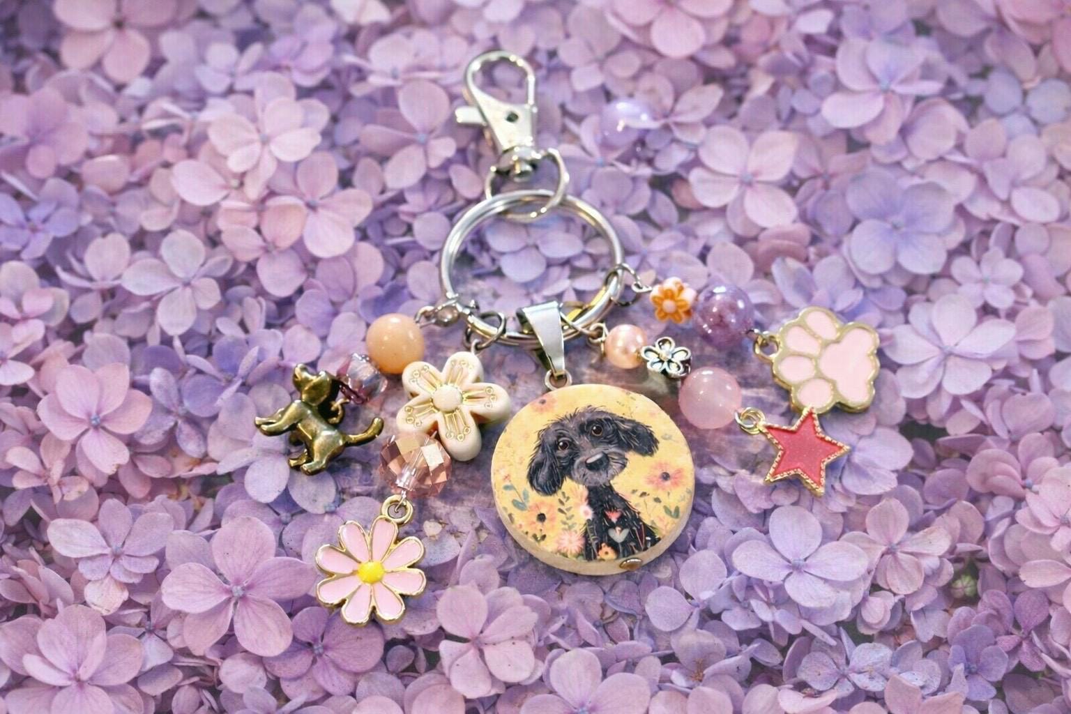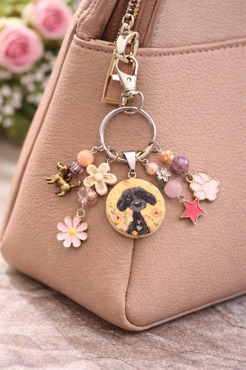 Enchanted Puppy Purse Charm Keychain, Pink Jade Gemstone, Floral Dog Lover Gift