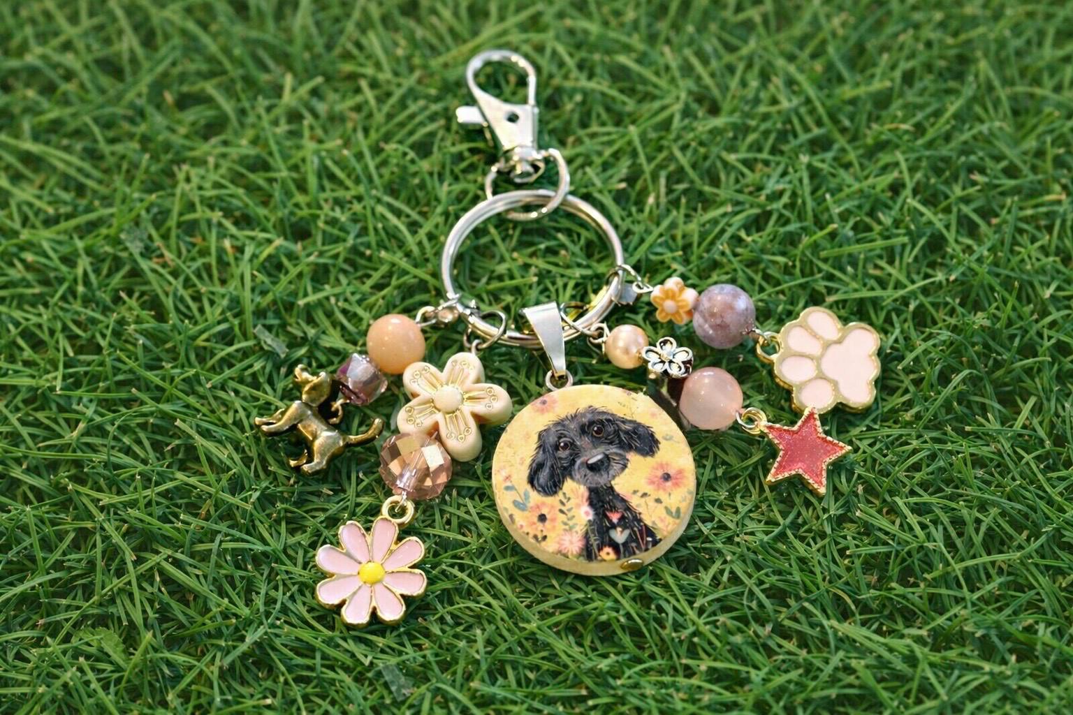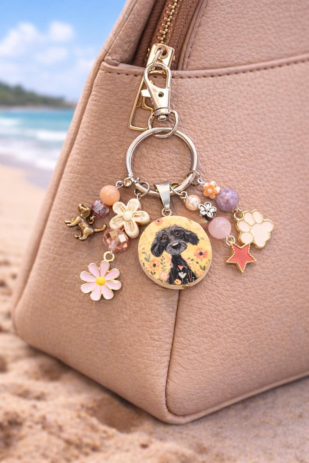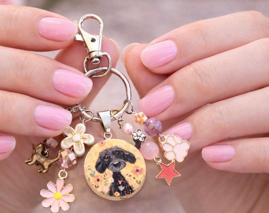 Enchanted Puppy Purse Charm Keychain, Pink Jade Gemstone, Floral Dog Lover Gift