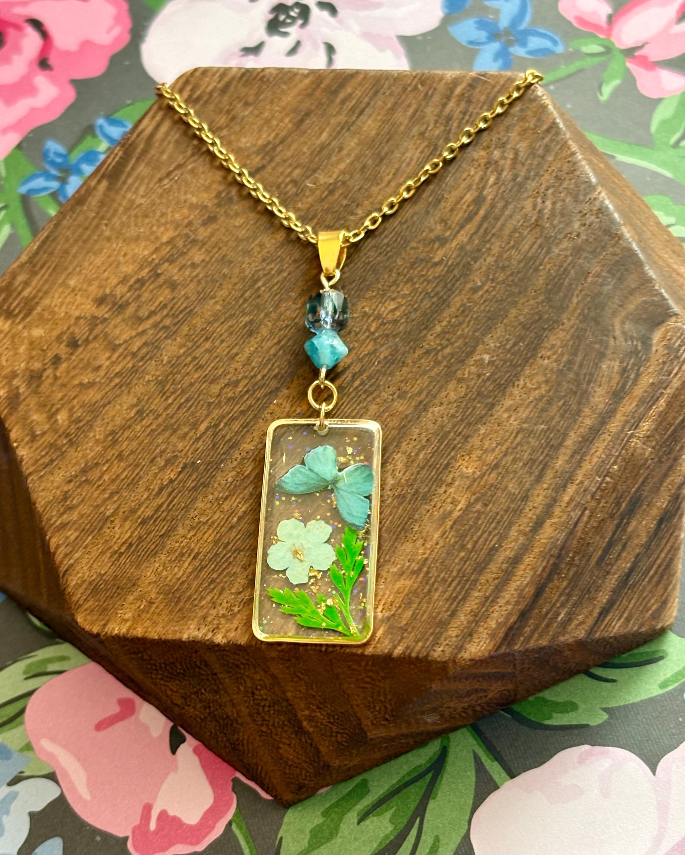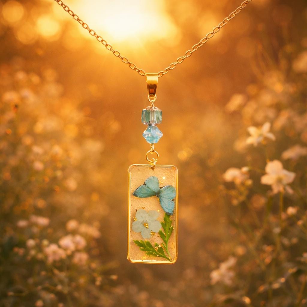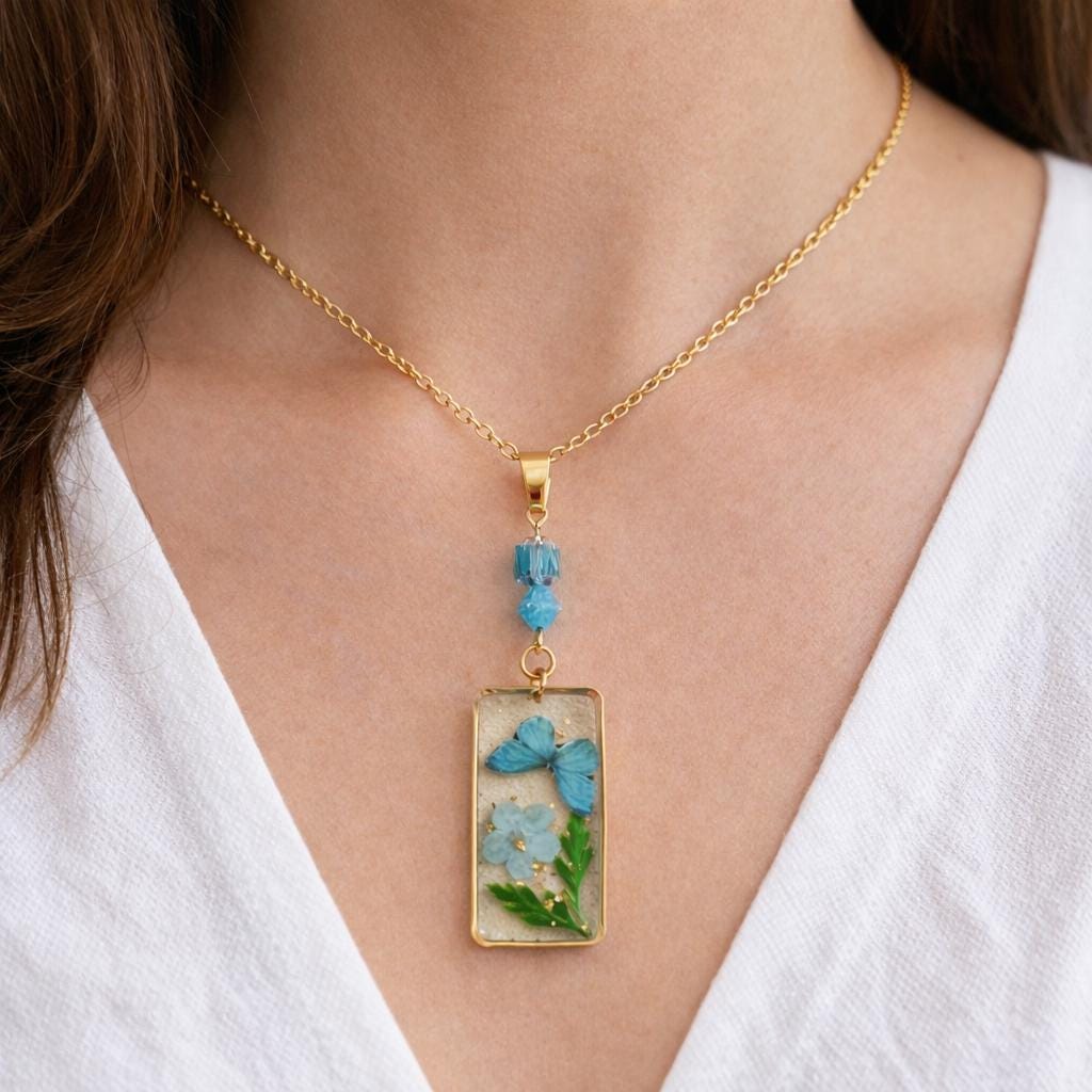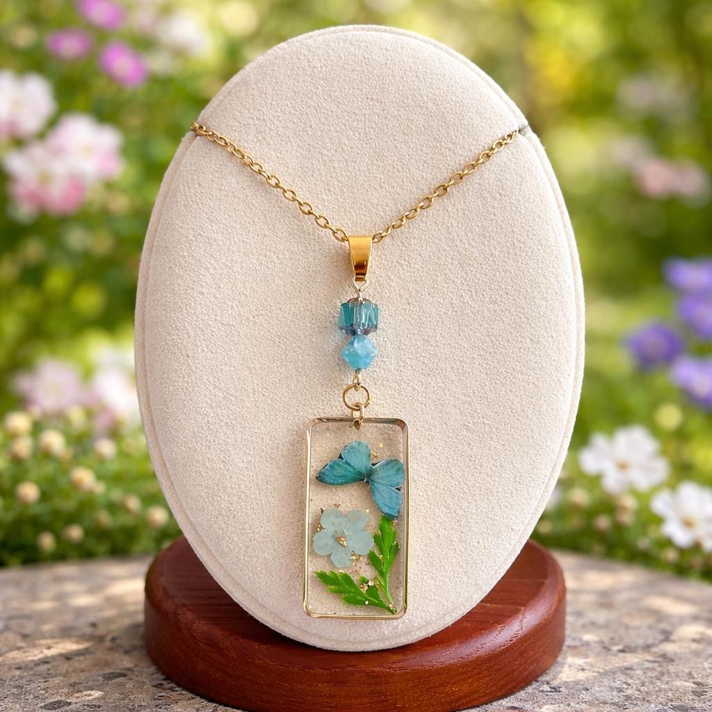• Pendant: Pressed flower & butterfly in resin, gold frame