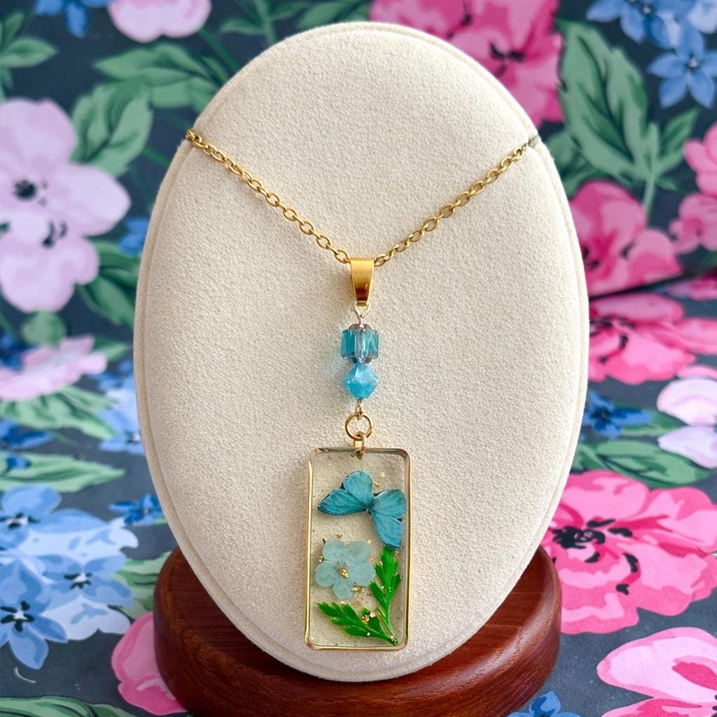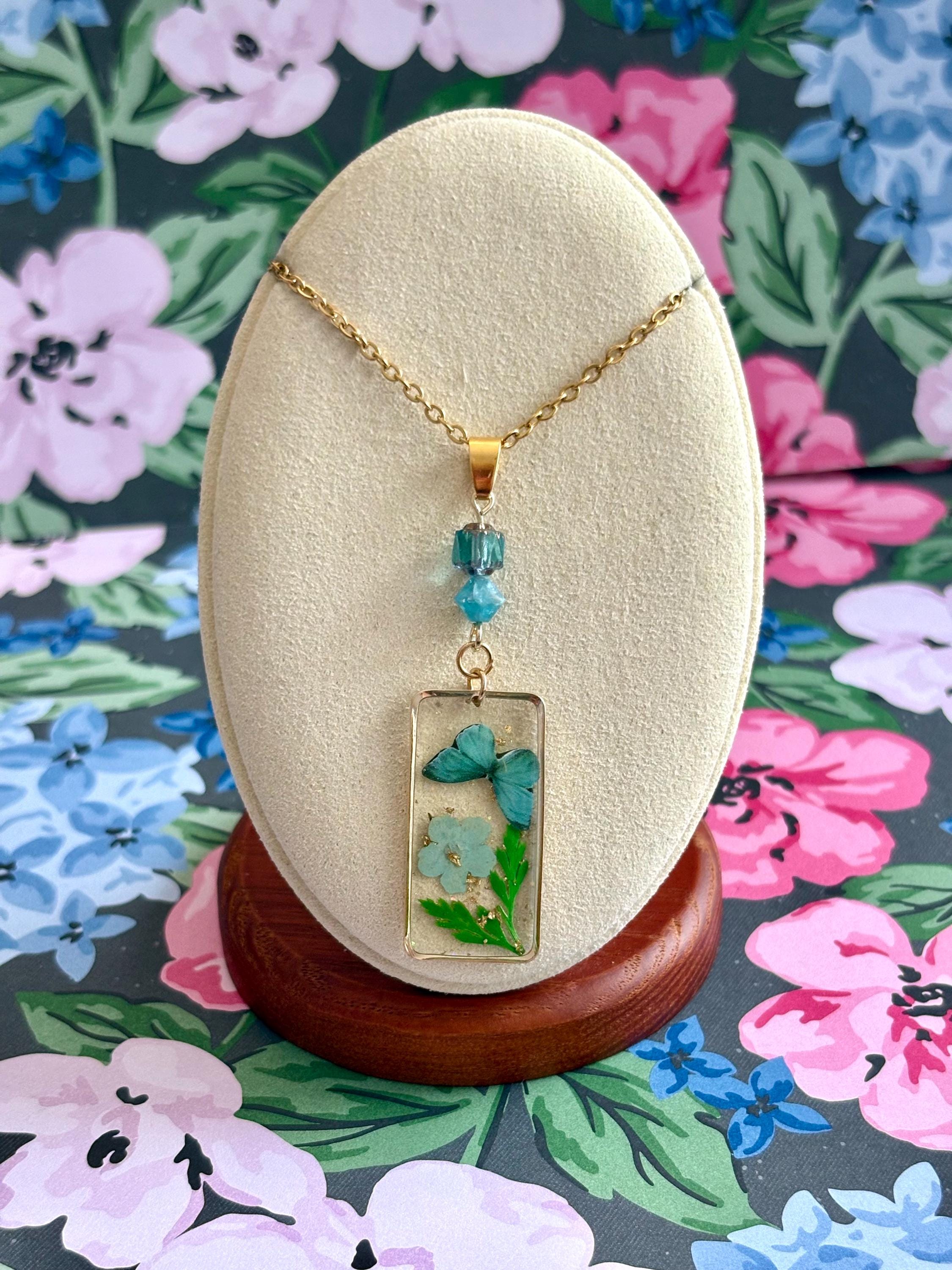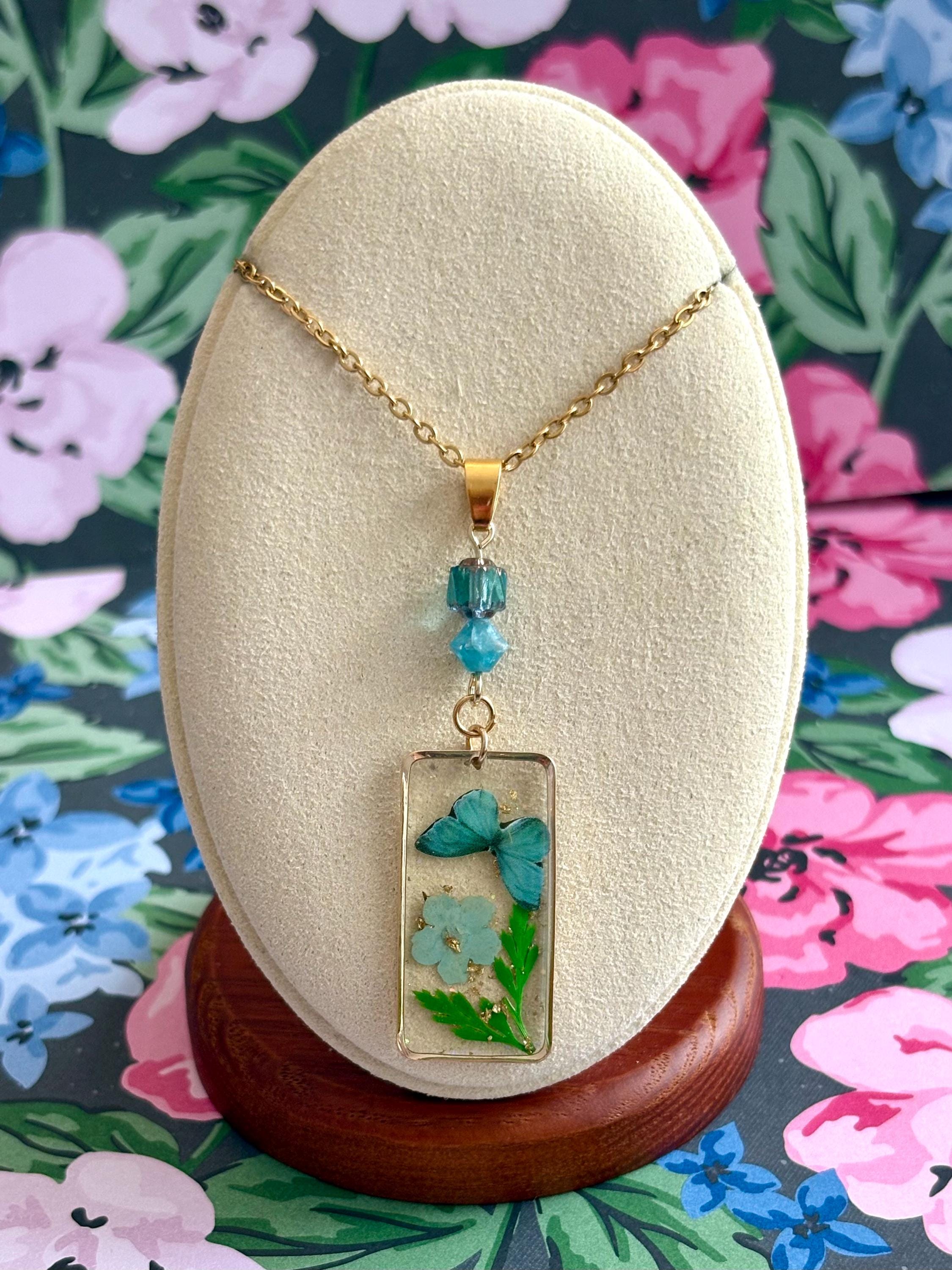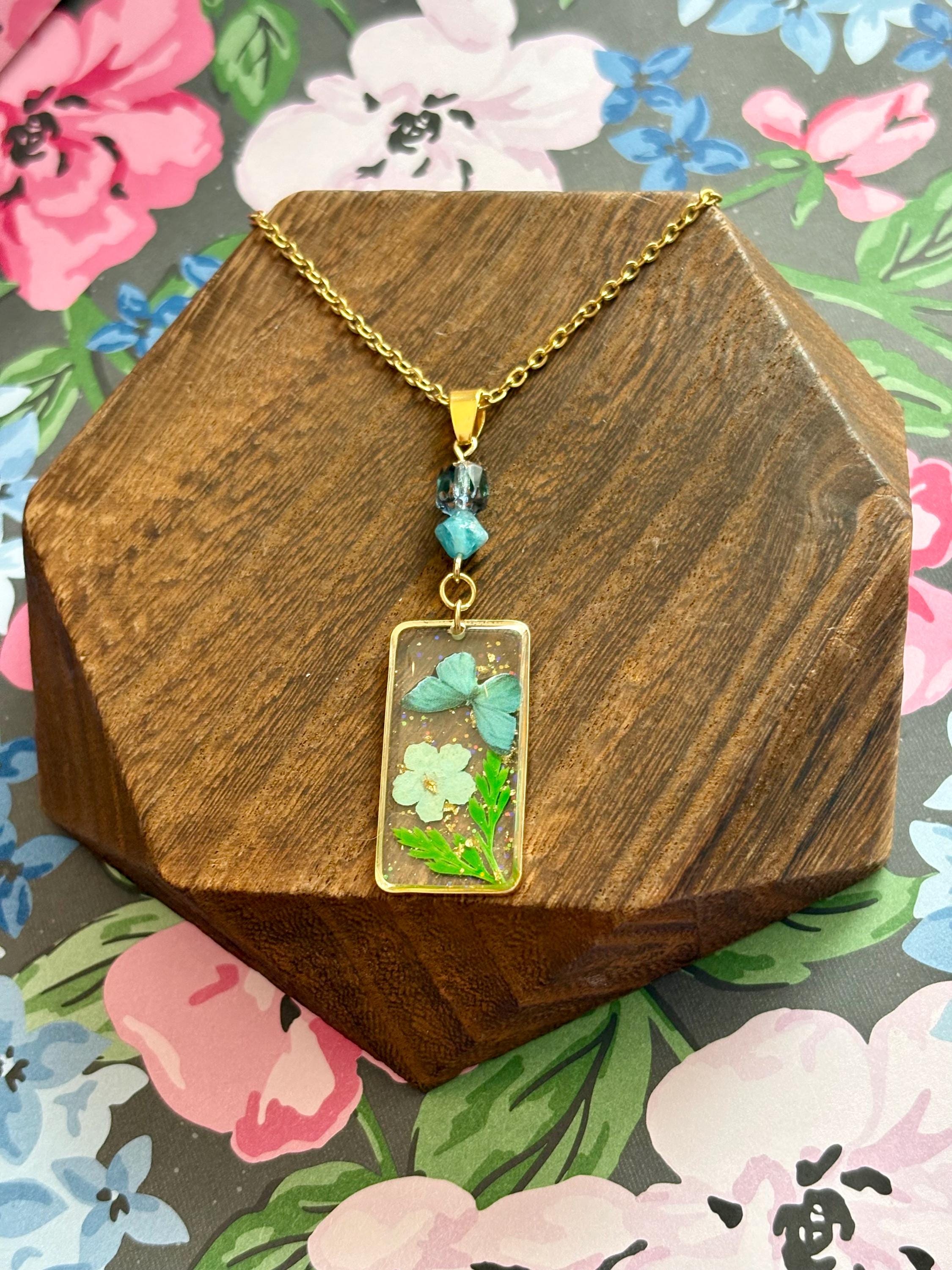 • Pendant: Pressed flower & butterfly in resin, gold frame