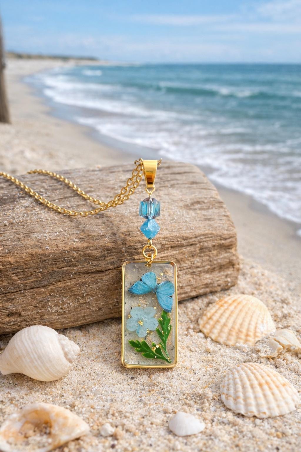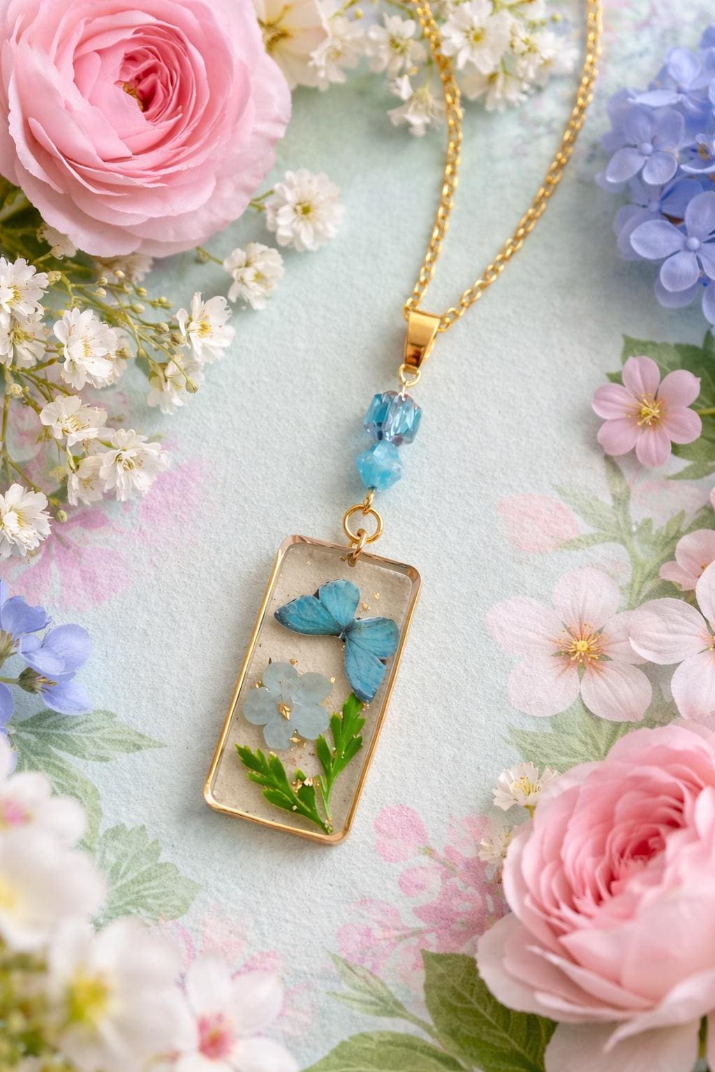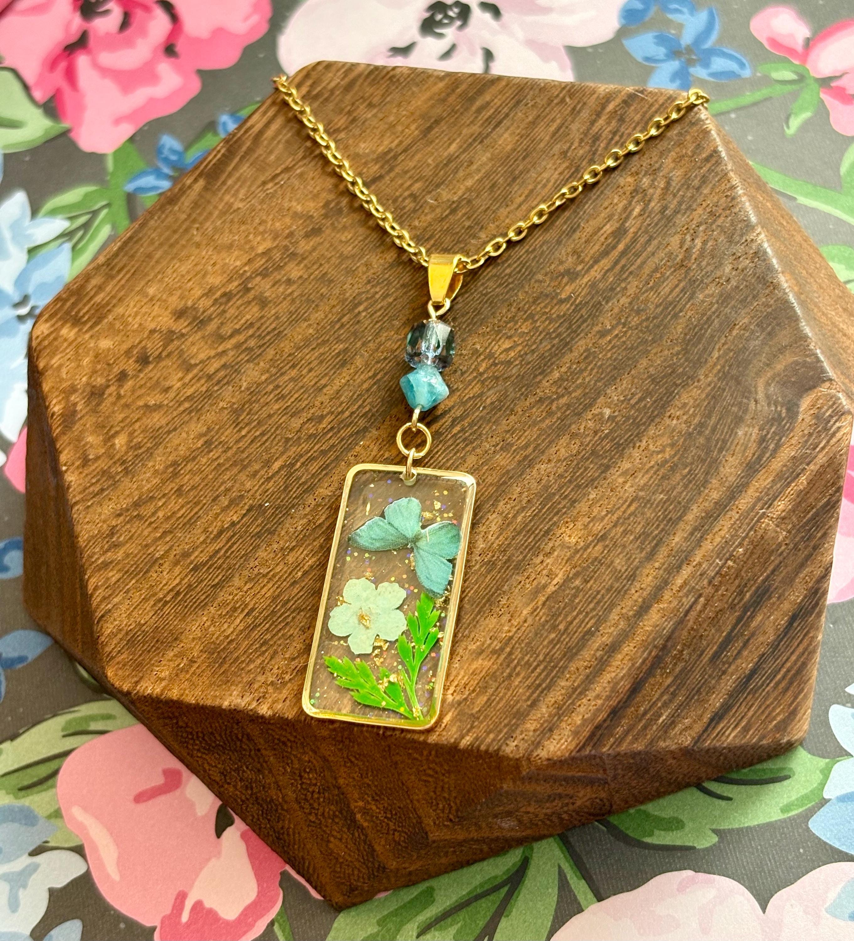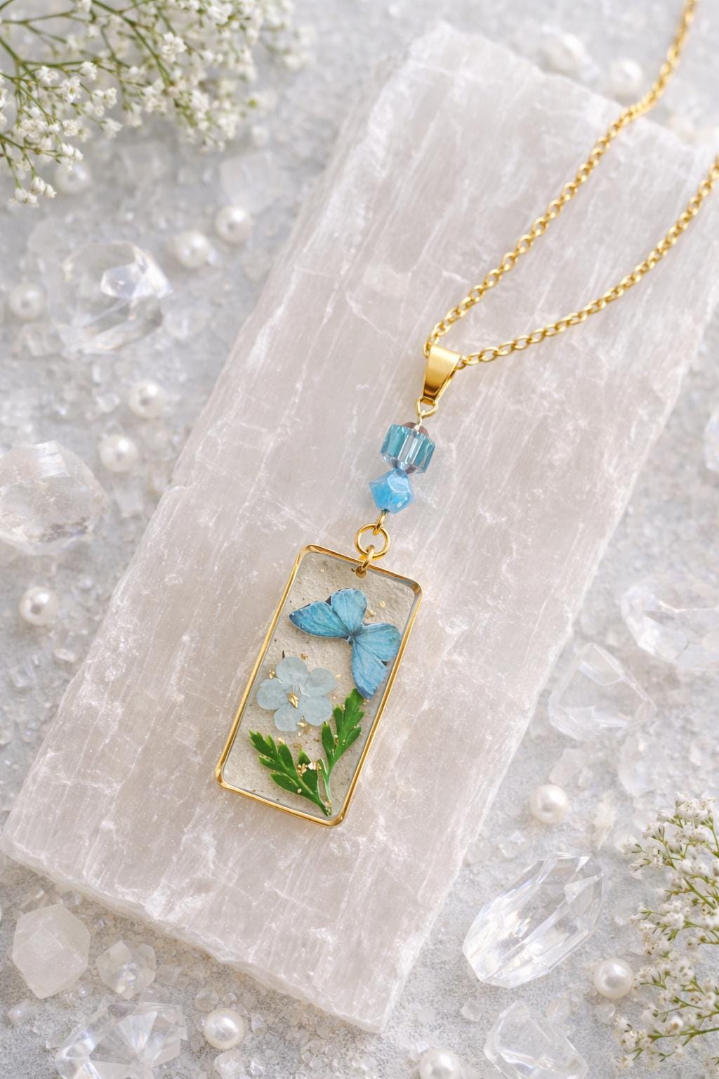• Pendant: Pressed flower & butterfly in resin, gold frame