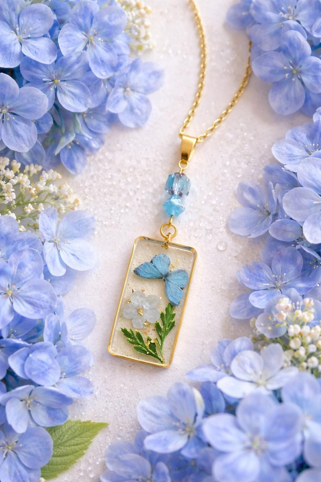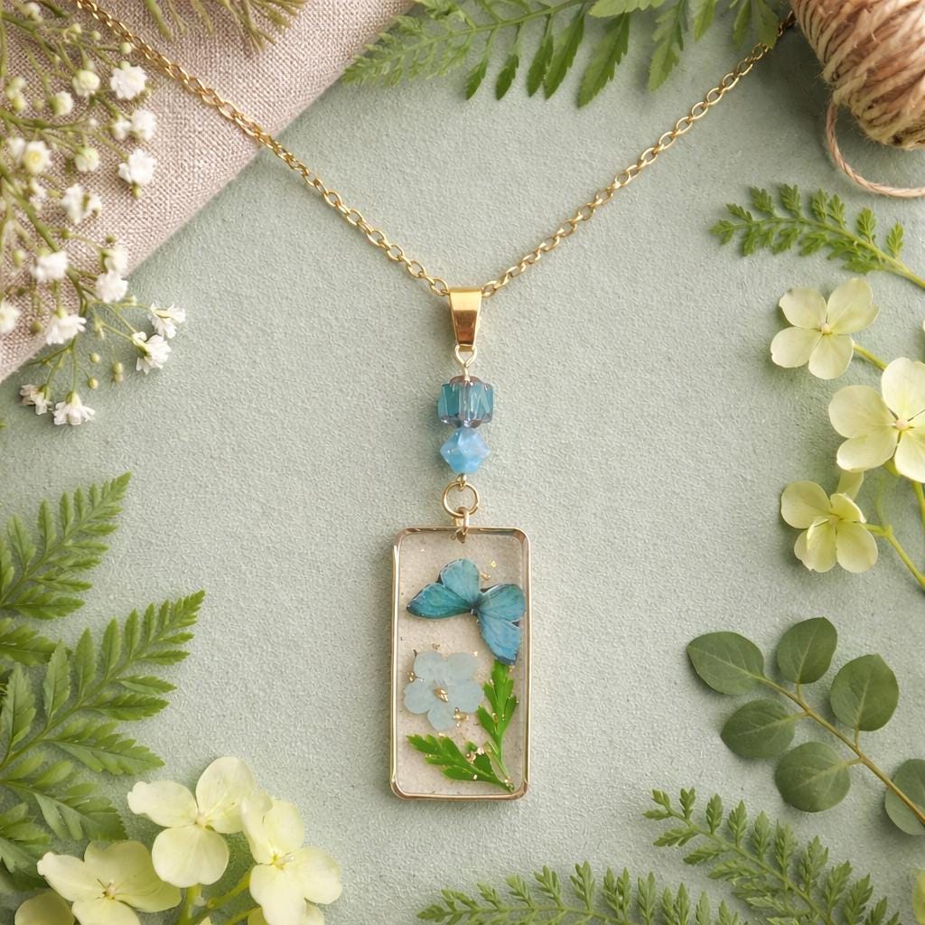 The Hydrangea Whisper Butterfly Necklace captures the delicate beauty of nature in a timeless keepsake. A pressed flower and butterfly are preserved in crystal-clear resin, framed in radiant gold, creating a dreamy, one-of-a-kind wearable treasure.