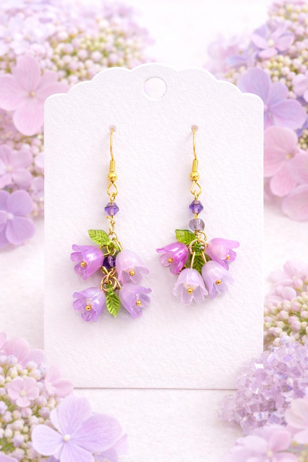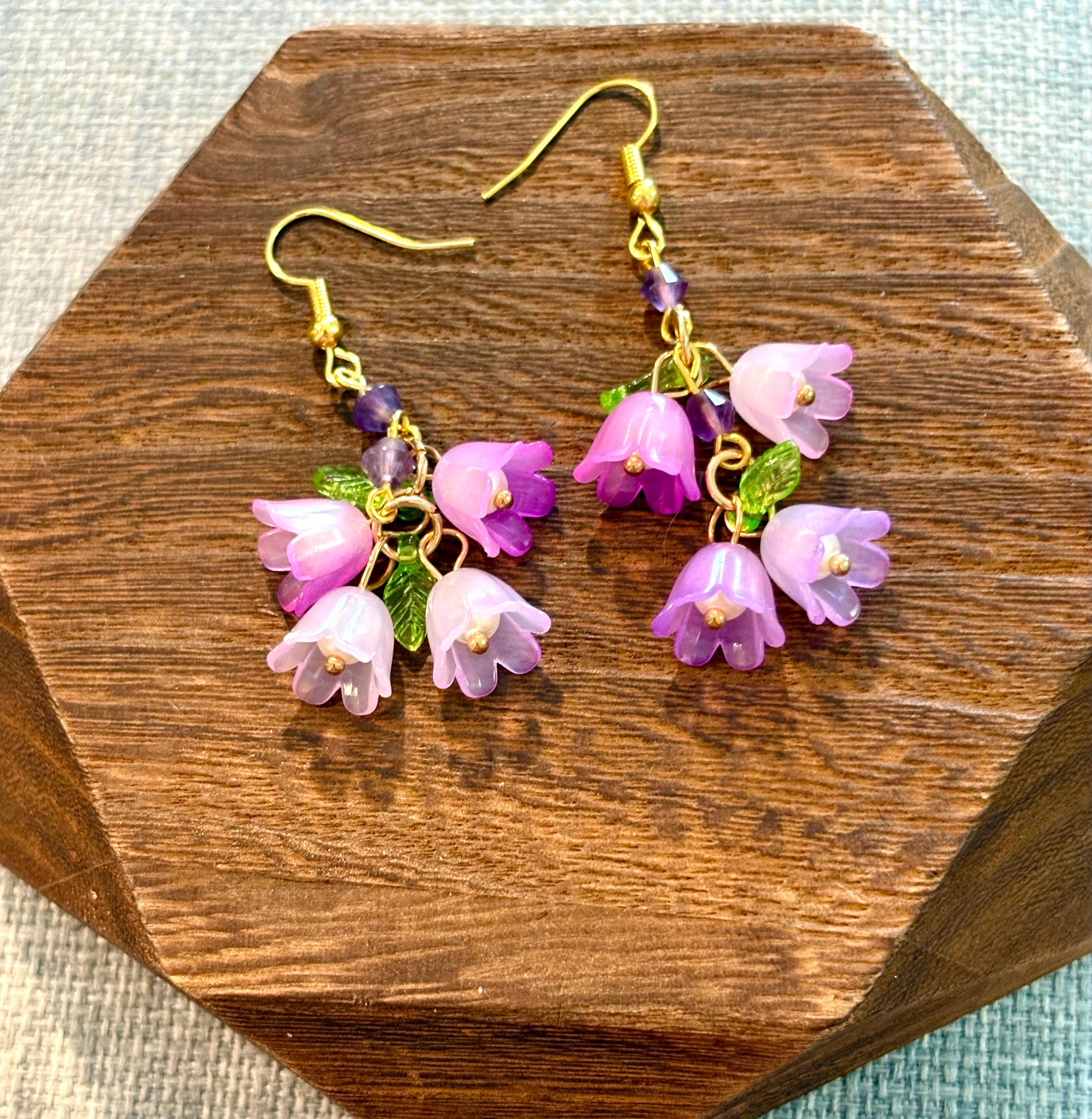 Each pair features cascading floral charms in radiant shades of lavender and violet, accented with genuine amethyst gemstones—known for their calming, soothing energy. Set on gold tone hypoallergenic ear wires, these earrings are lightweight, whimsical, and effortlessly elegant.