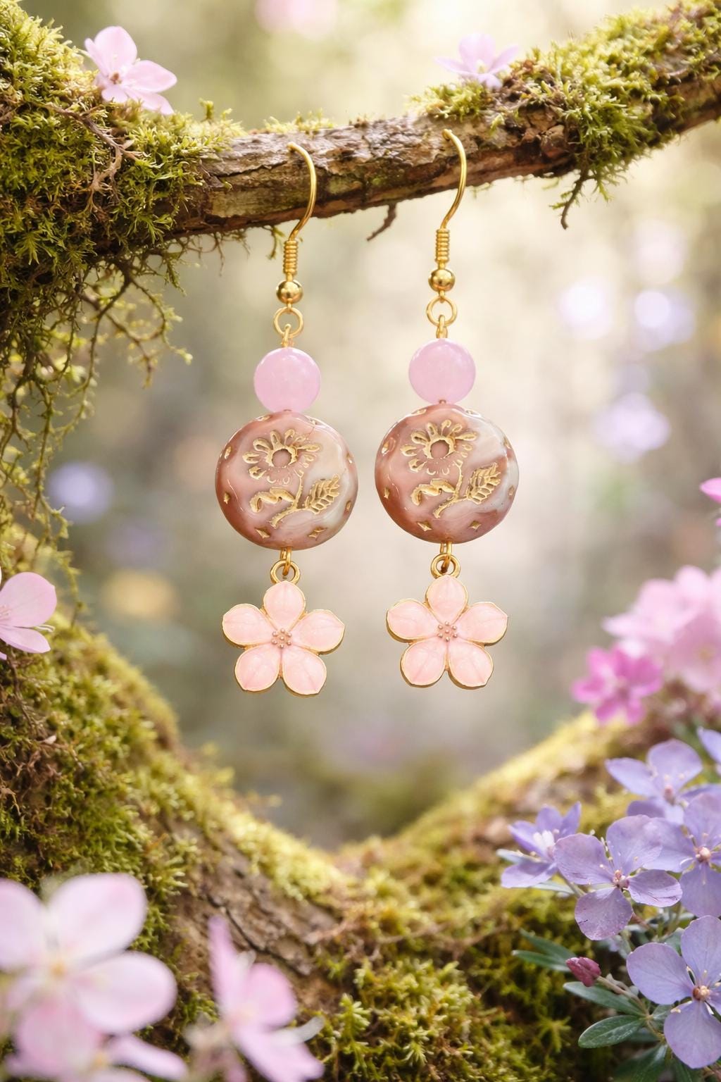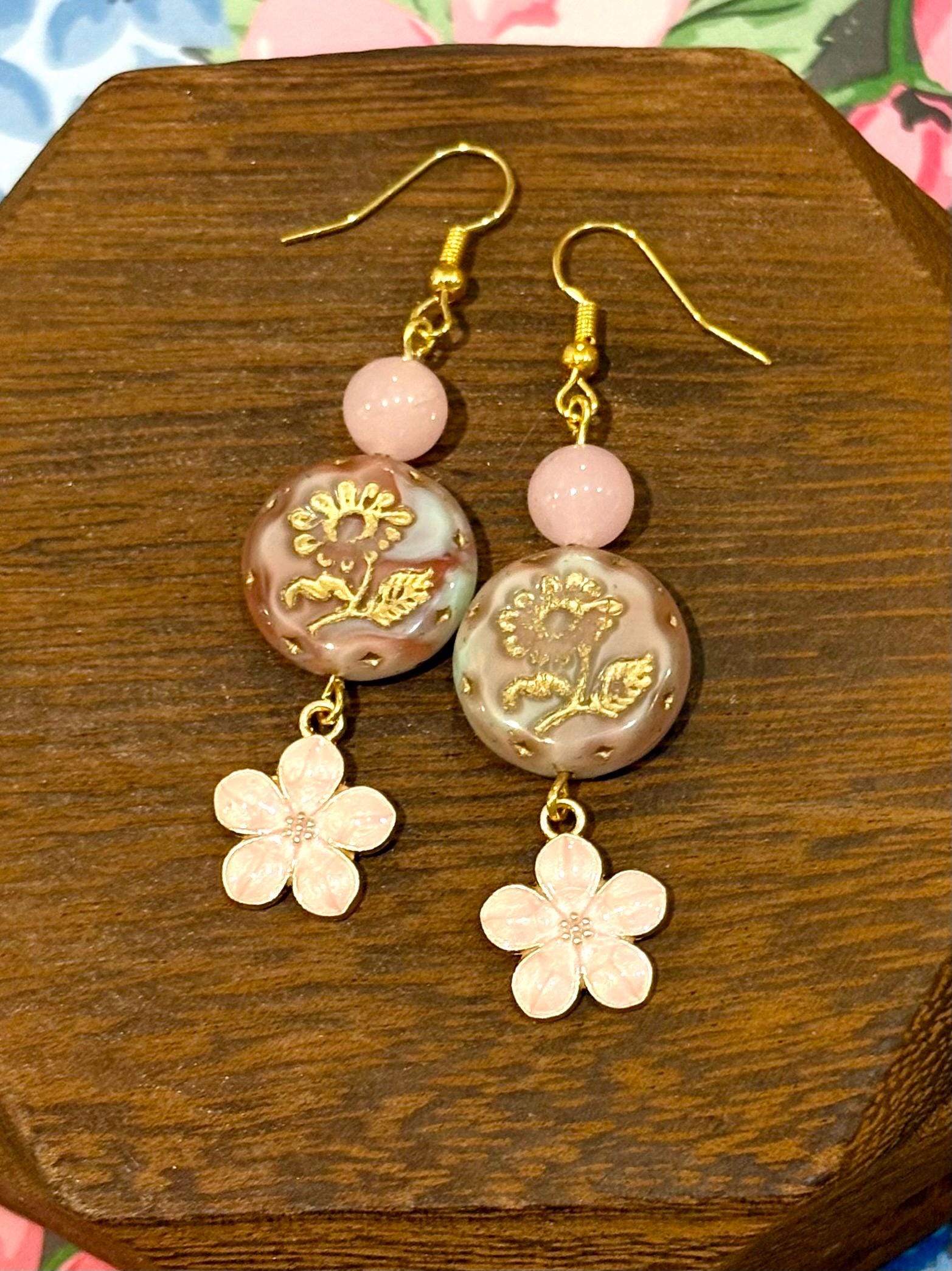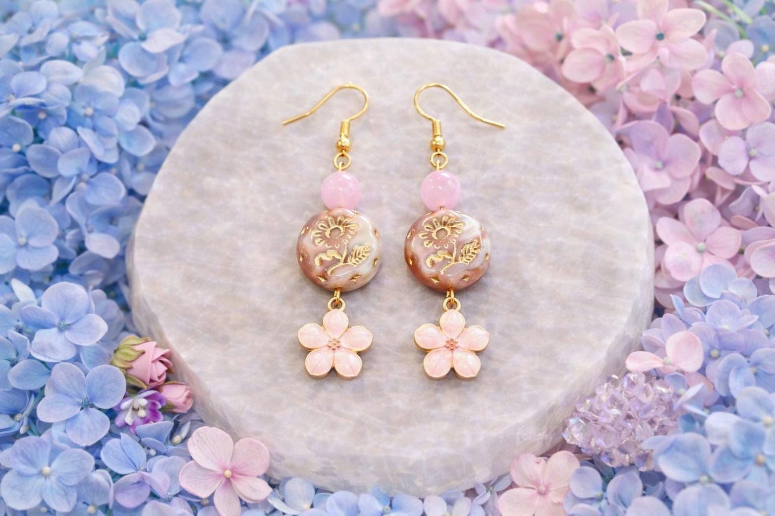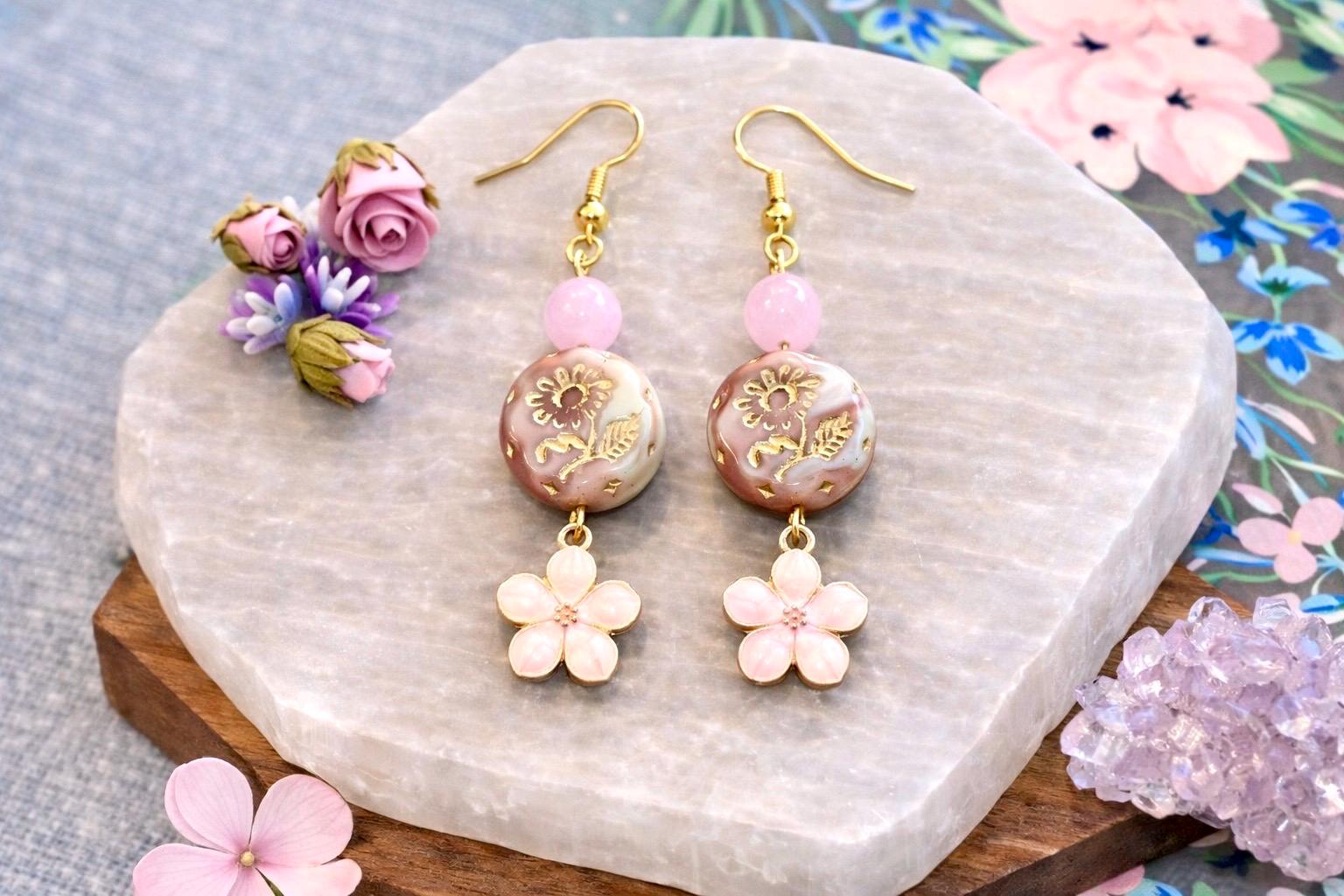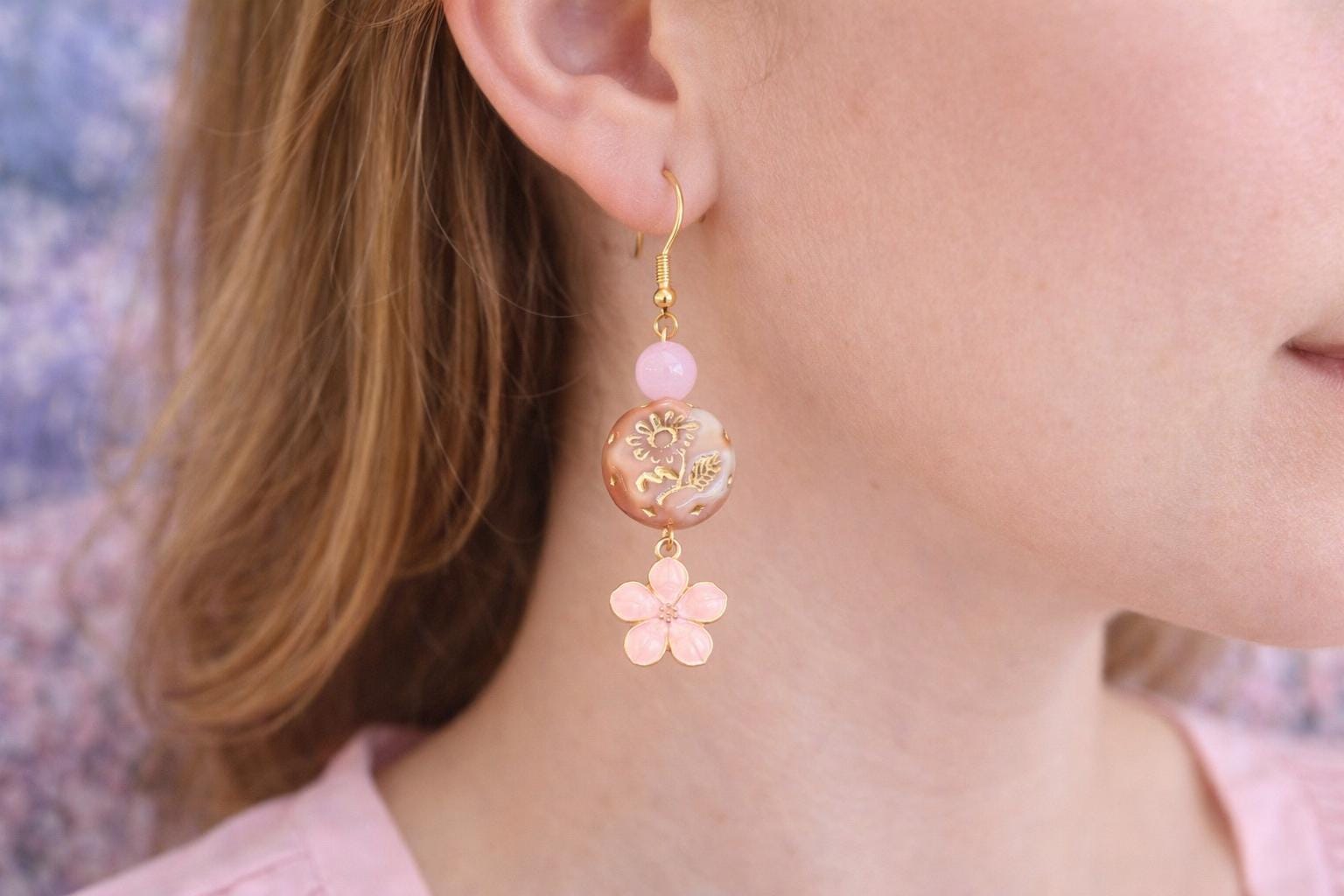 Handcrafted with luminous pink jade gemstones, intricately etched Czech glass flower beads, and sweet pink enamel blossom charms, each pair feels like a tiny garden of serenity you can wear. The warm gold accents bring everything together in a soft, romantic glow.