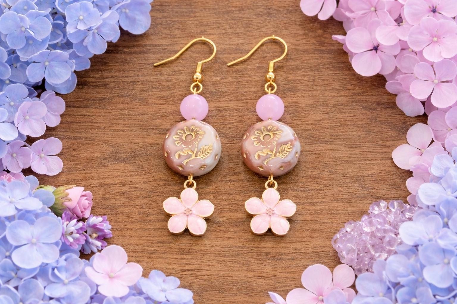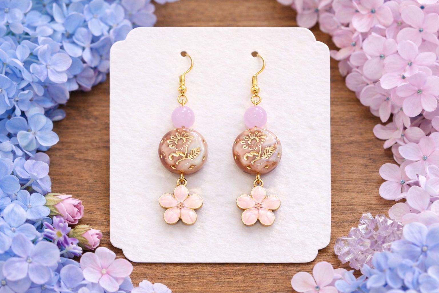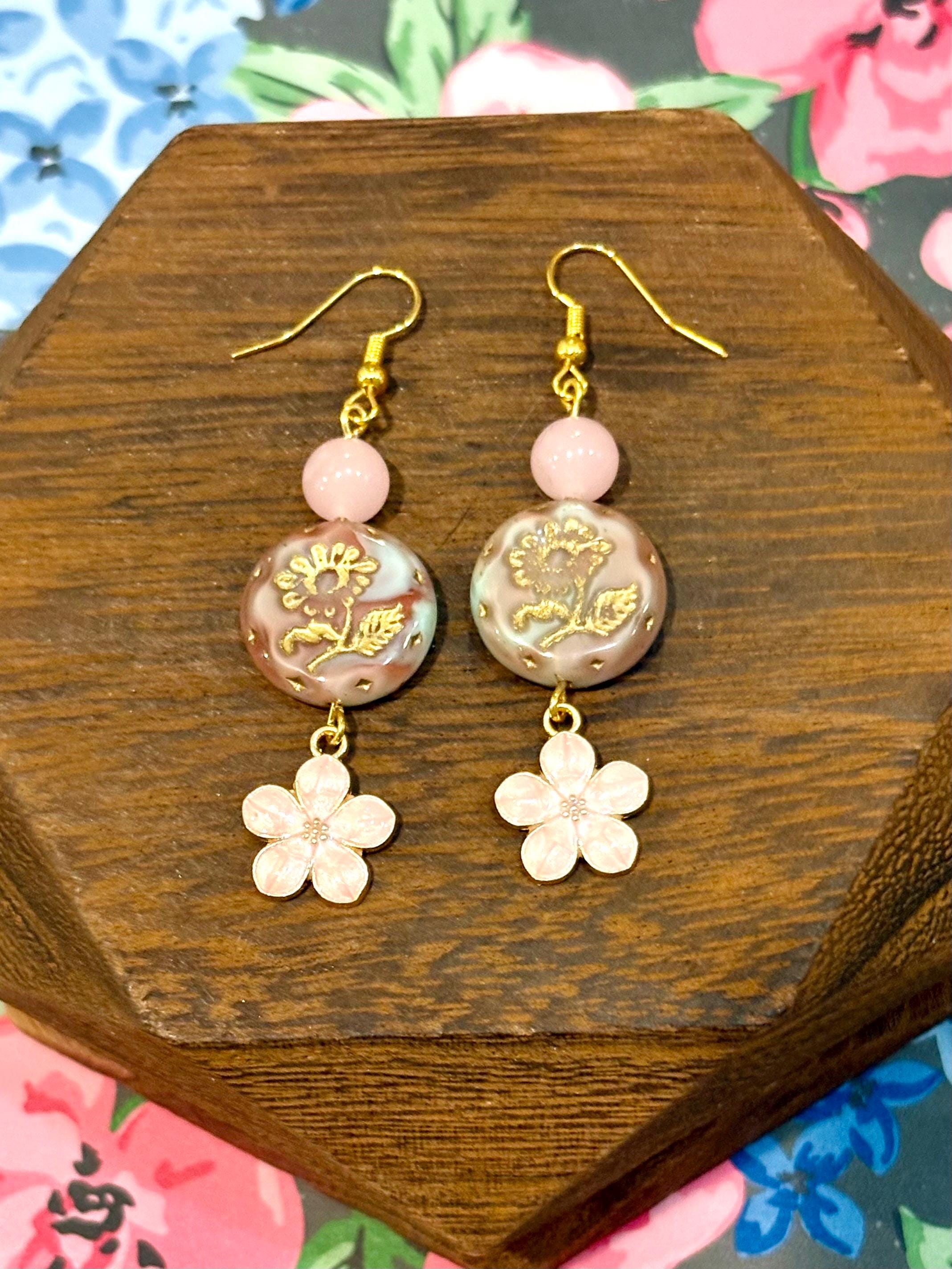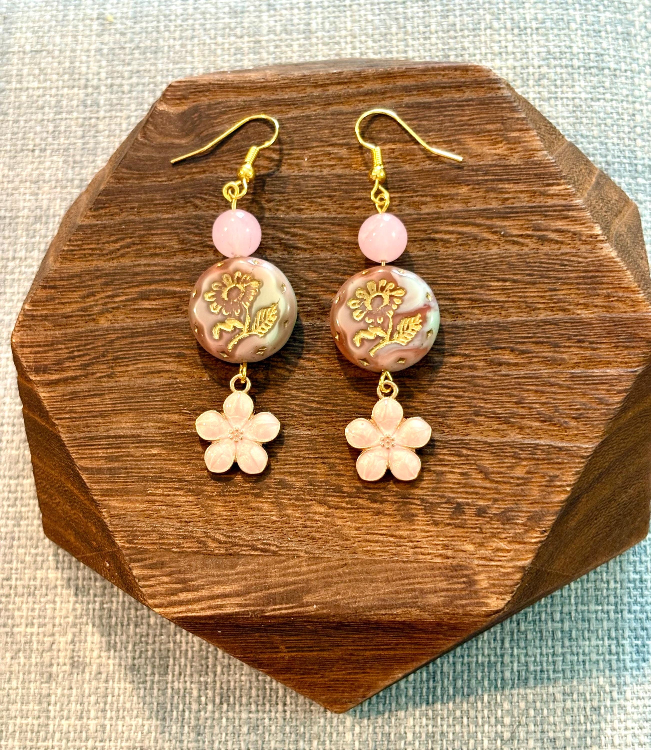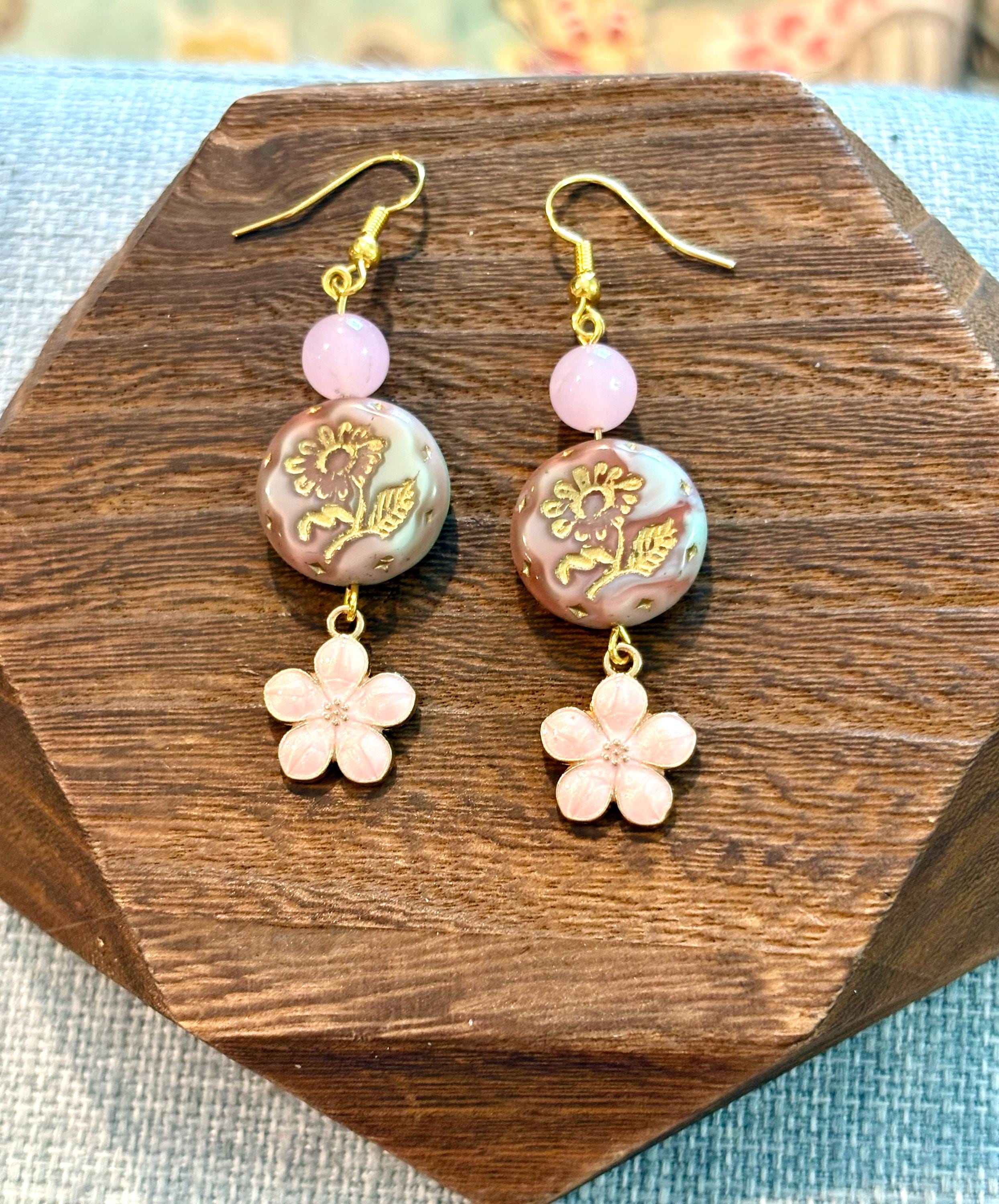 Handcrafted with luminous pink jade gemstones, intricately etched Czech glass flower beads, and sweet pink enamel blossom charms, each pair feels like a tiny garden of serenity you can wear. The warm gold accents bring everything together in a soft, romantic glow.
