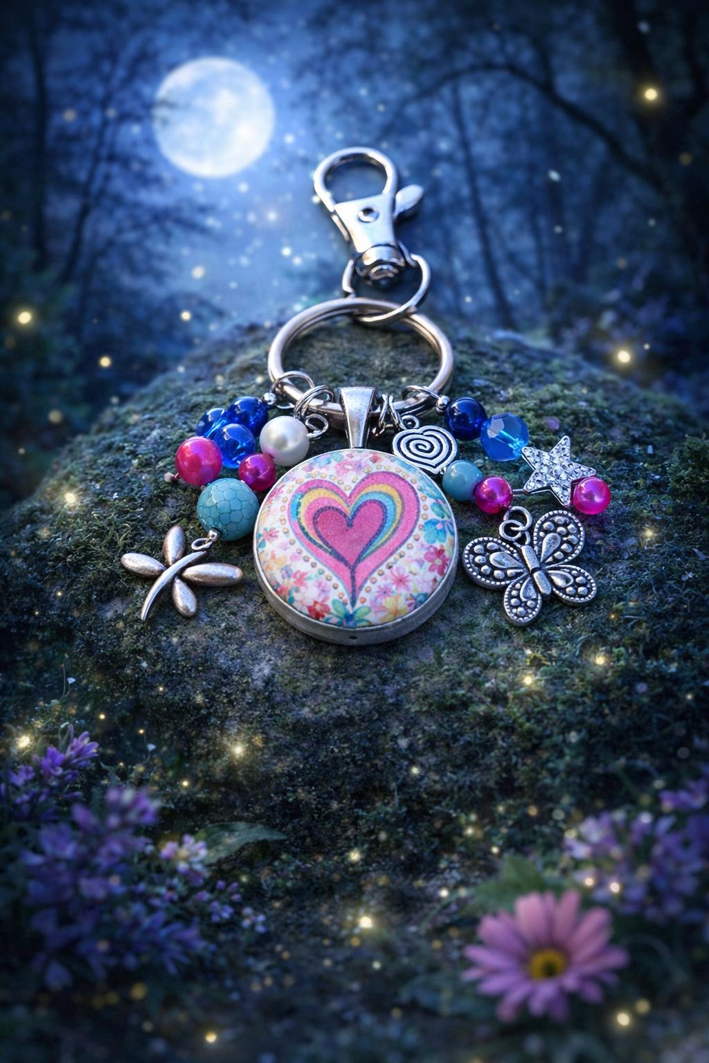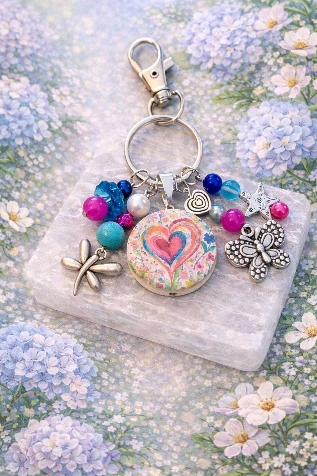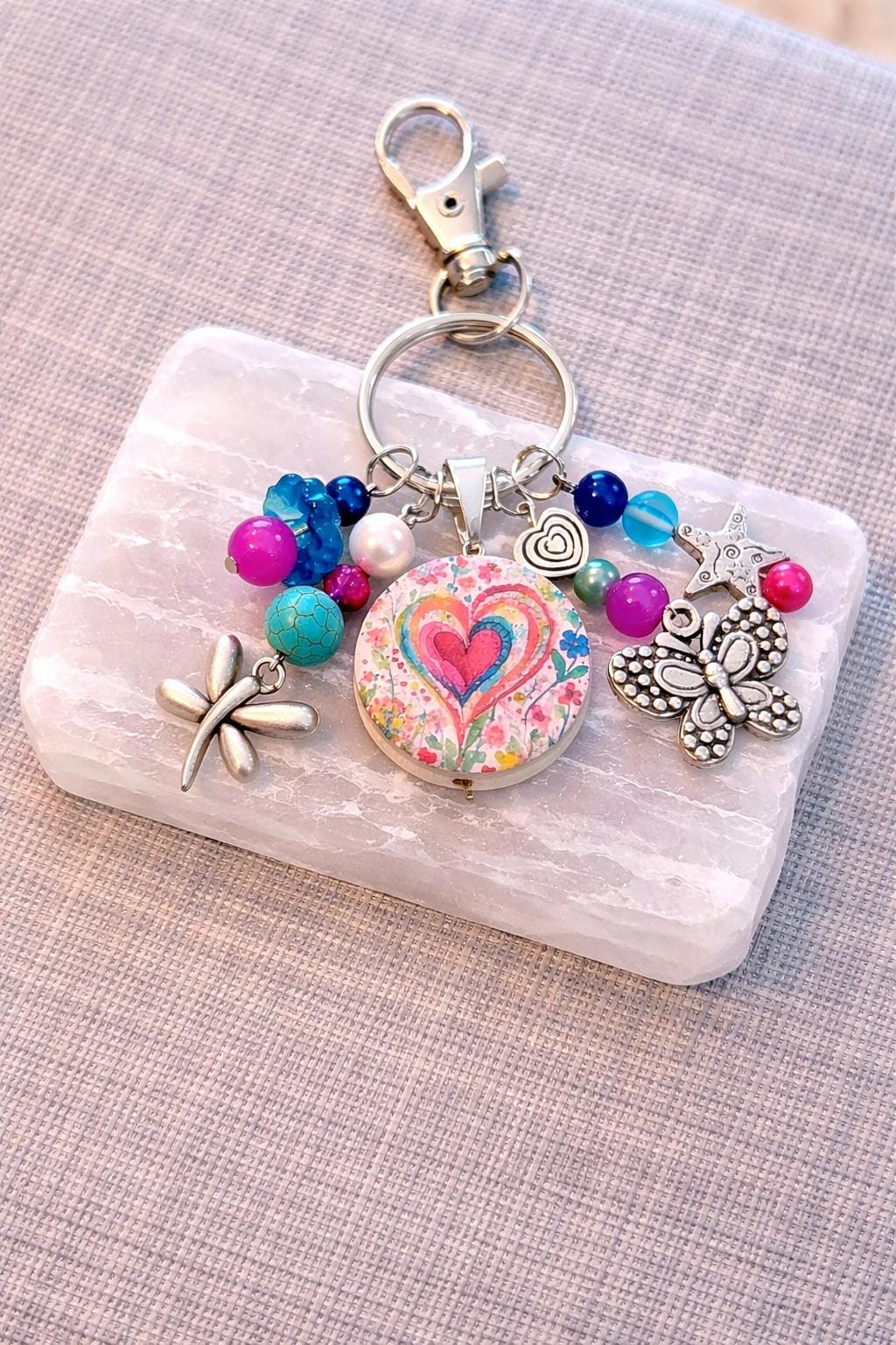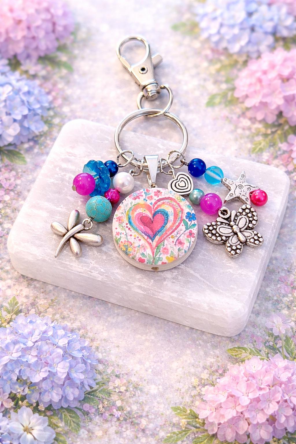 Enchanted Heart Garden Charm Keychain, Reiki Infused Gemstone Purse Charm, Butterfly Dragonfly Keychain, Colorful Boho Gift for Her