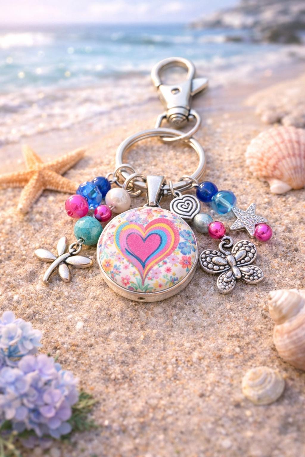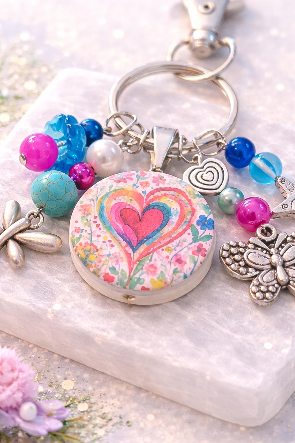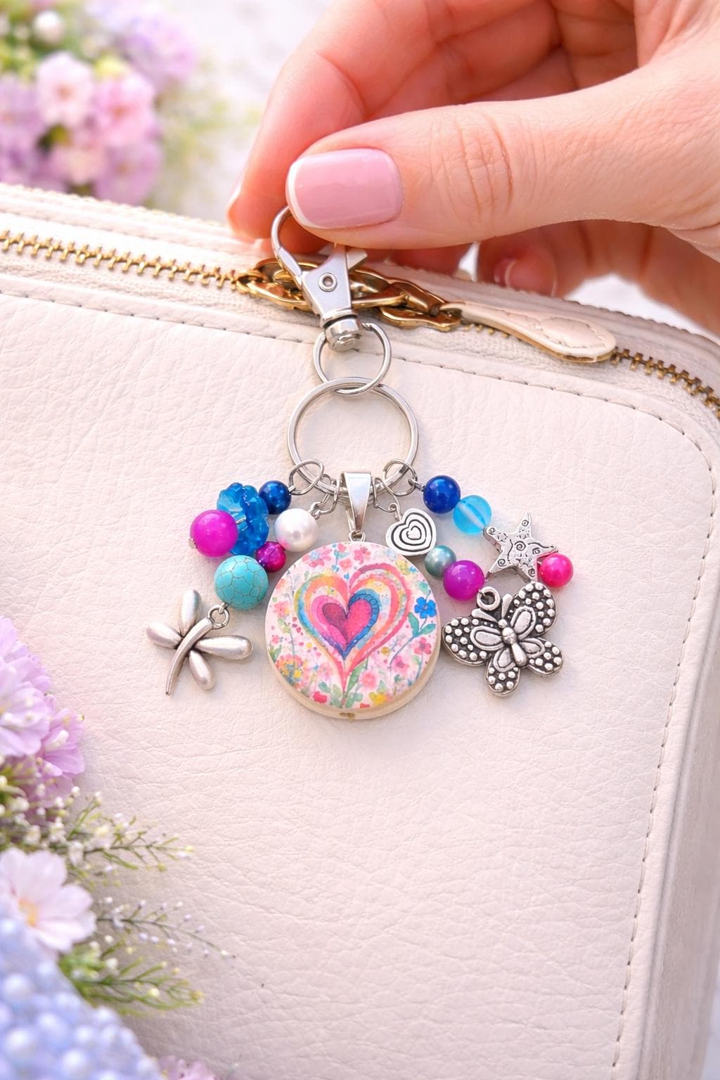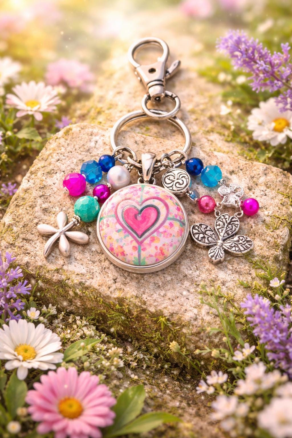 Enchanted Heart Garden Charm Keychain, Reiki Infused Gemstone Purse Charm, Butterfly Dragonfly Keychain, Colorful Boho Gift for Her