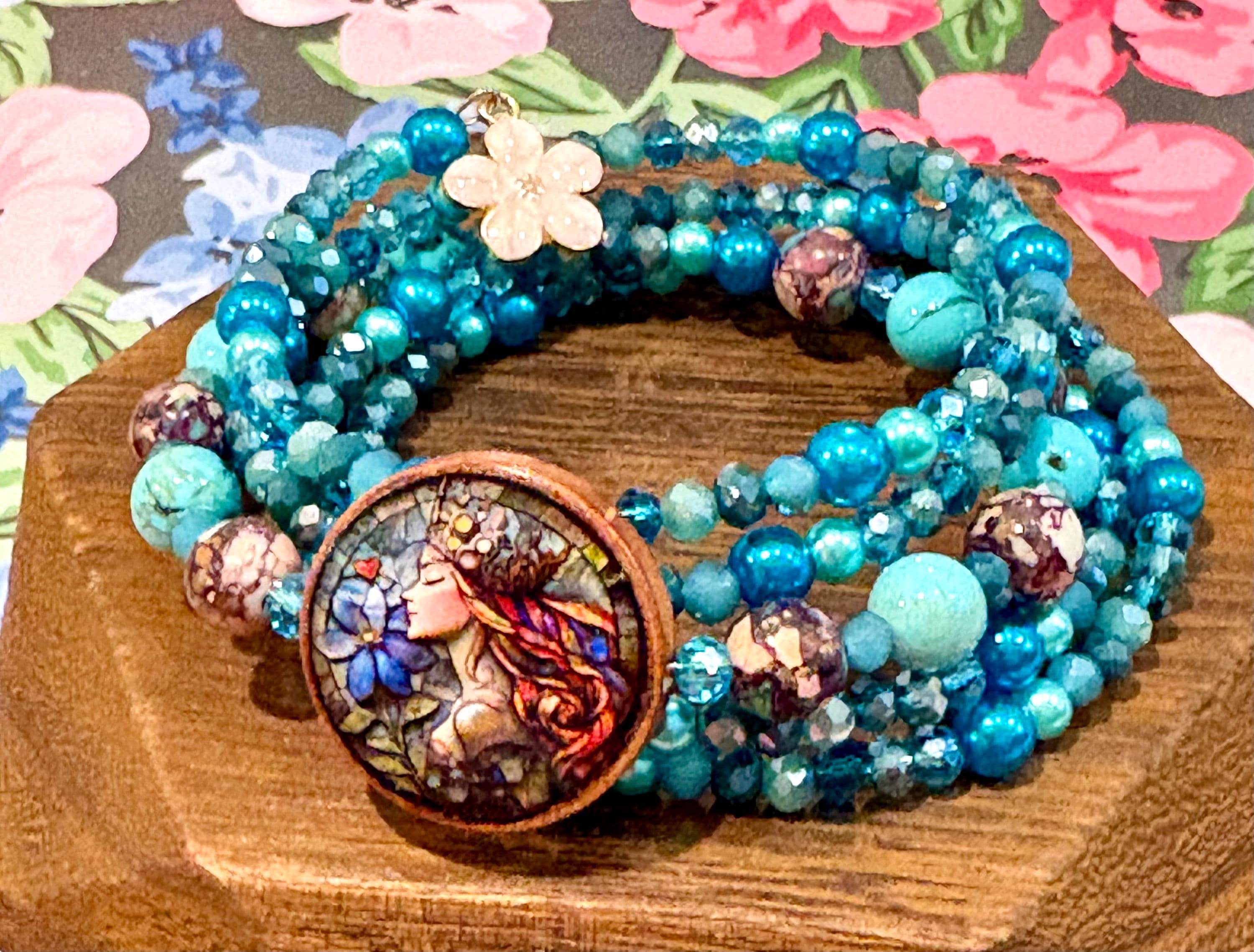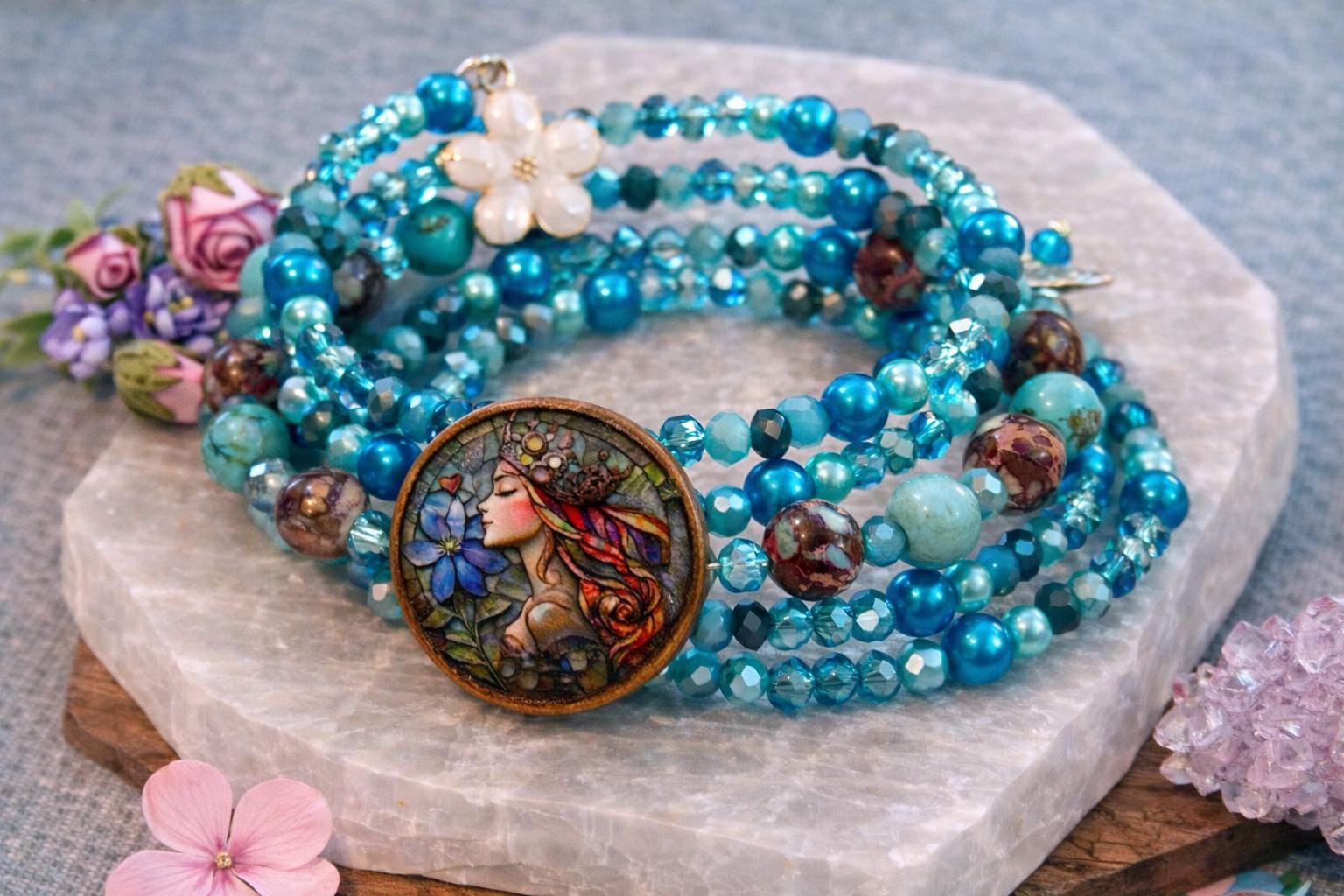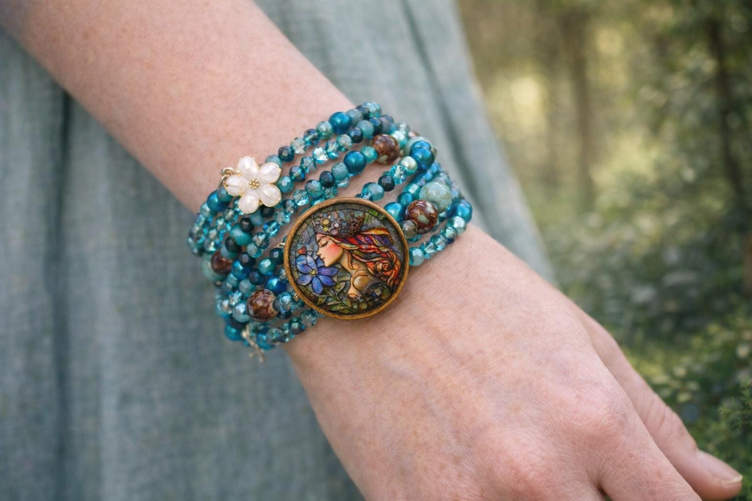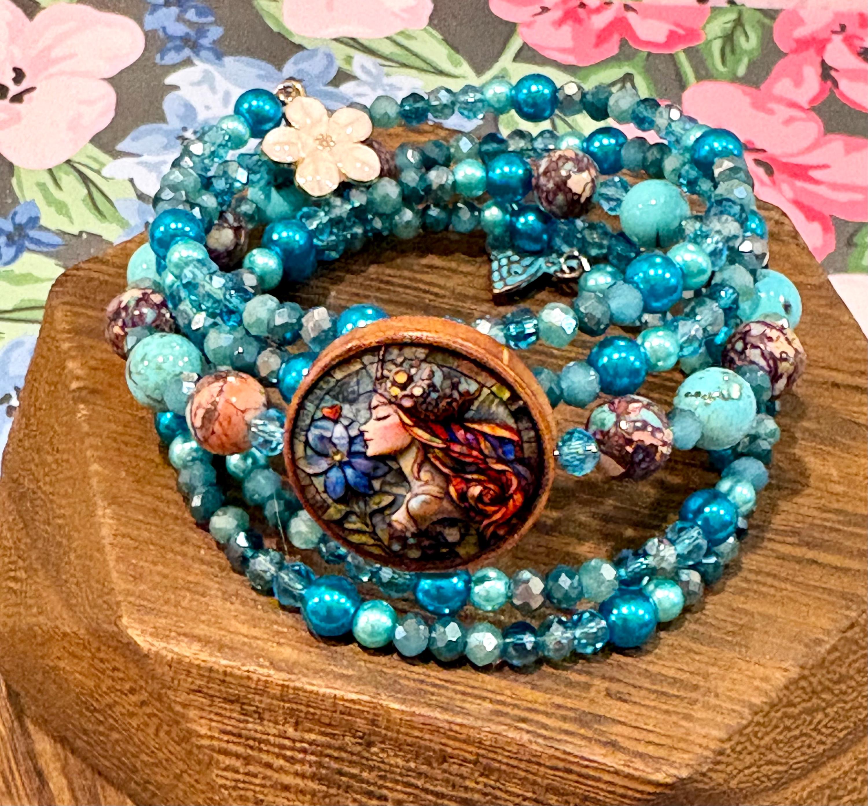 The Enchanted Ocean Muse Wrap Bracelet captures the essence of flowing water, inner strength, and feminine beauty. Centered around a stunning artisan wooden focal bead featuring a serene muse, this piece feels like a wearable work of art.