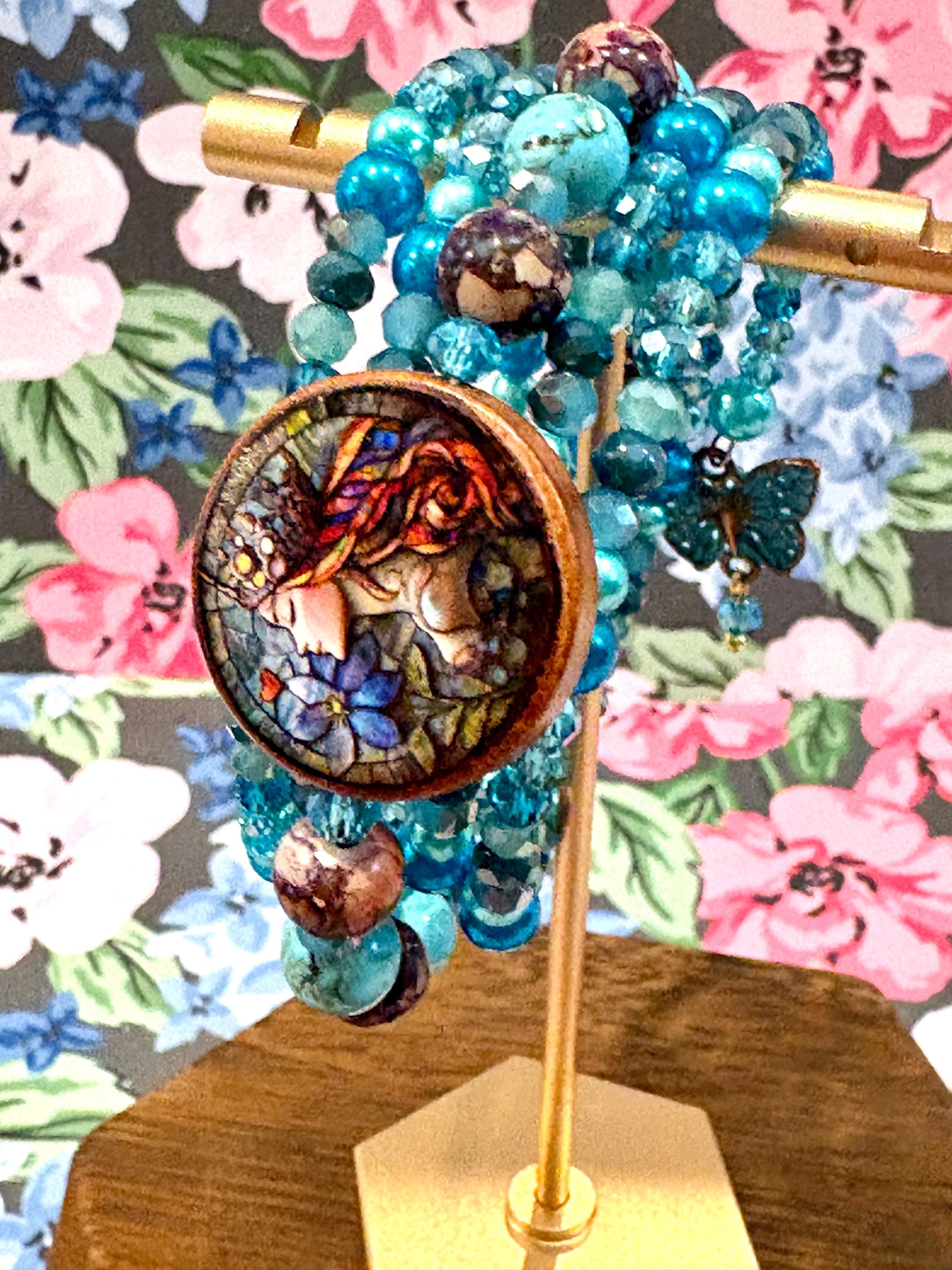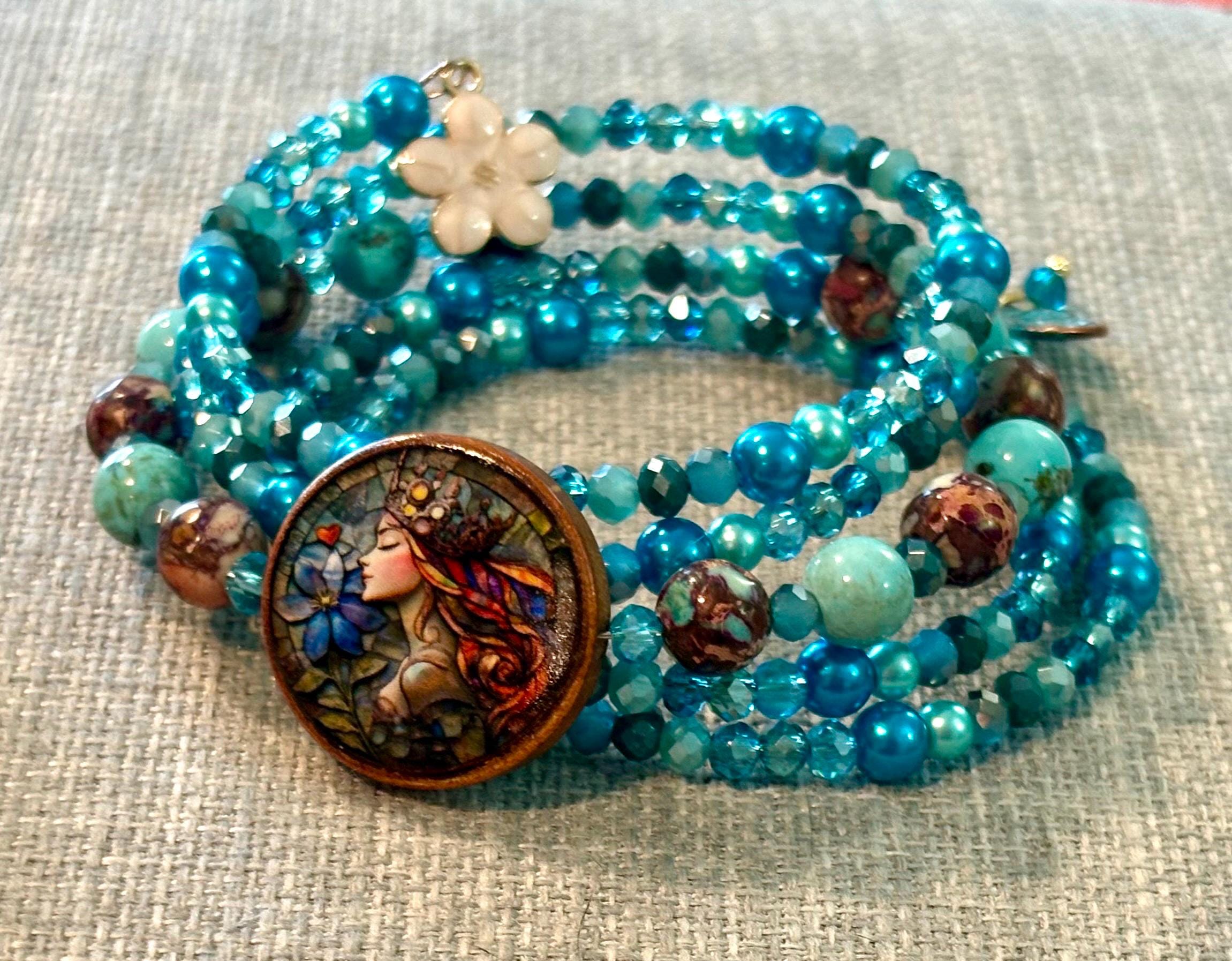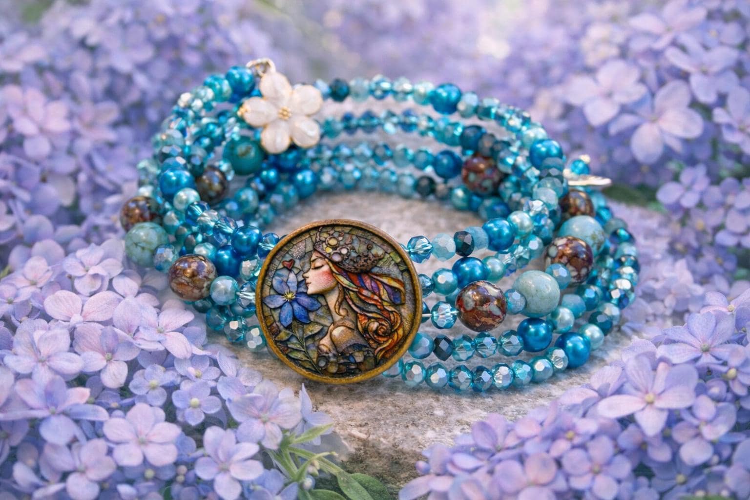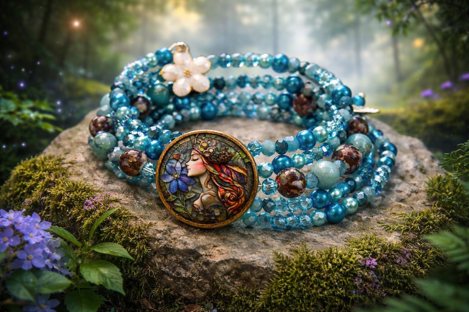 The Enchanted Ocean Muse Wrap Bracelet captures the essence of flowing water, inner strength, and feminine beauty. Centered around a stunning artisan wooden focal bead featuring a serene muse, this piece feels like a wearable work of art.