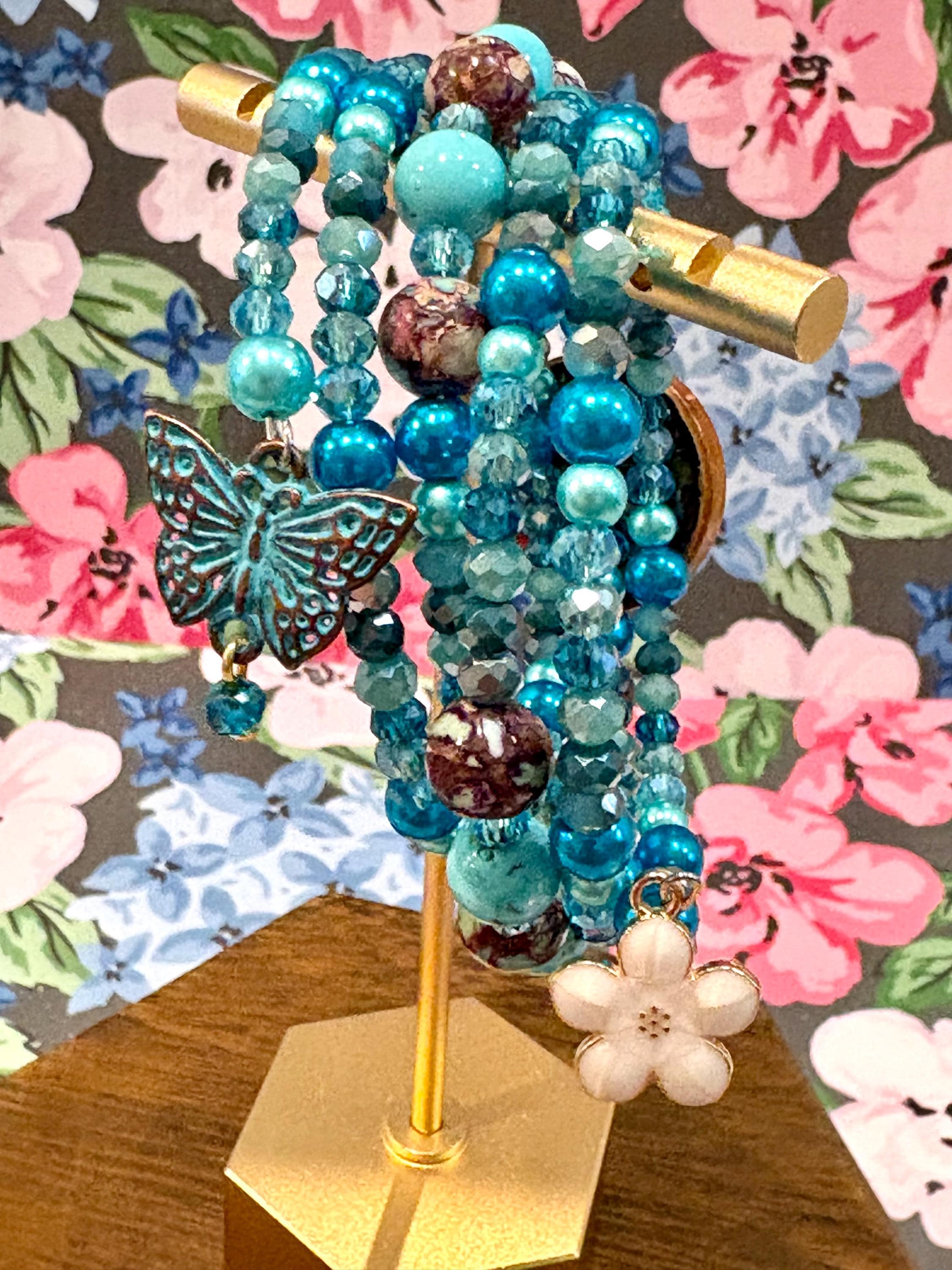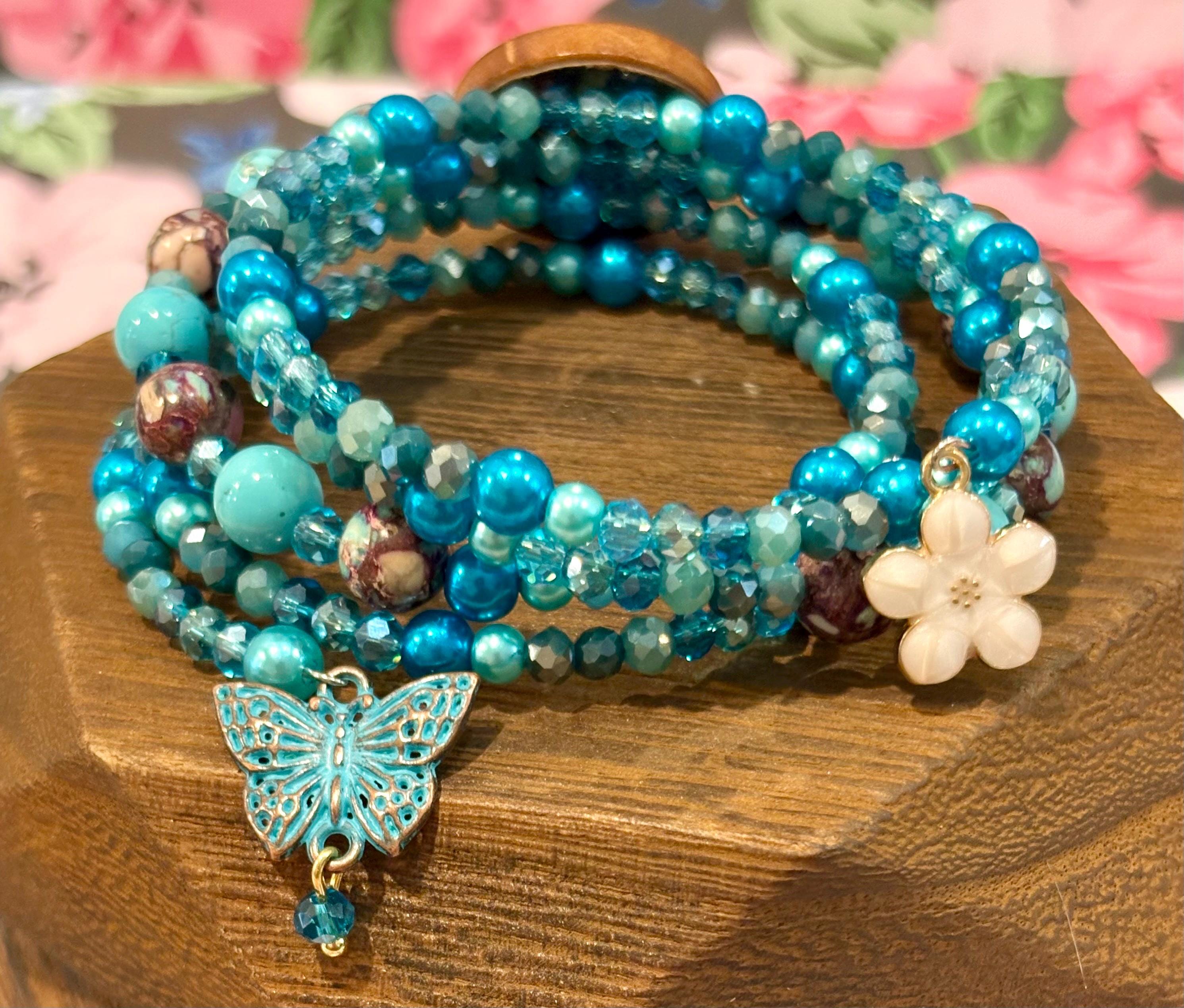 Layers of ocean-inspired blues, shimmering crystals, and earthy gemstones wrap gracefully around your wrist, creating a look that is both grounding and ethereal 💙