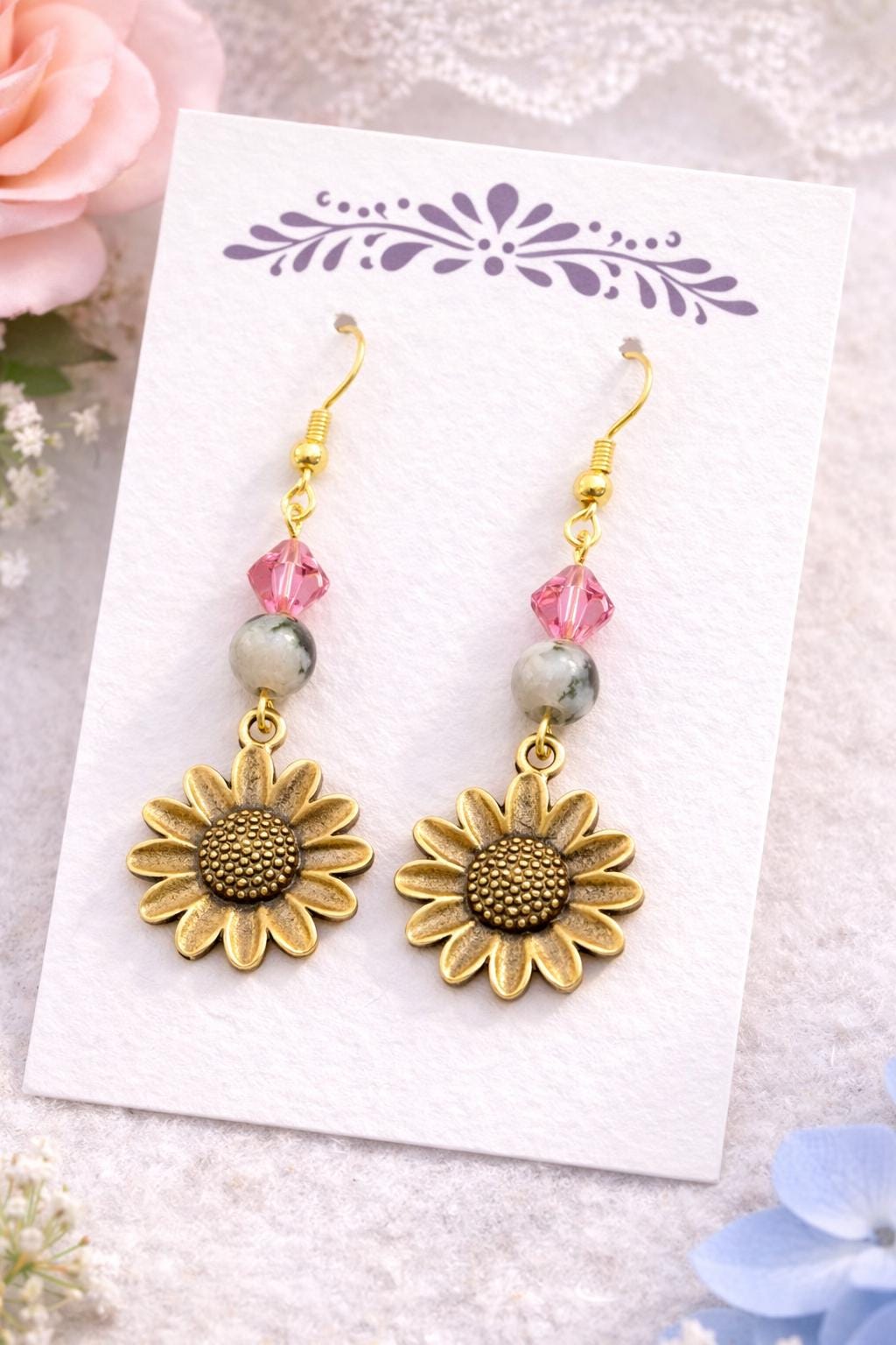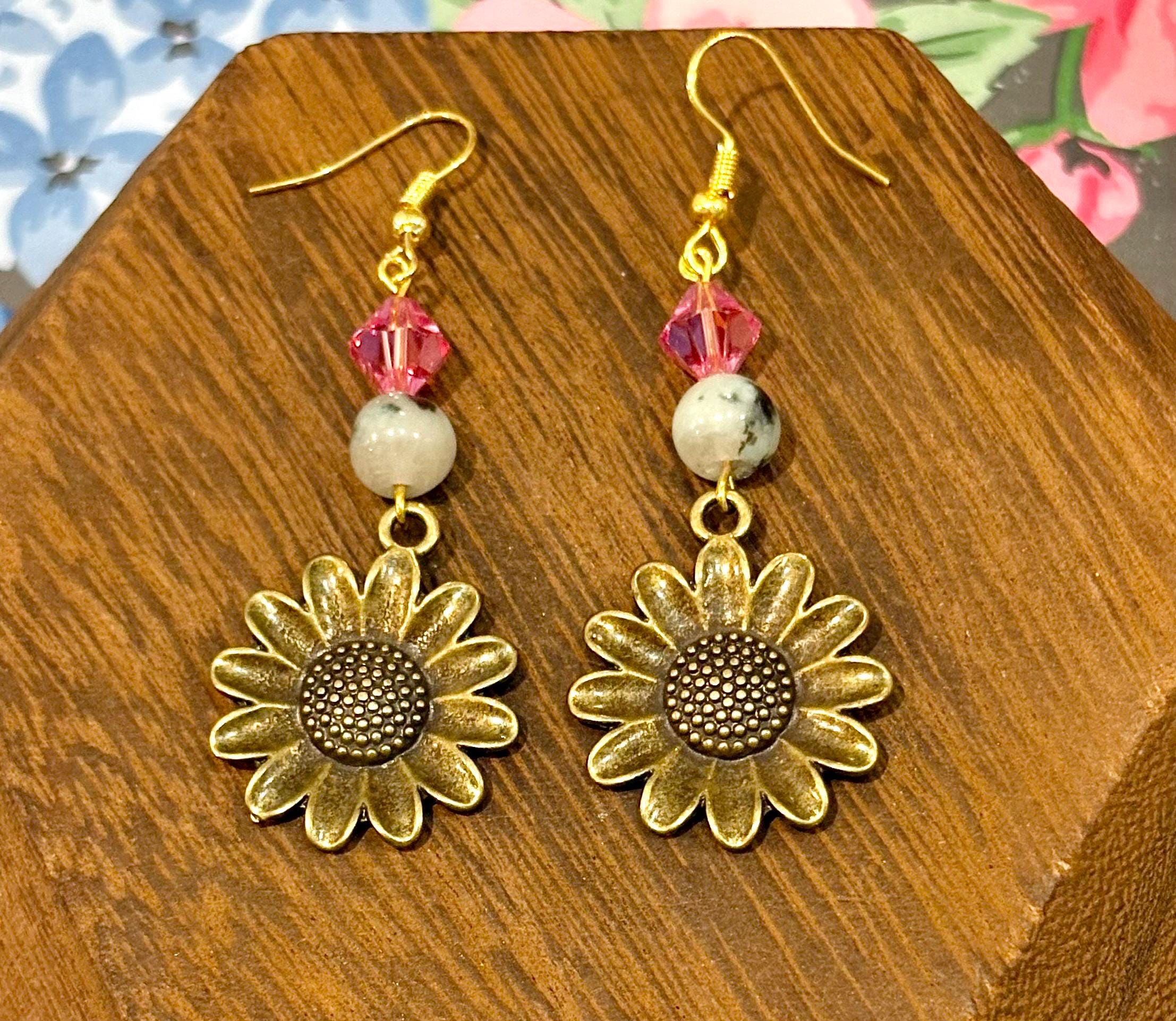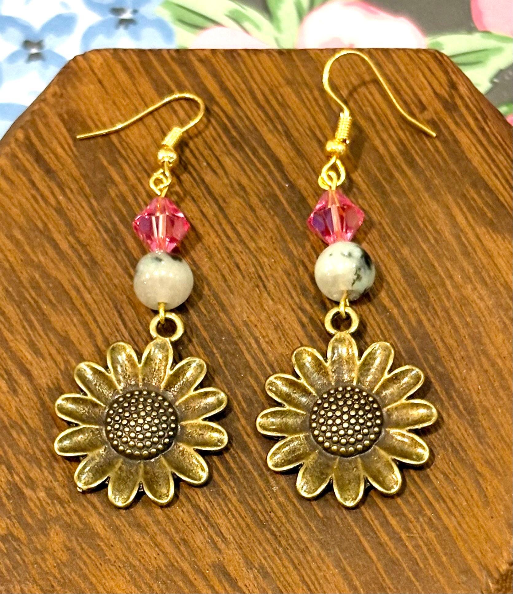 Antique Bronze Sunflower Earrings, Kiwi Jasper & Pink Crystal Dangle Boho Floral Jewelry