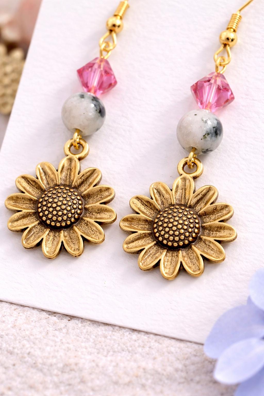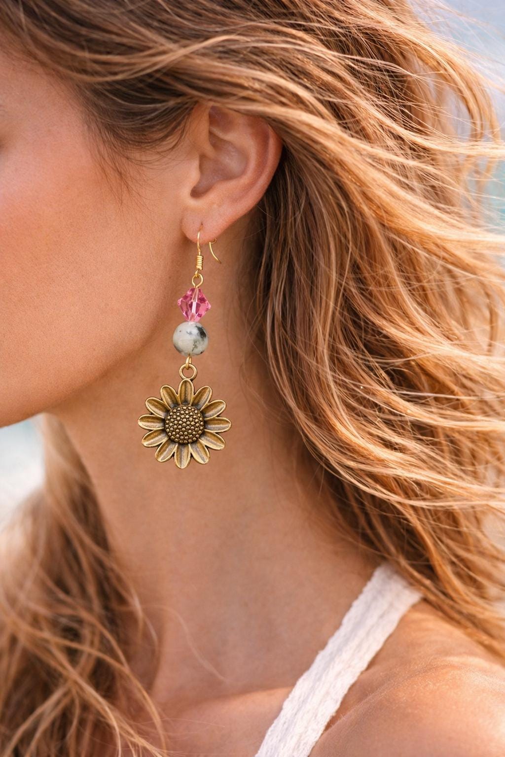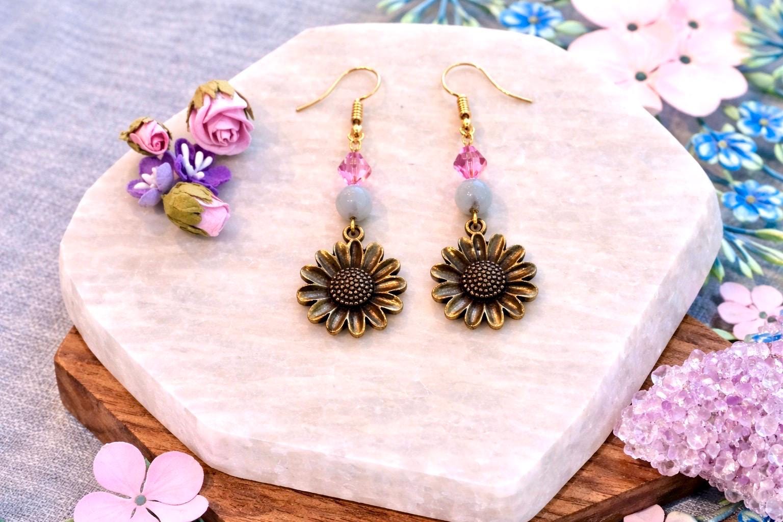 These enchanting sunflower earrings are a radiant blend of earthy grounding and soft feminine sparkle—perfect for brightening your day and your energy.