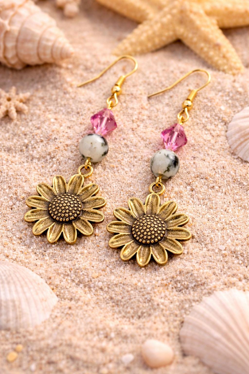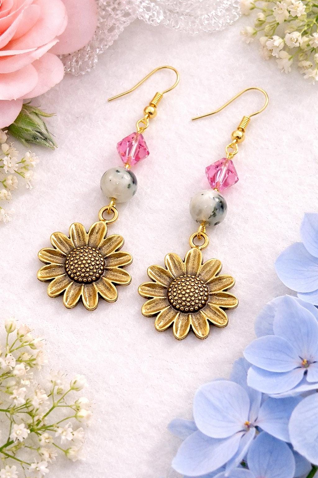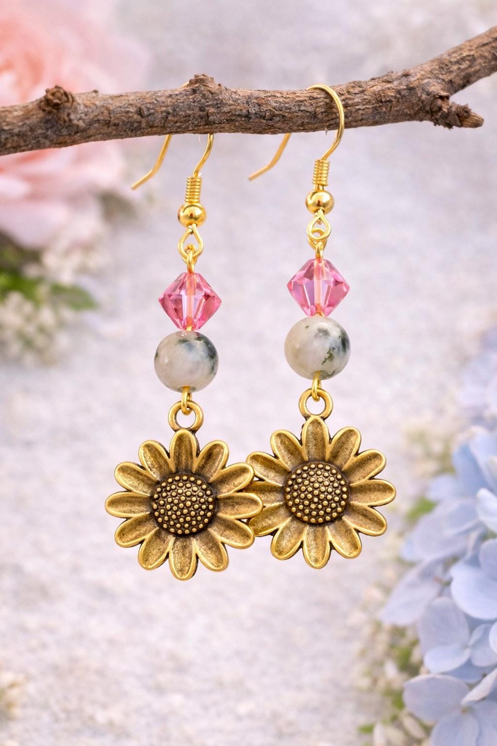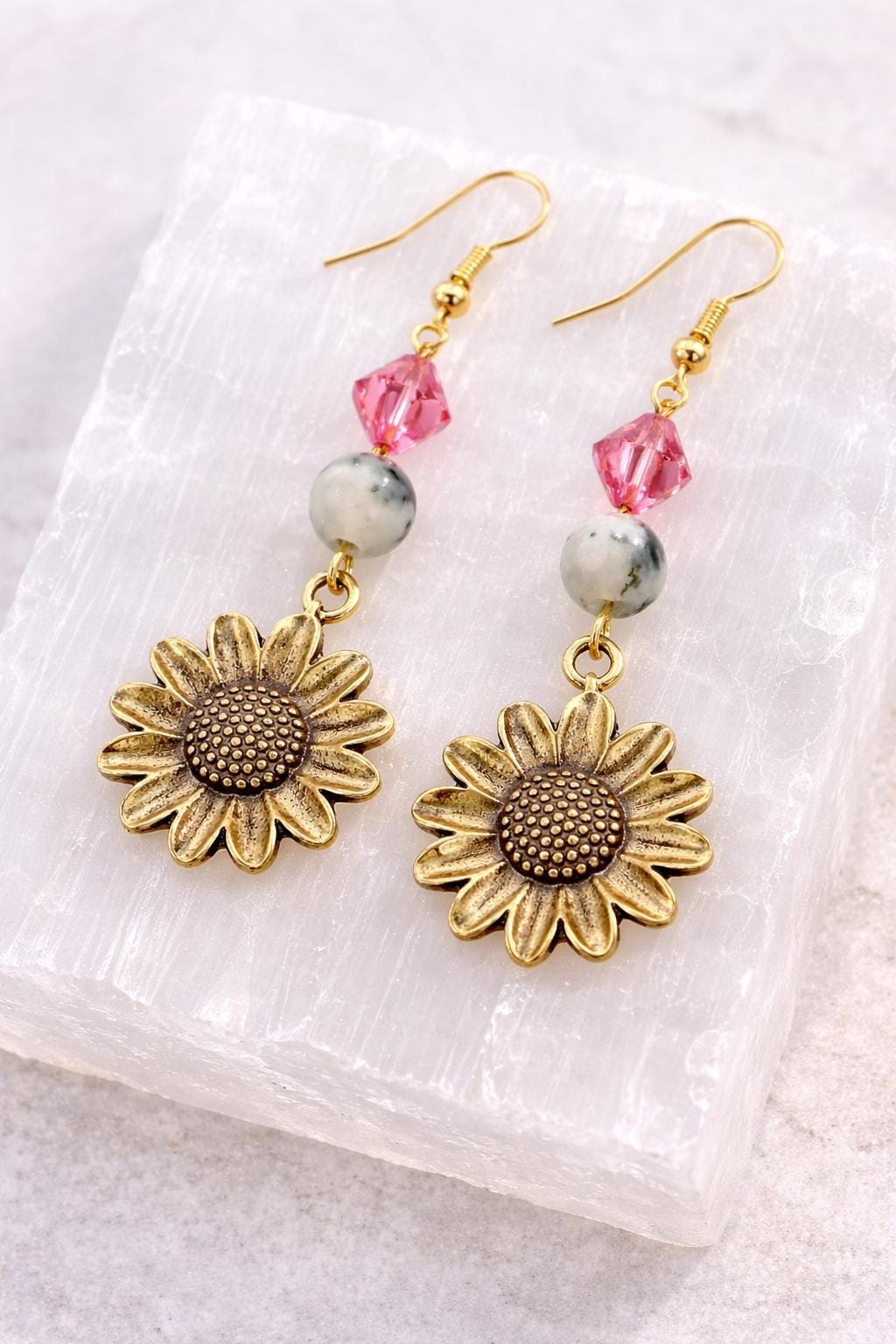 These enchanting sunflower earrings are a radiant blend of earthy grounding and soft feminine sparkle—perfect for brightening your day and your energy.