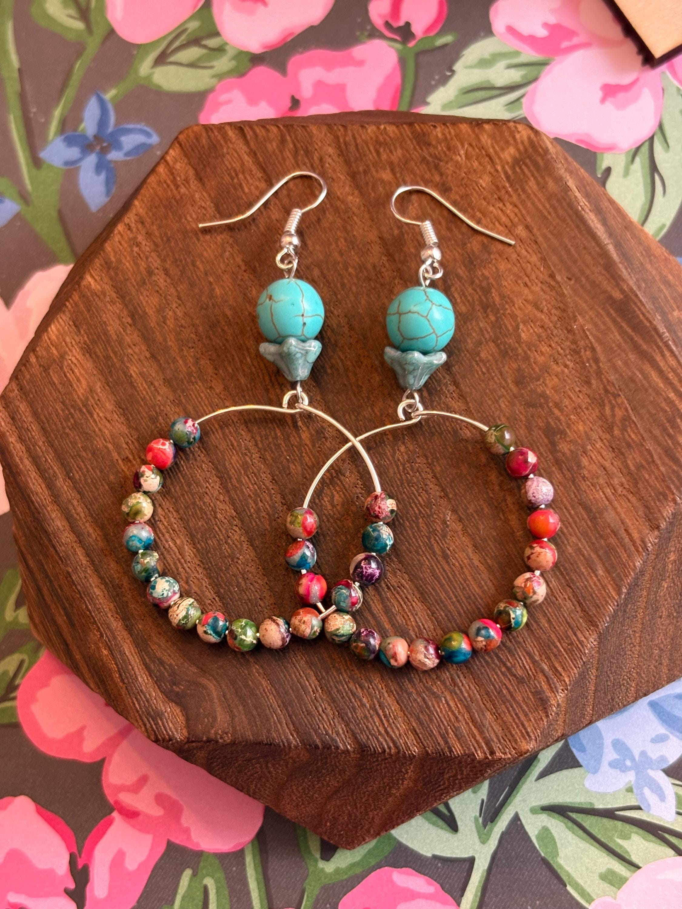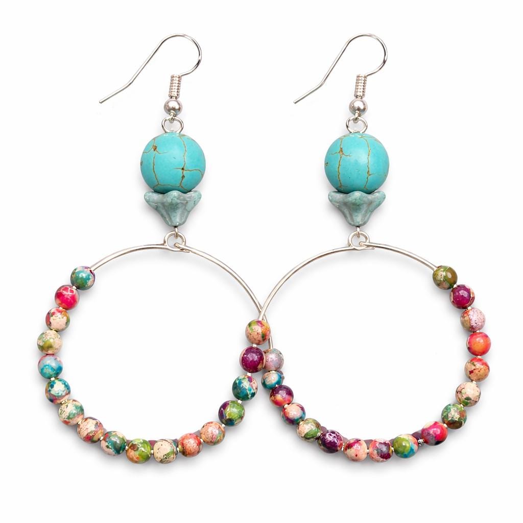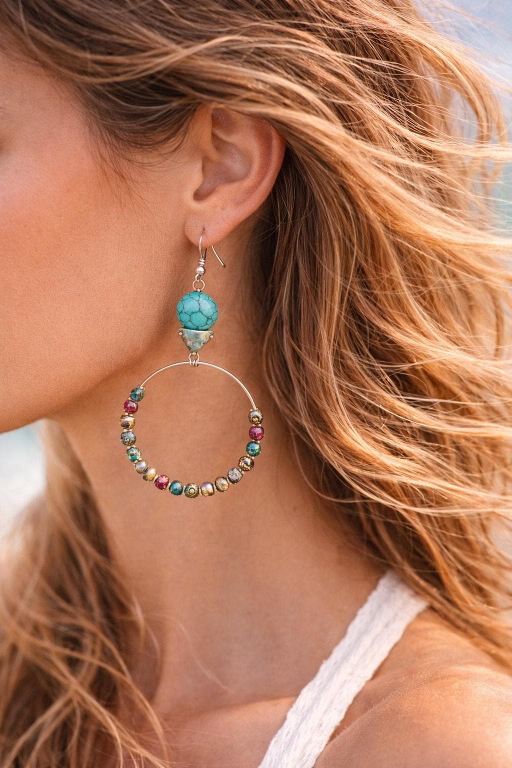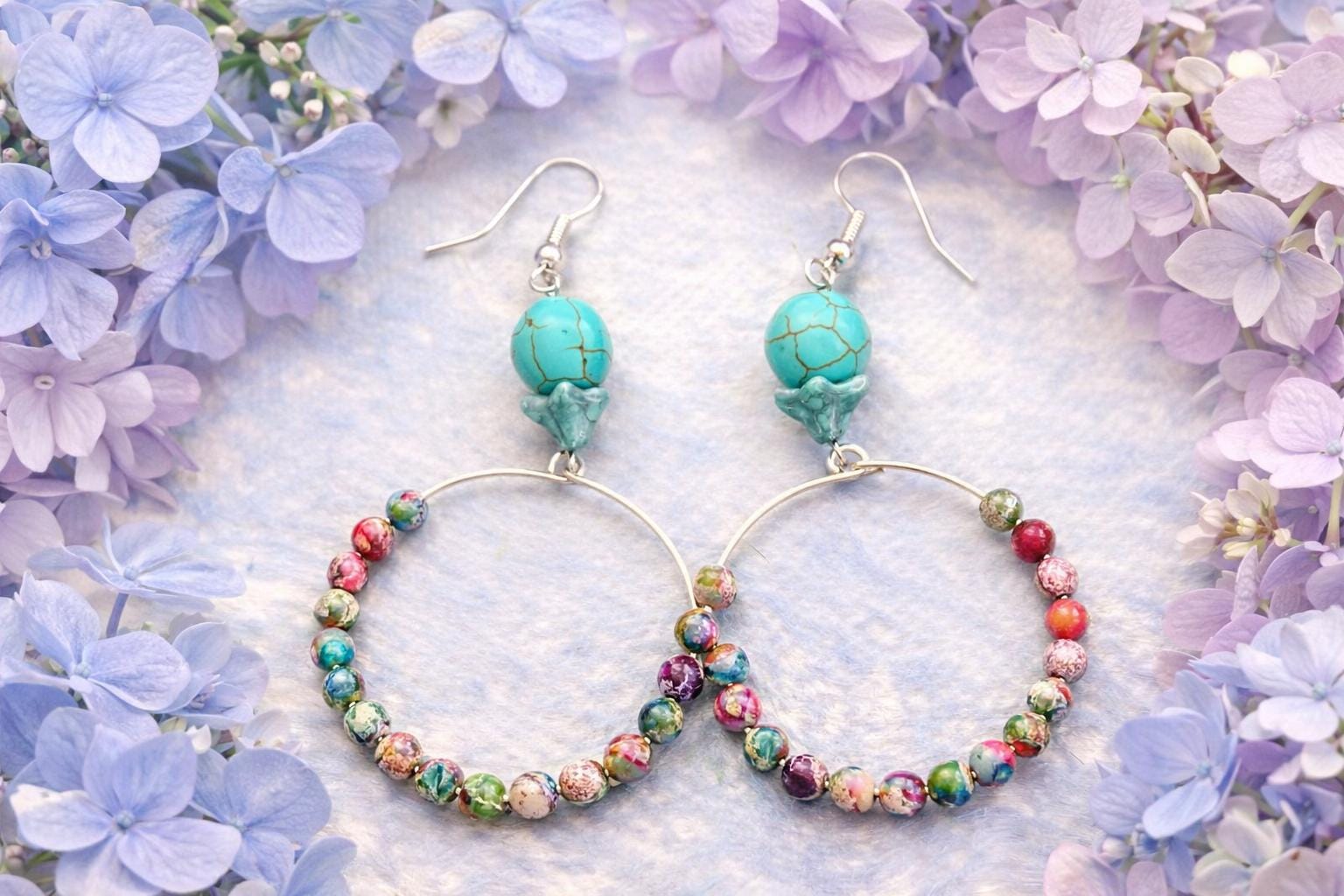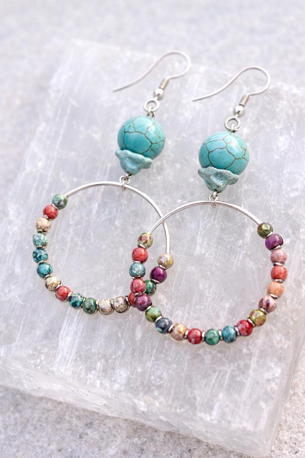 Multicolor Beaded Hoop Earrings, Turquoise Magnesite Boho Statement Jewelry