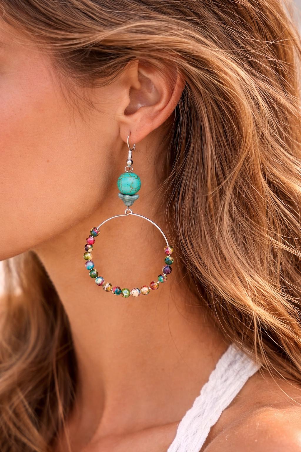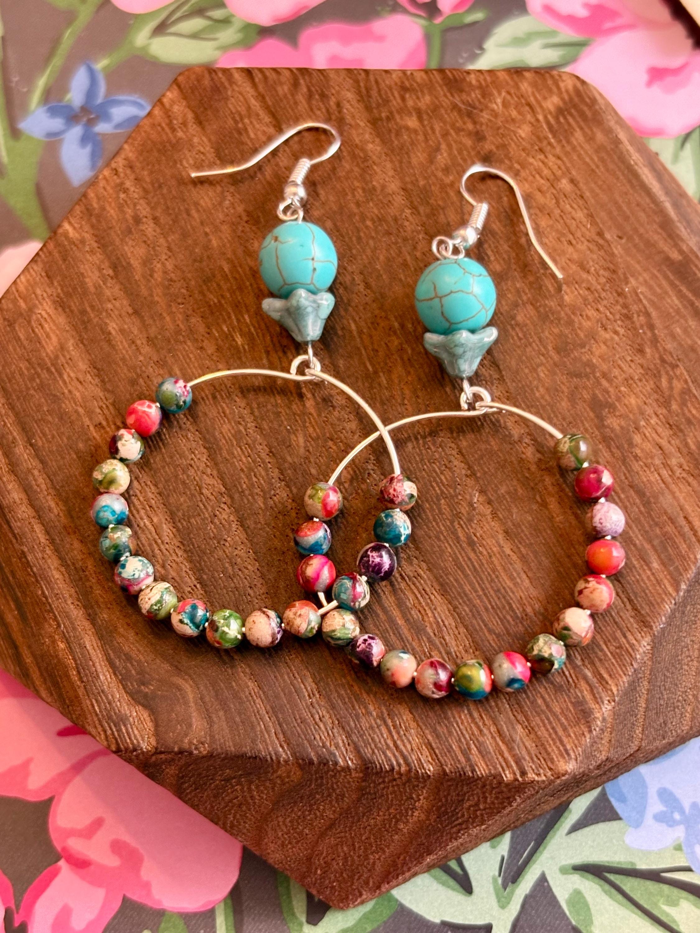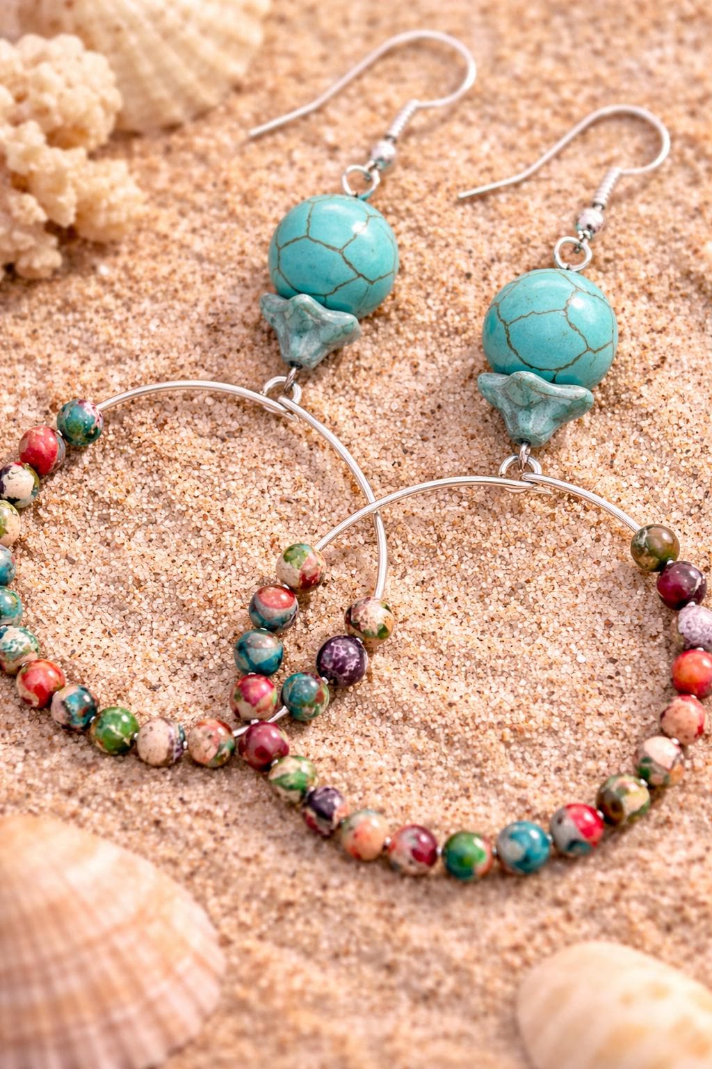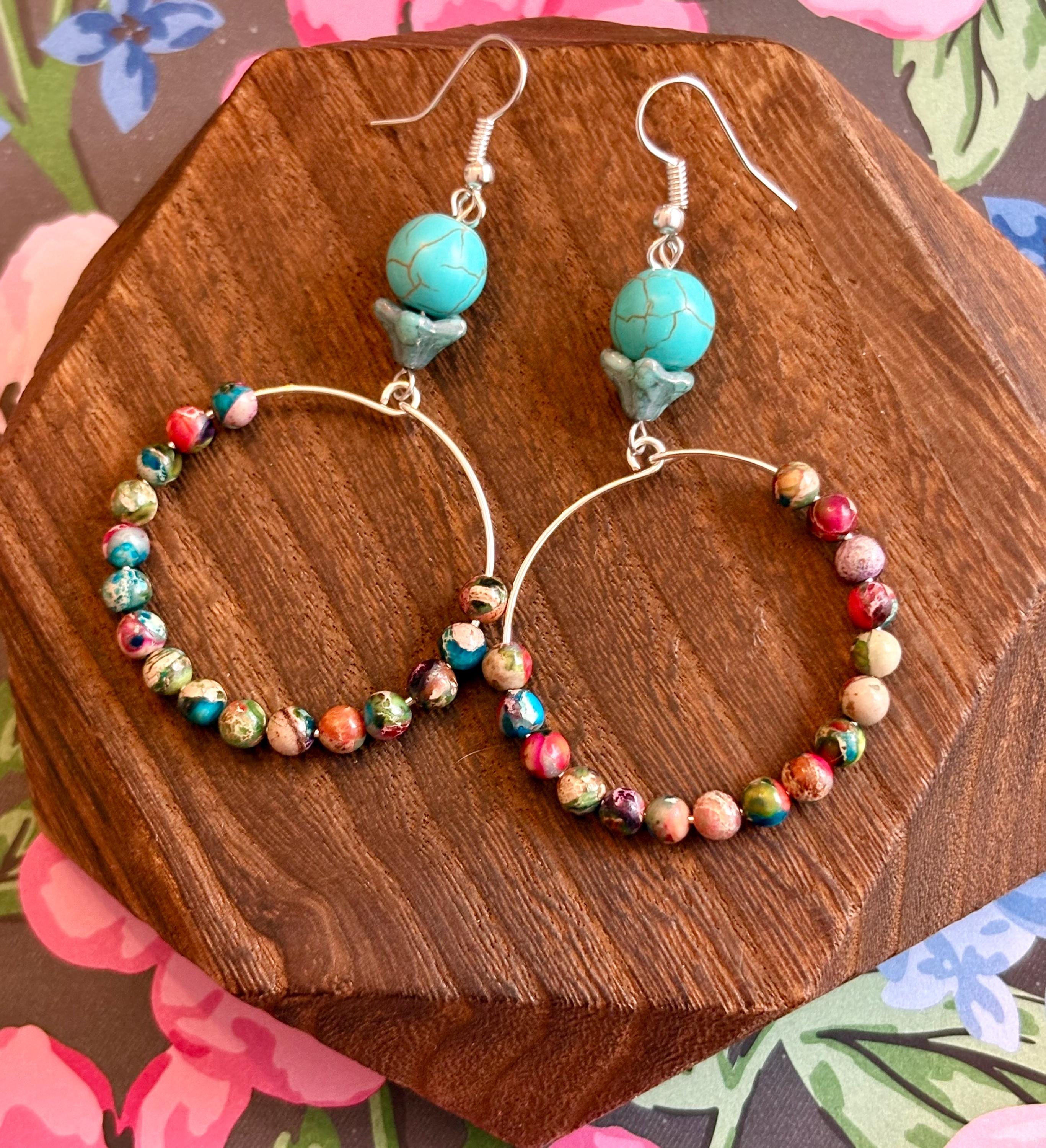Multicolor Beaded Hoop Earrings, Turquoise Magnesite Boho Statement Jewelry
