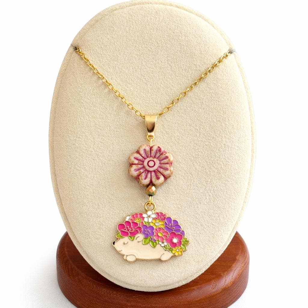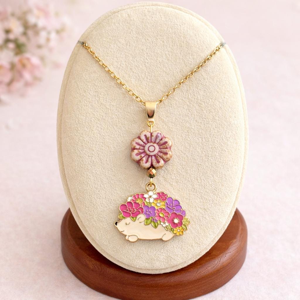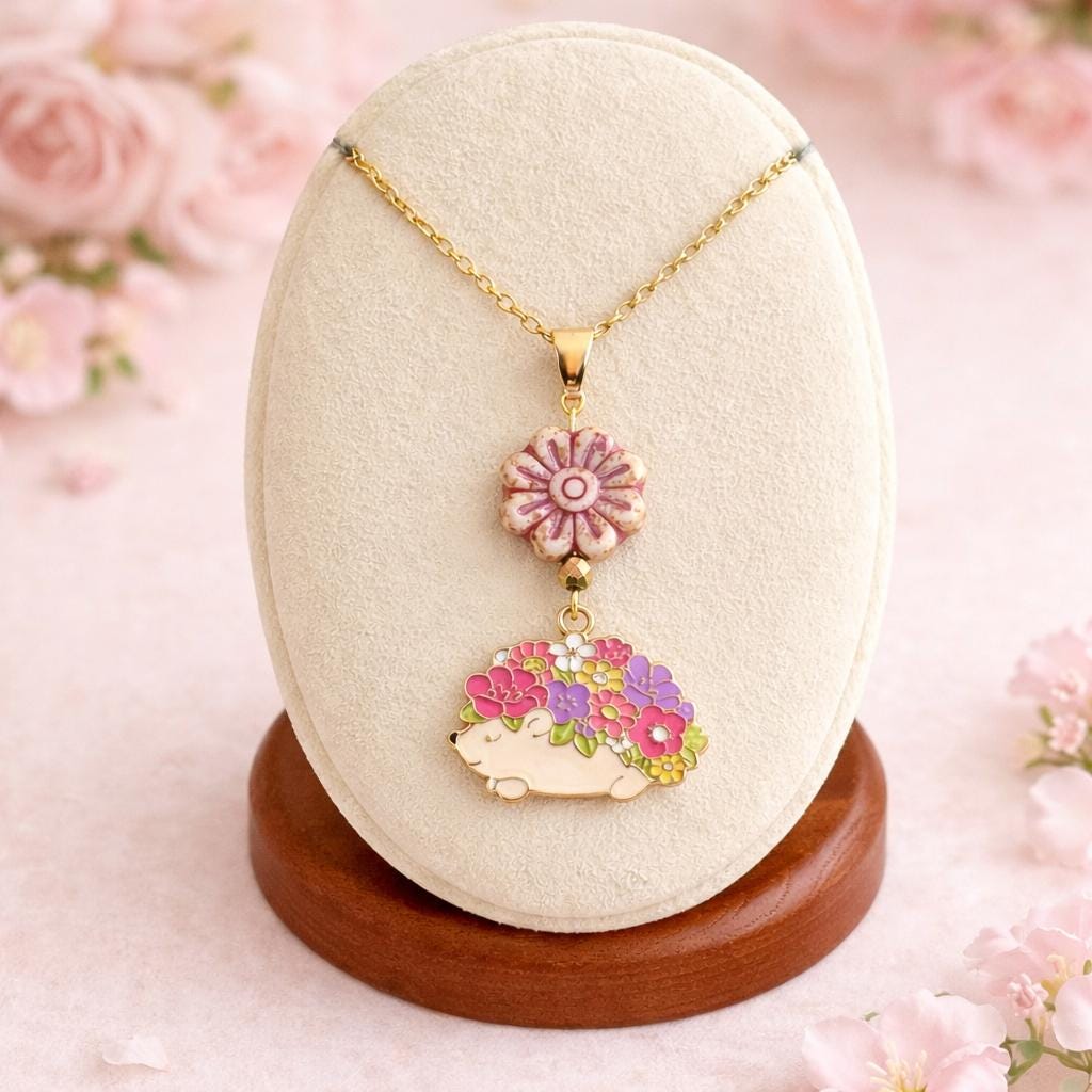 This whimsical piece features delicate Czech glass florals, shimmering hematite gemstones in soft romantic hues, and an adorable enamel hedgehog blooming with colorful flowers. It’s a sweet reminder of gentle beauty, nature, and quiet magic ✨
