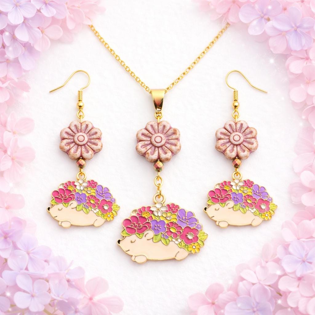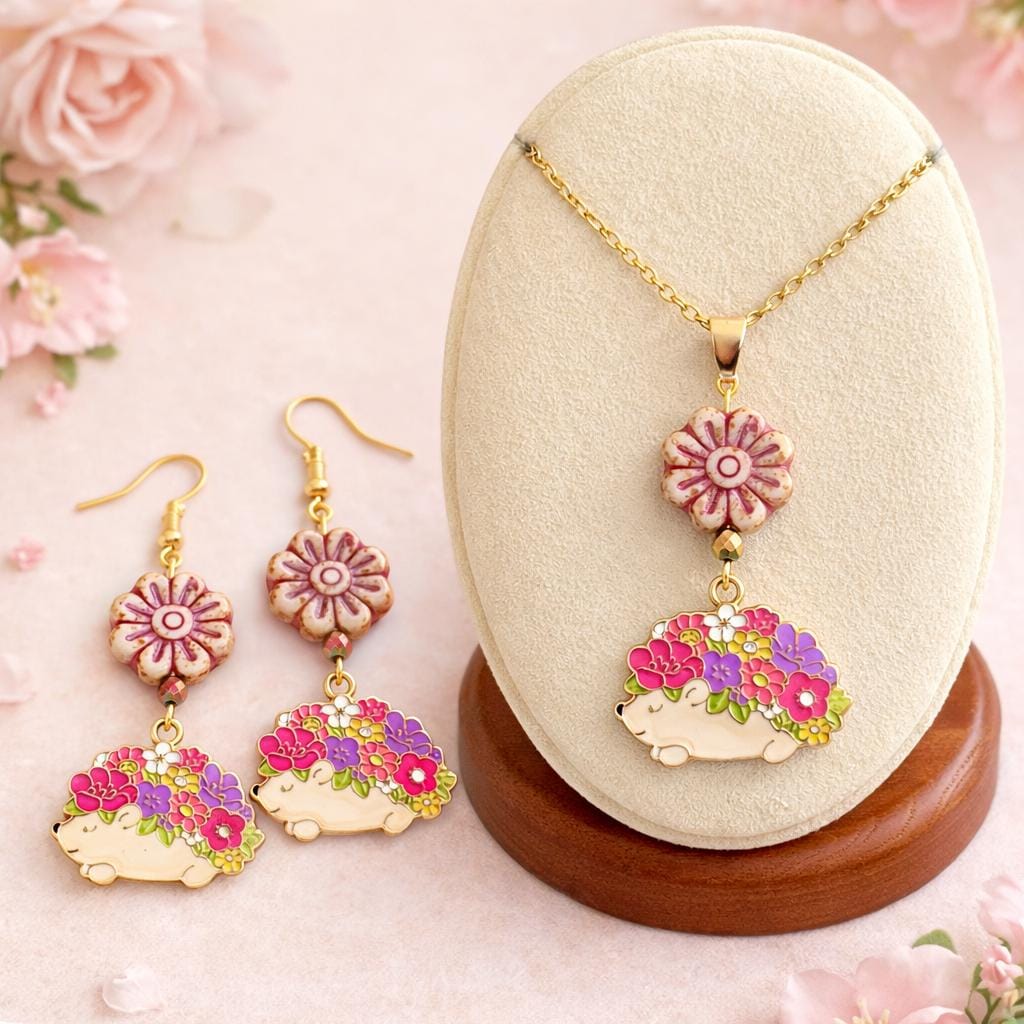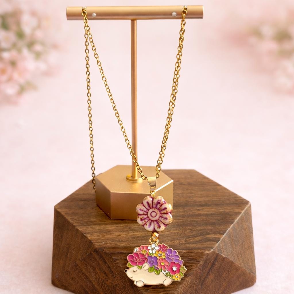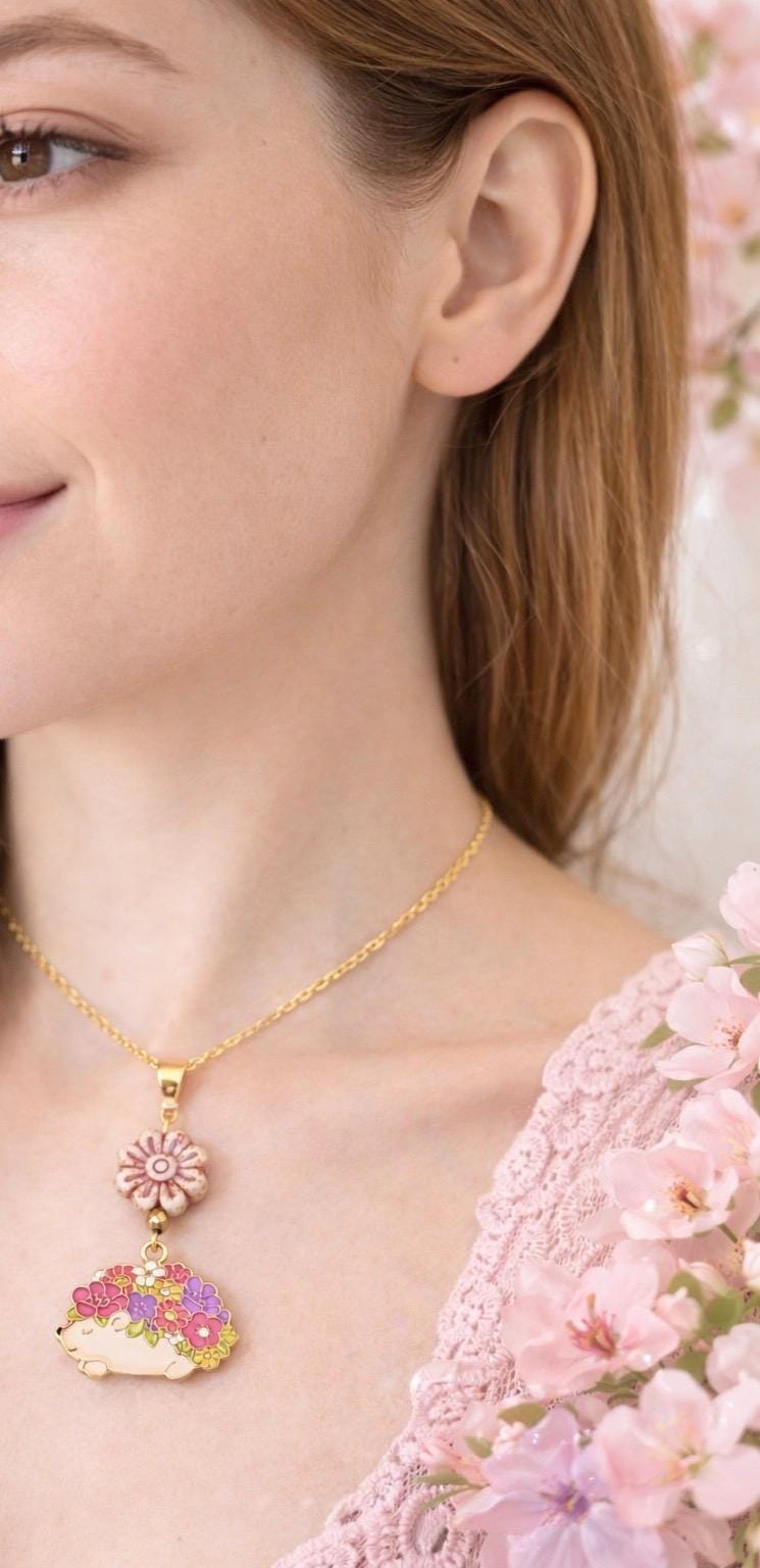 This whimsical piece features delicate Czech glass florals, shimmering hematite gemstones in soft romantic hues, and an adorable enamel hedgehog blooming with colorful flowers. It’s a sweet reminder of gentle beauty, nature, and quiet magic ✨