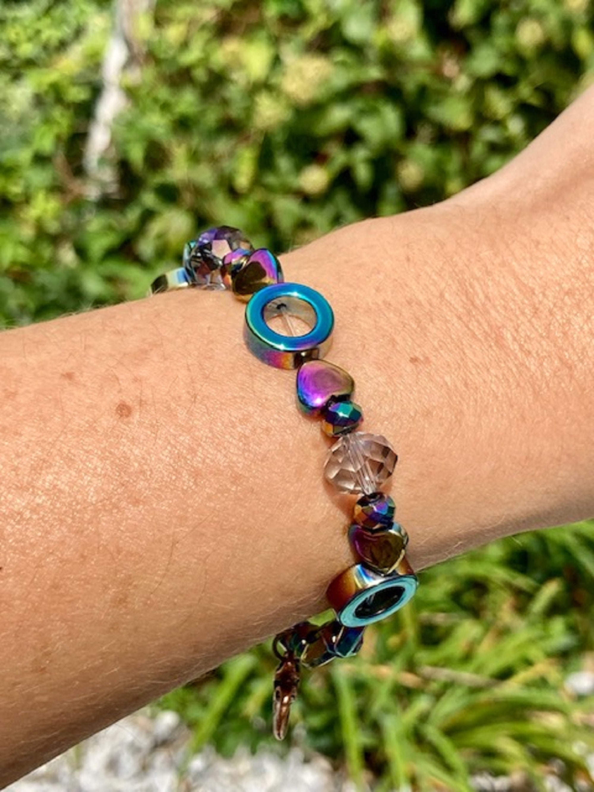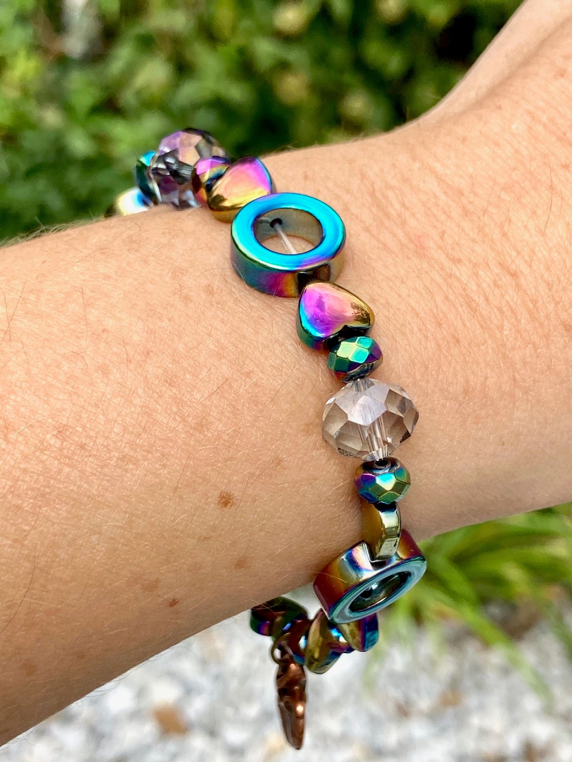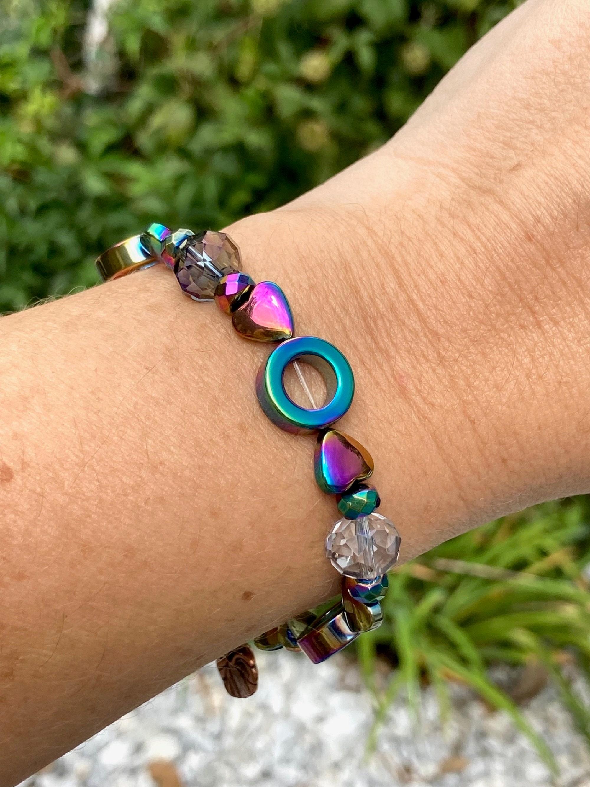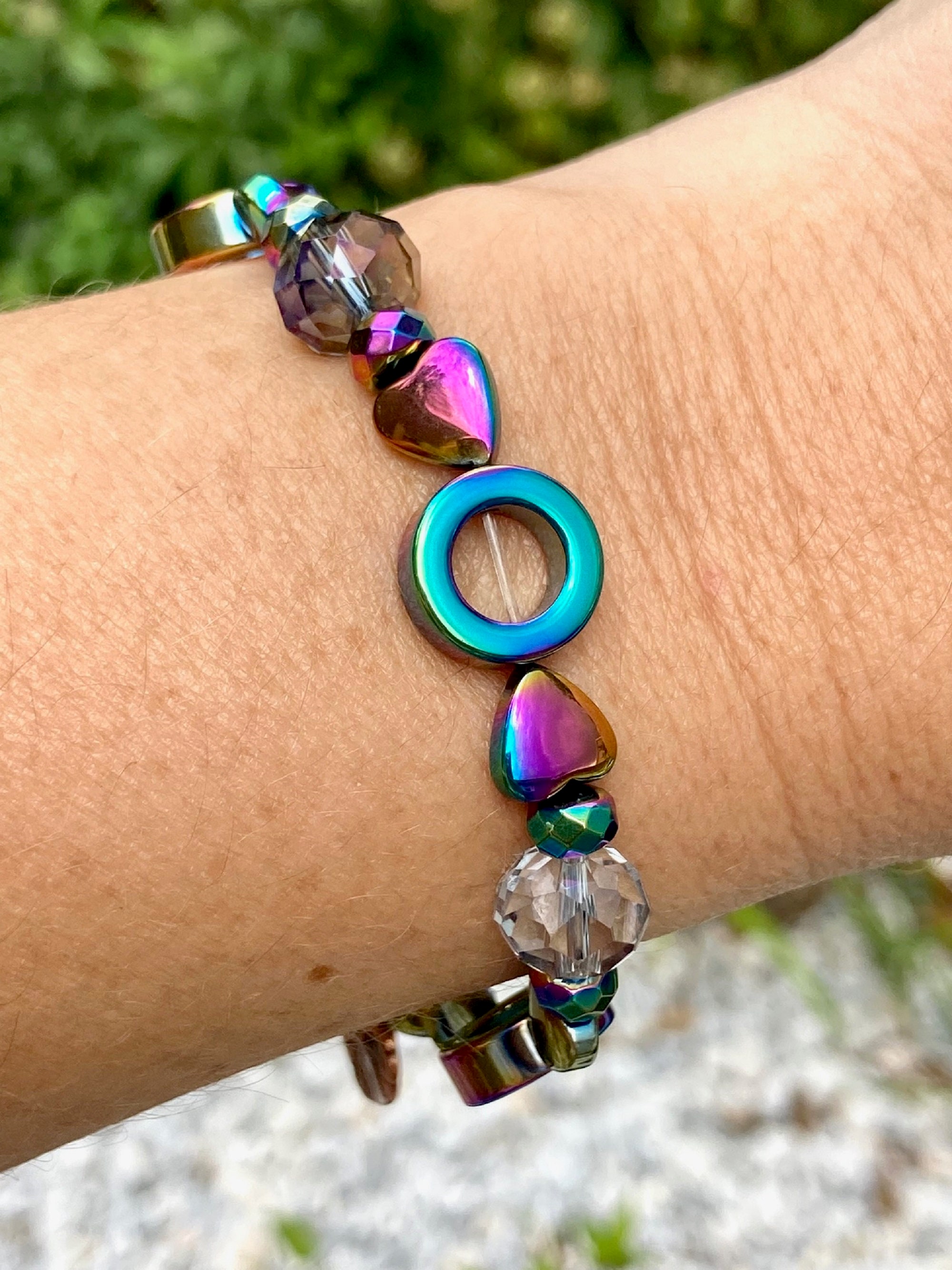 These are stunning and shimmery, Titanium Rainbow Hematite Gemstone beaded stretch bracelets. They have gorgeous rainbow beads of rim halos, love hearts, and faceted crystals.