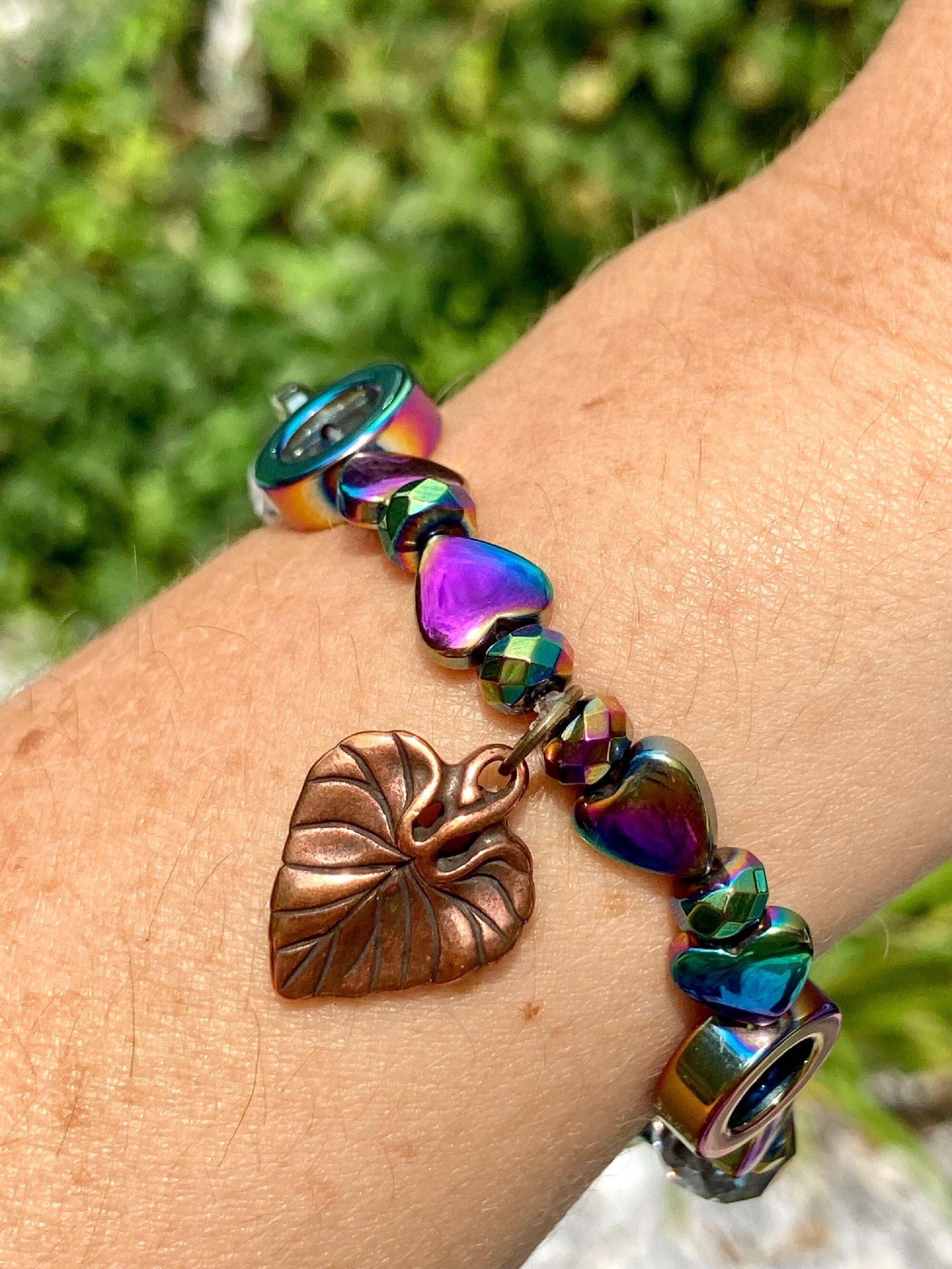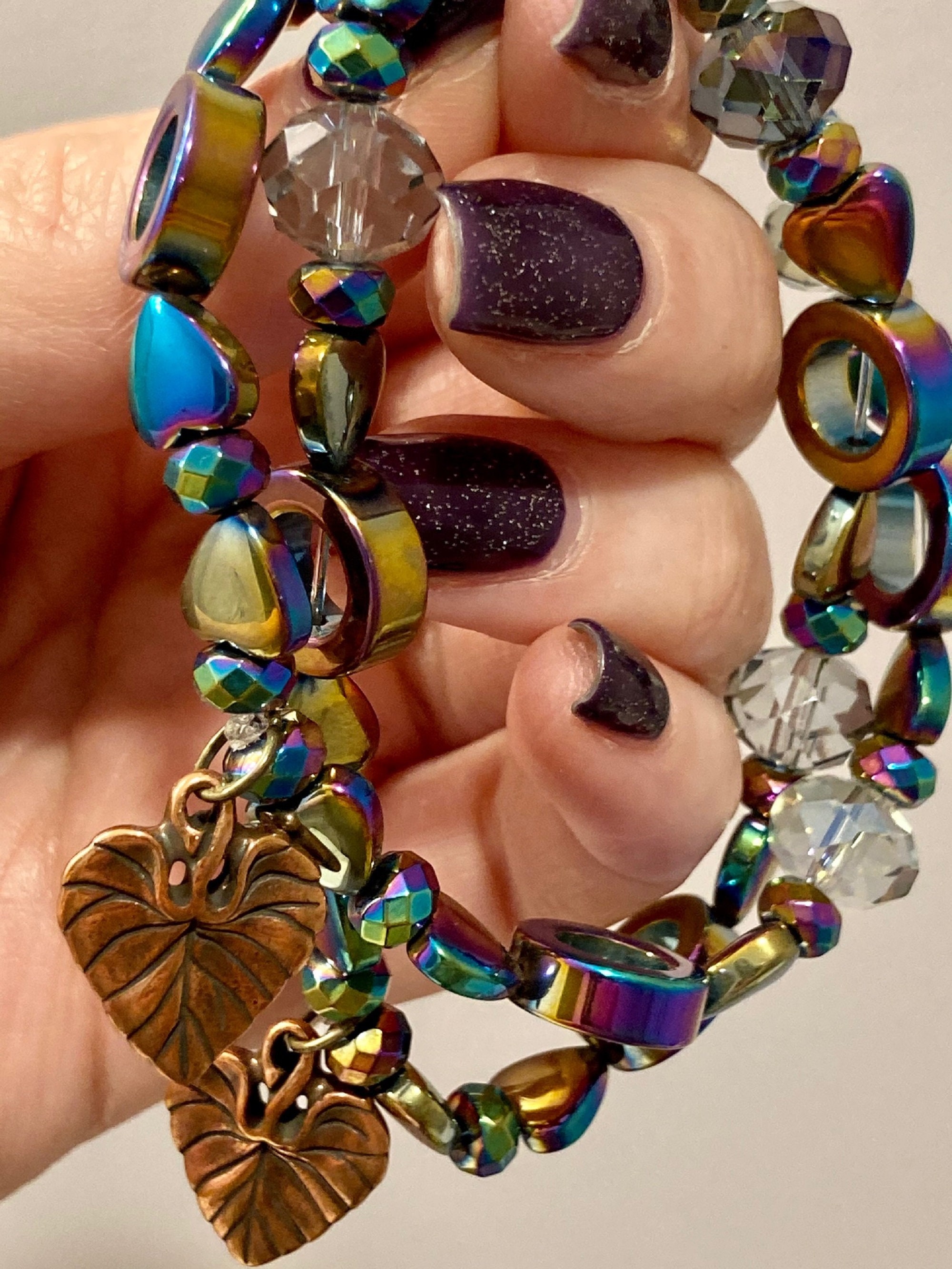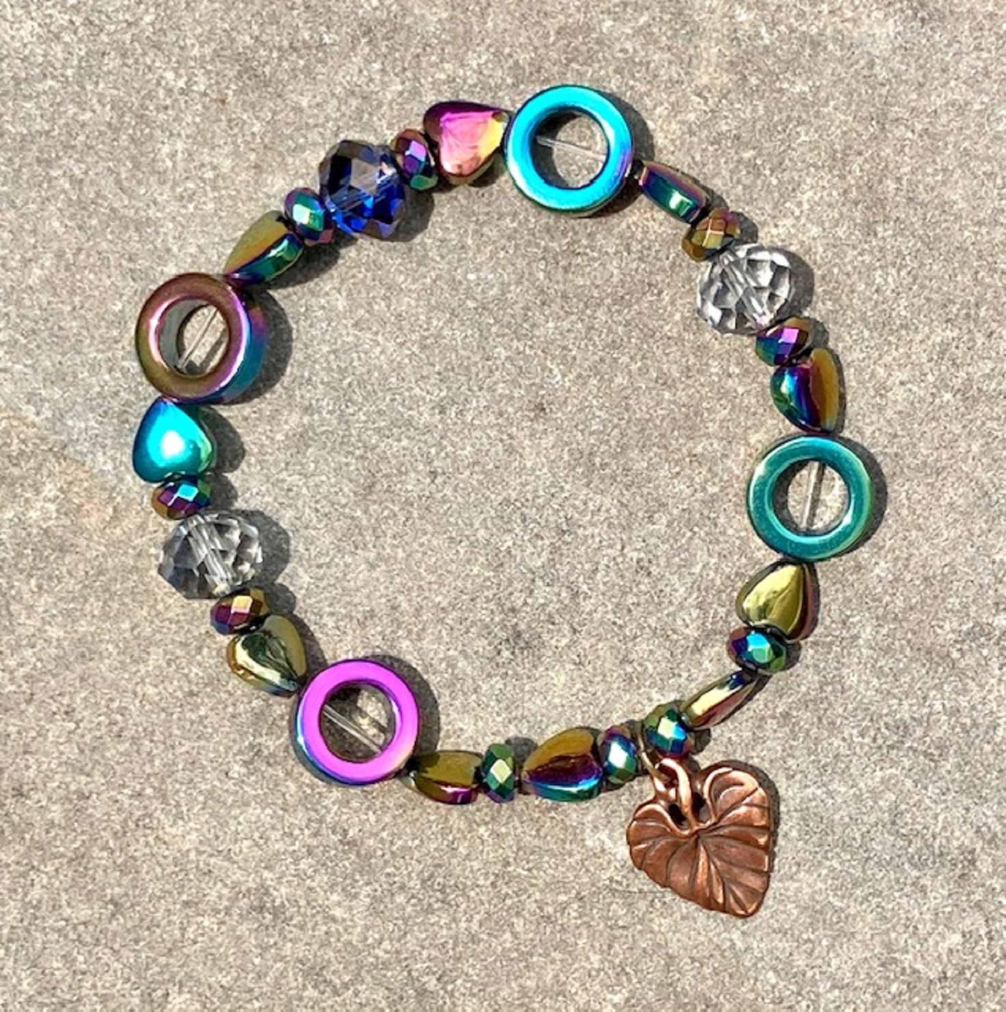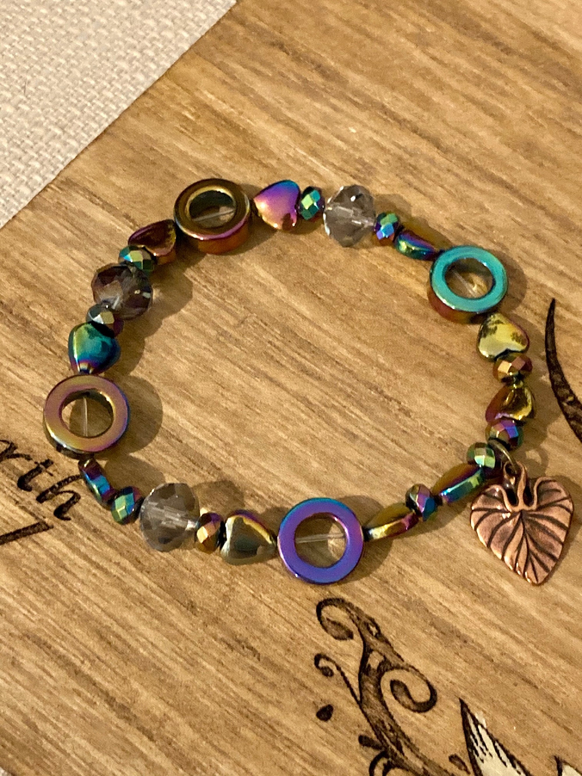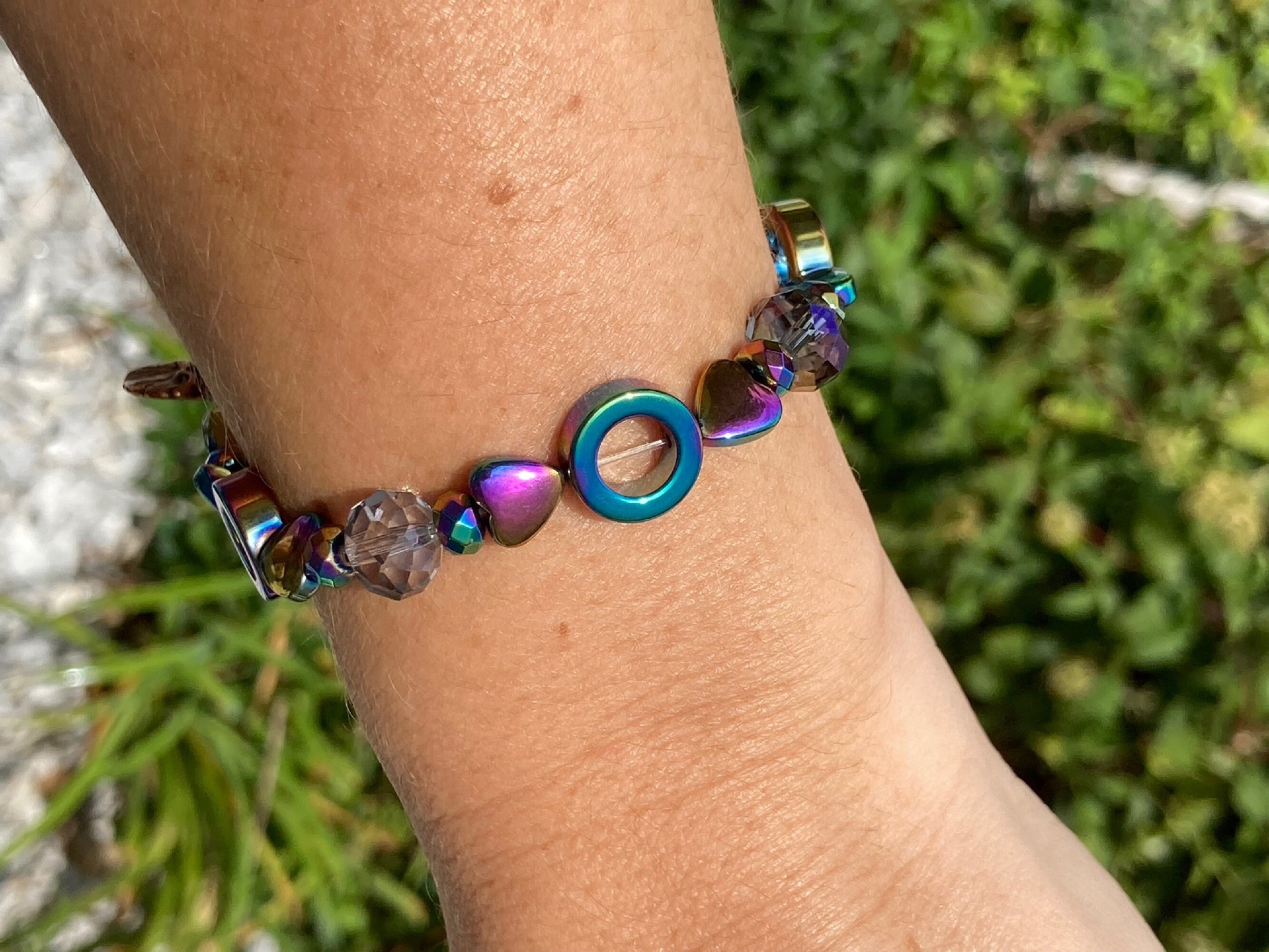 These are stunning and shimmery, Titanium Rainbow Hematite Gemstone beaded stretch bracelets. They have gorgeous rainbow beads of rim halos, love hearts, and faceted crystals.