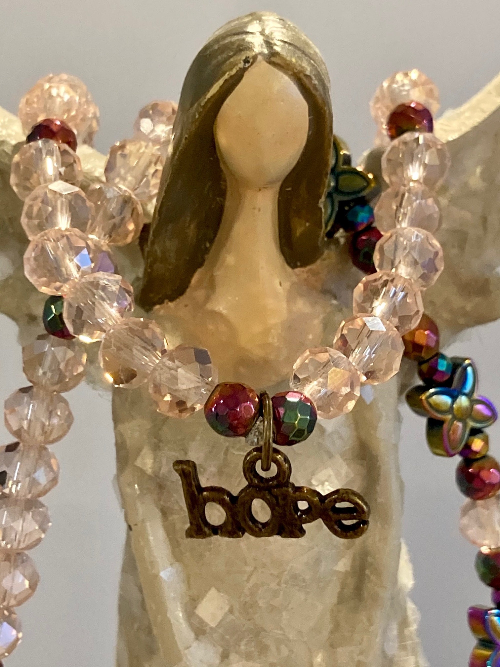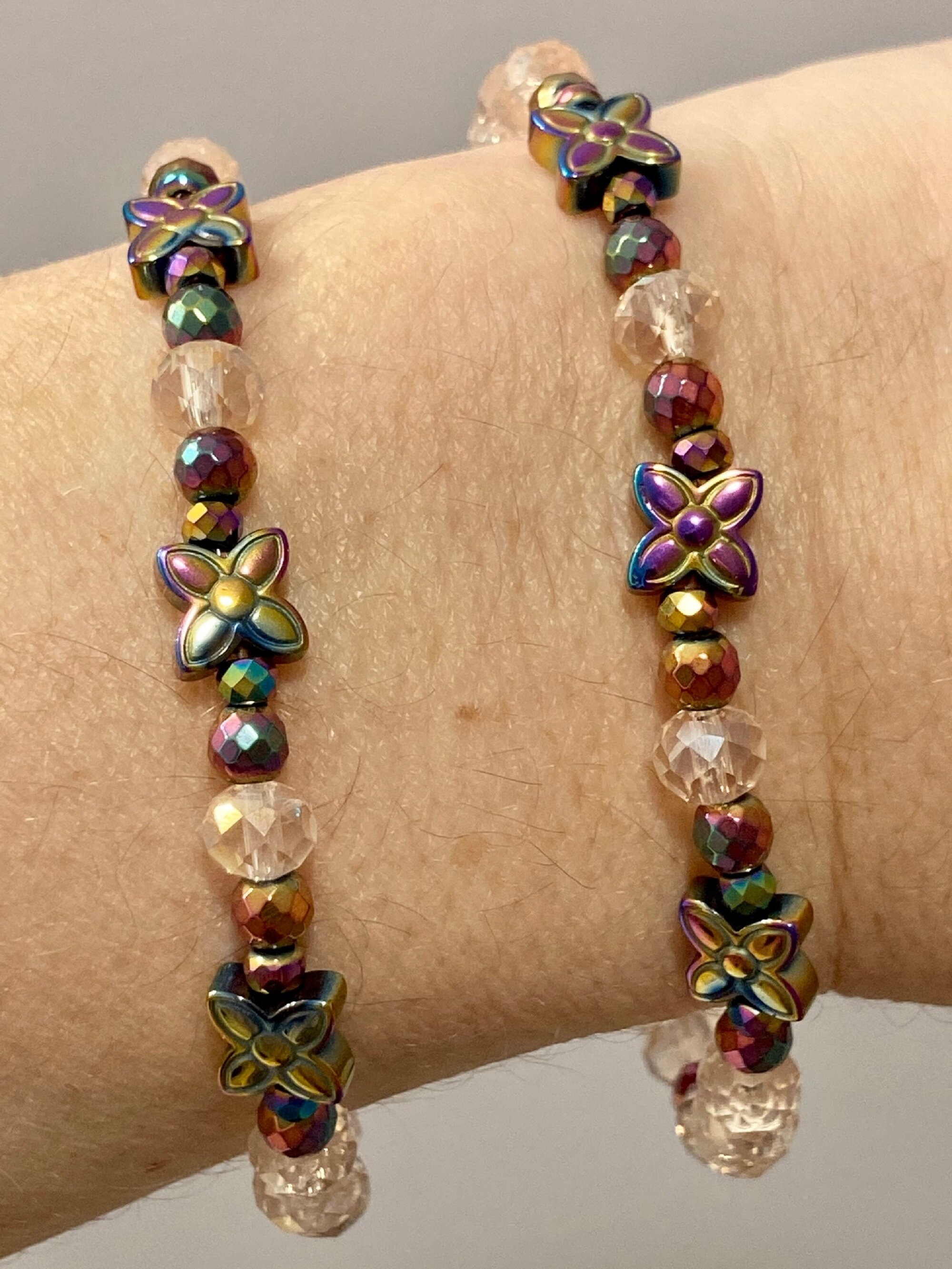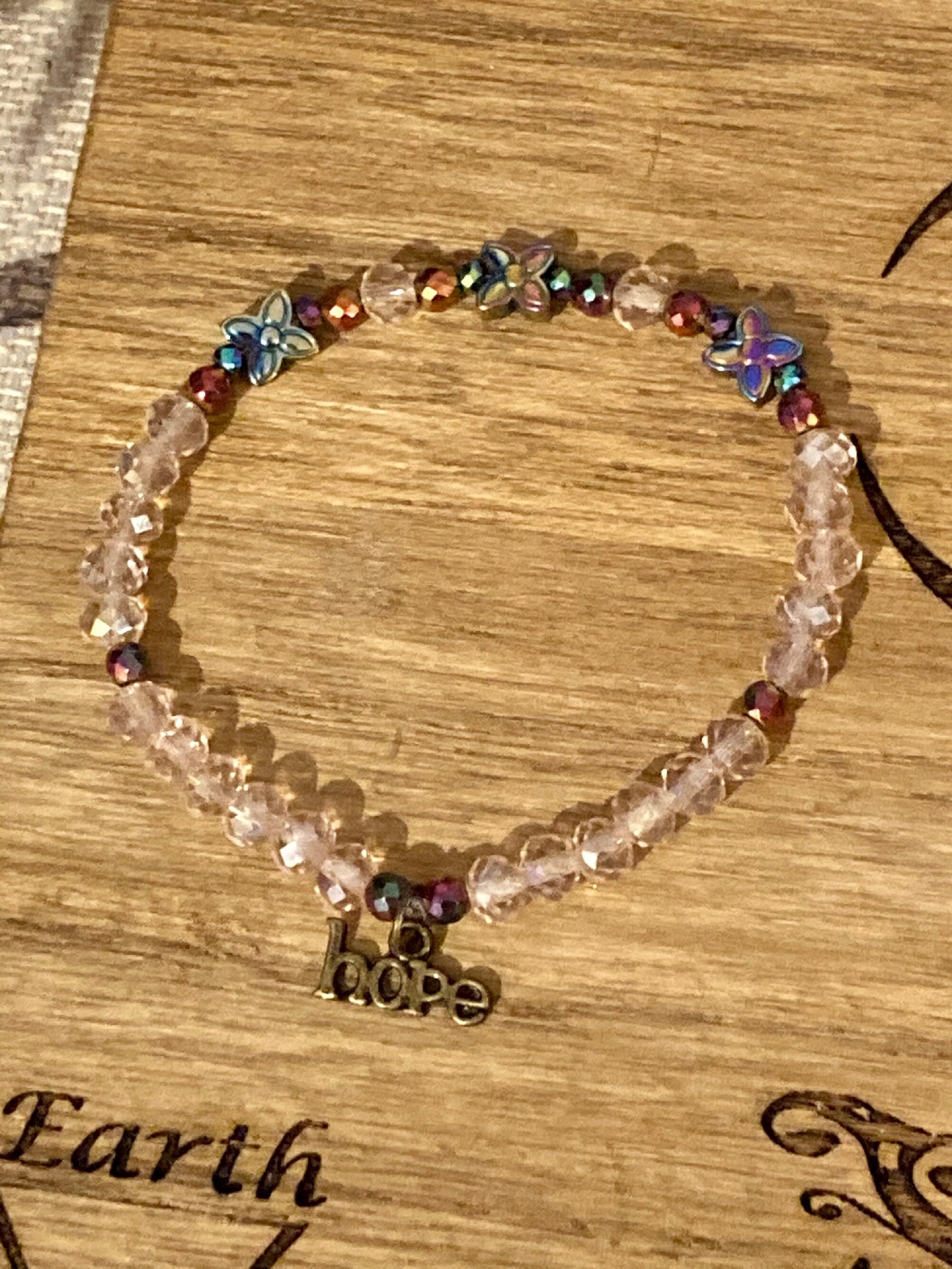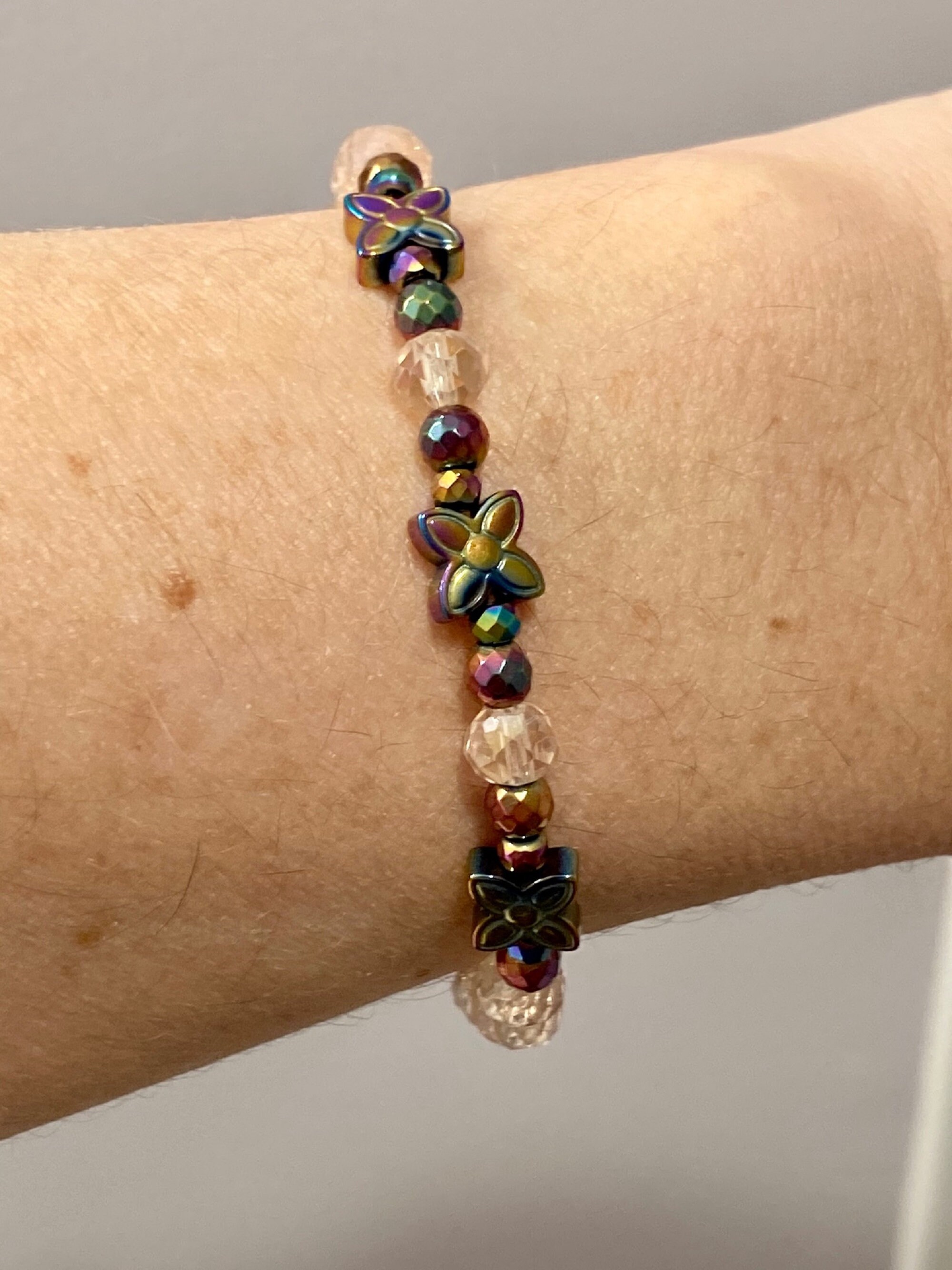 This is a beautiful Crystal and Titanium Rainbow Hematite beaded gemstone stretch bracelet. The accent micro faceted Rainbow Hematite Gemstones have a pretty sparkle. They are both rainbow and a rosy pink color. The crystal beads are a sweet, pale pink. There are three Titanium Rainbow Hematite Flower Butterfly Gemstones. The back of each bracelet has an antique bronze hope charm.
