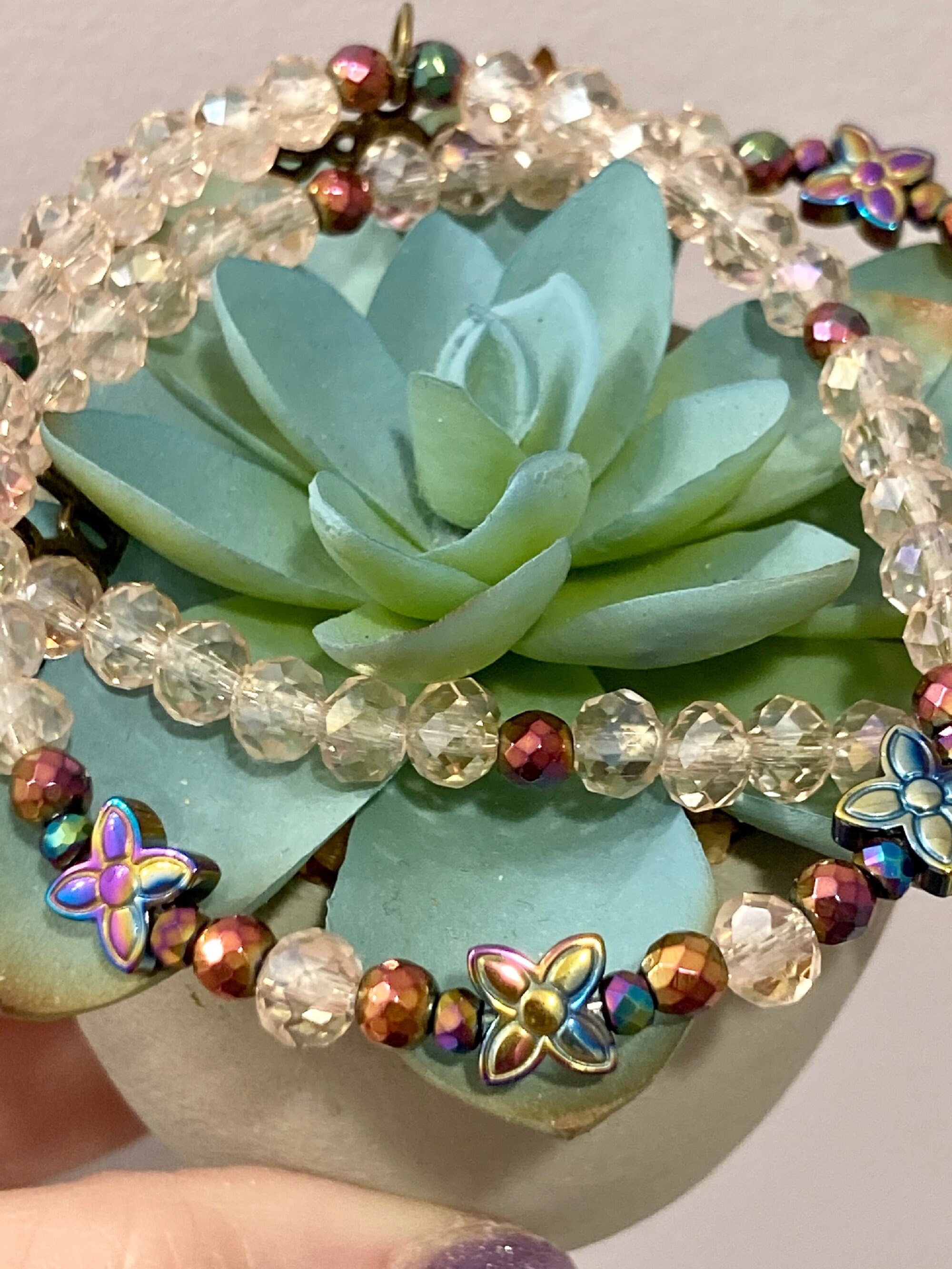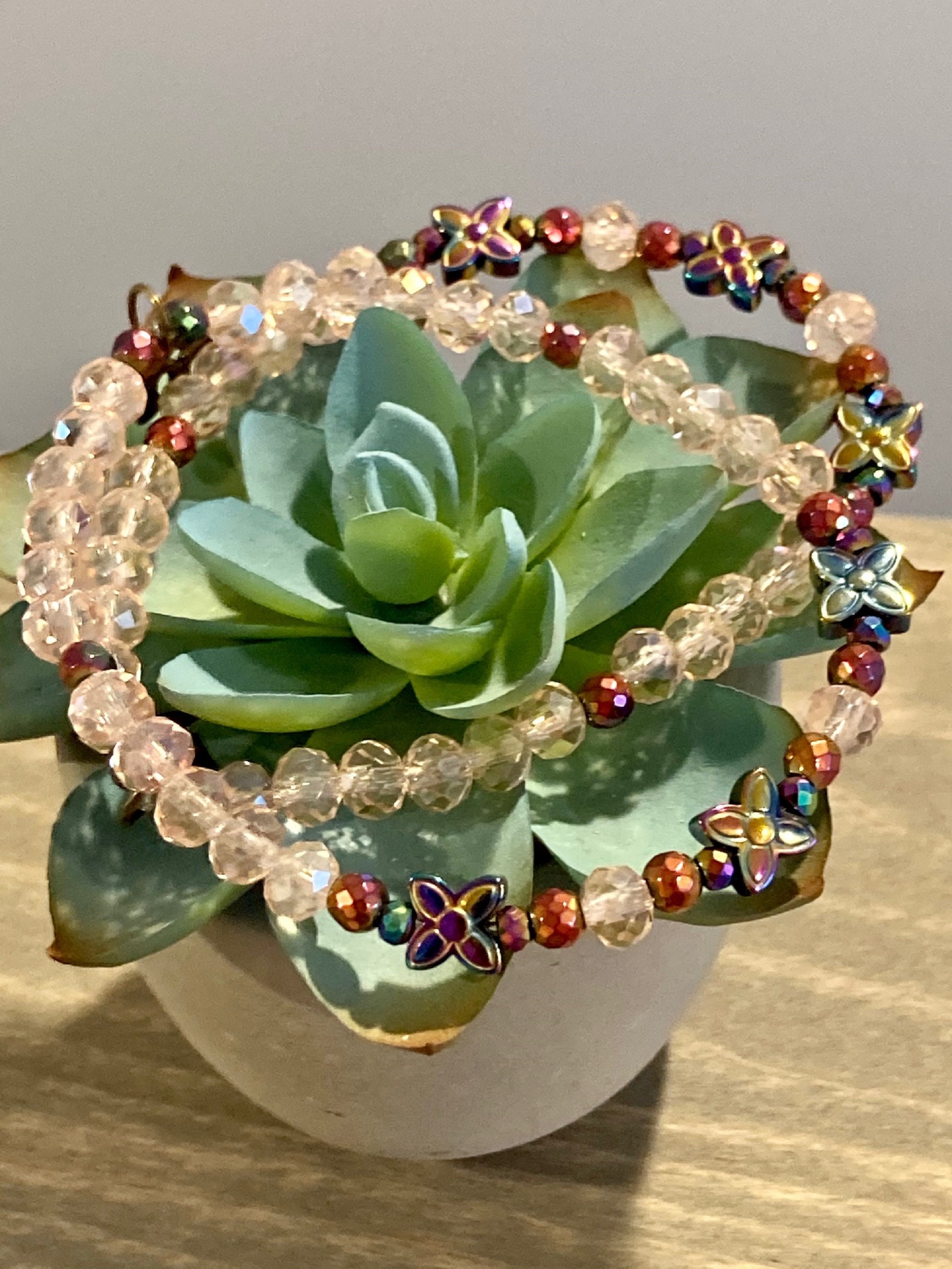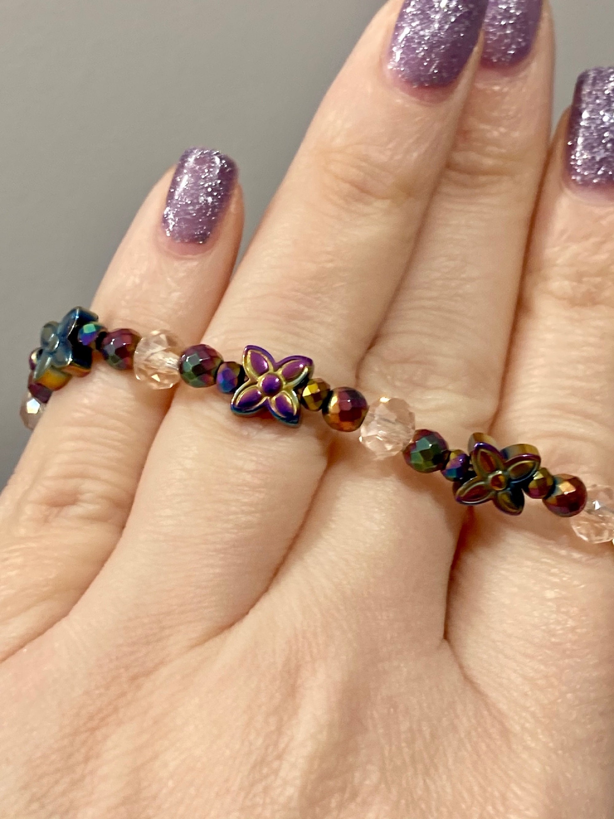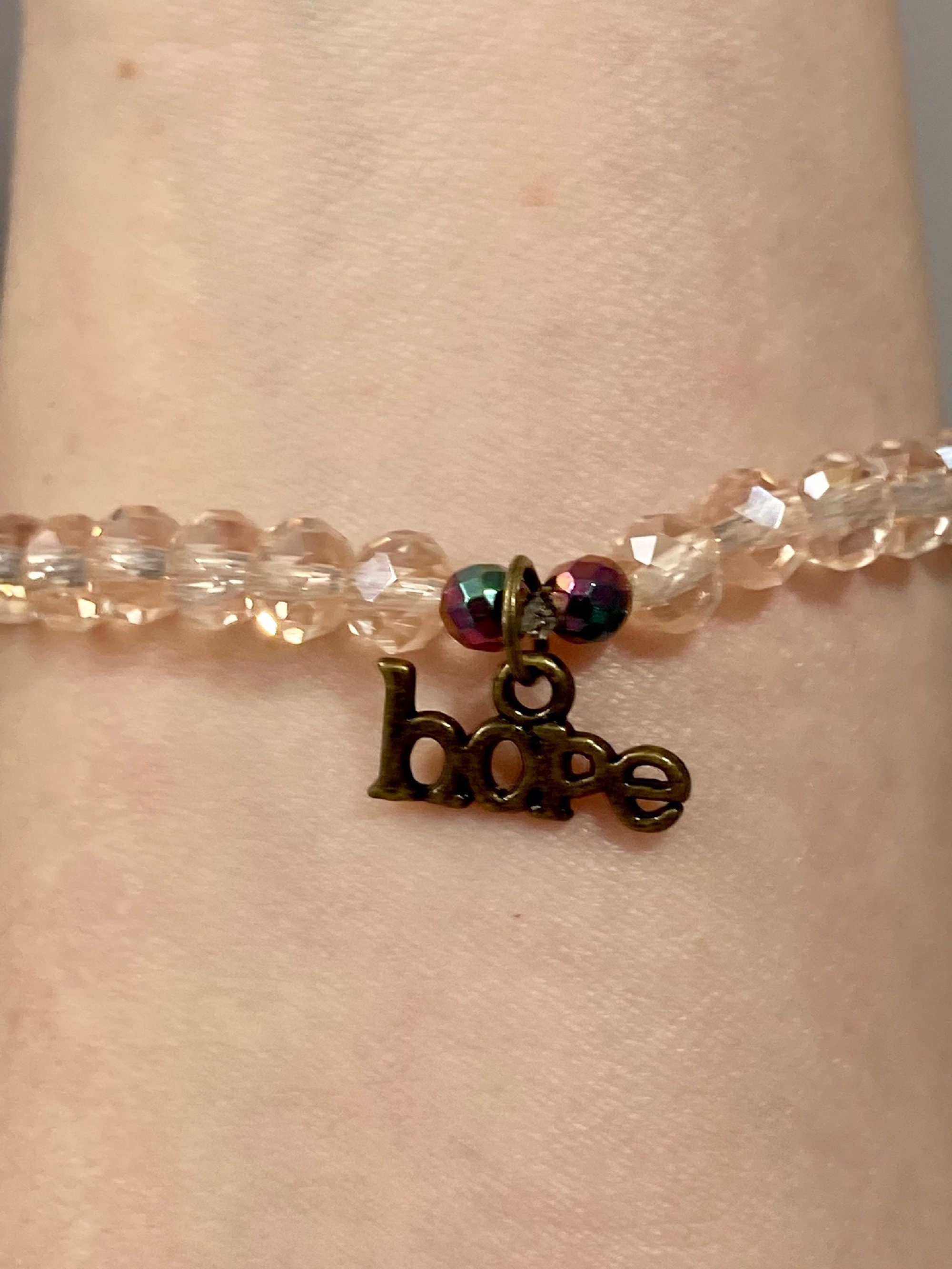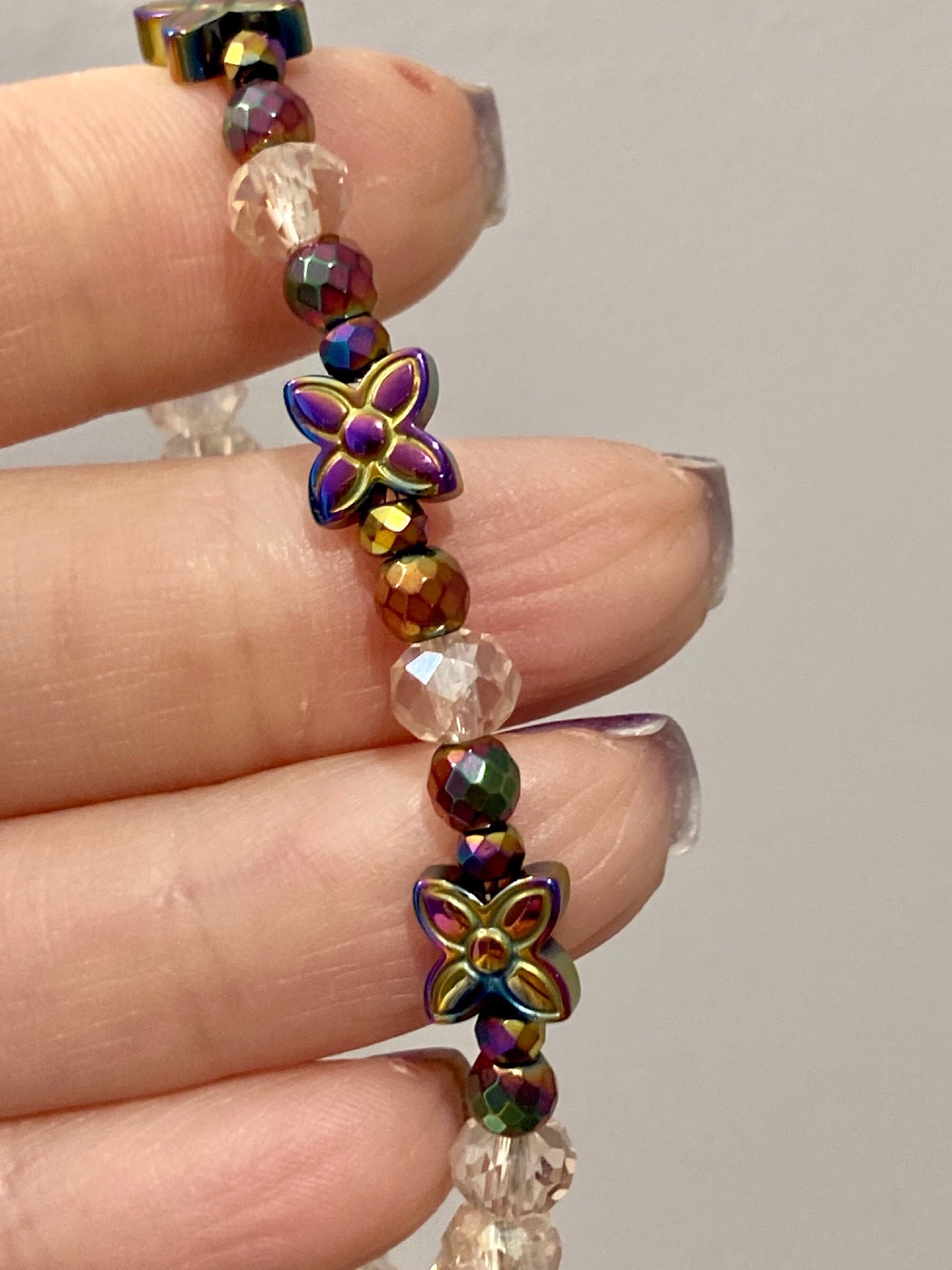 This is a beautiful Crystal and Titanium Rainbow Hematite beaded gemstone stretch bracelet. The accent micro faceted Rainbow Hematite Gemstones have a pretty sparkle. They are both rainbow and a rosy pink color. The crystal beads are a sweet, pale pink. There are three Titanium Rainbow Hematite Flower Butterfly Gemstones. The back of each bracelet has an antique bronze hope charm.
